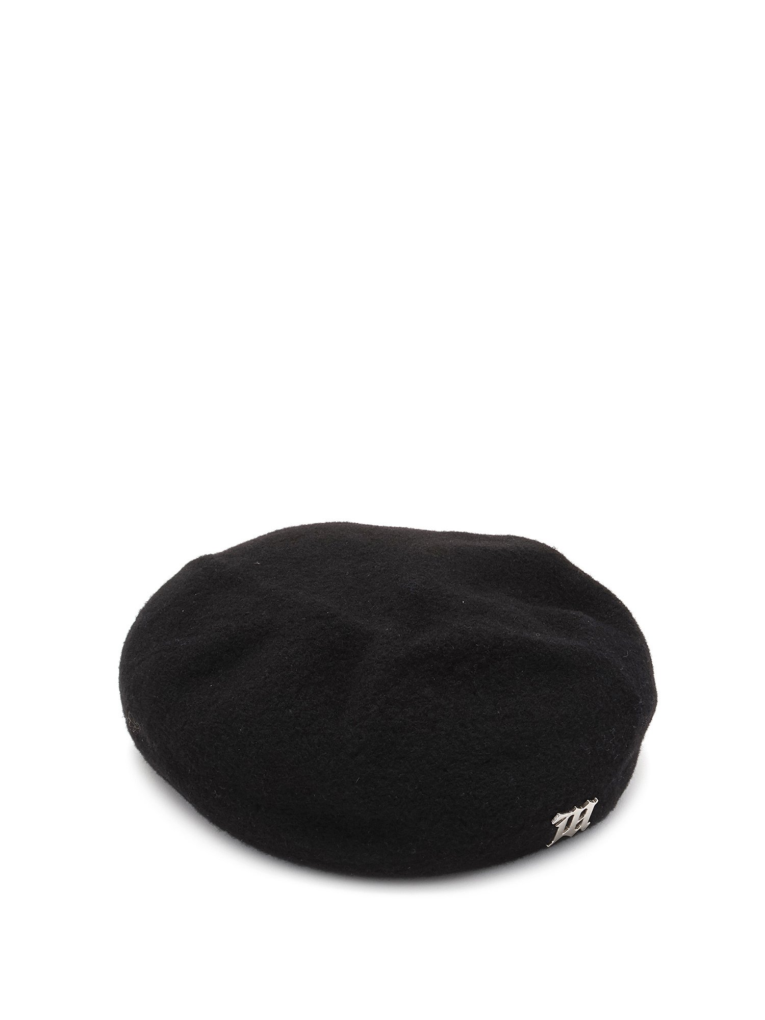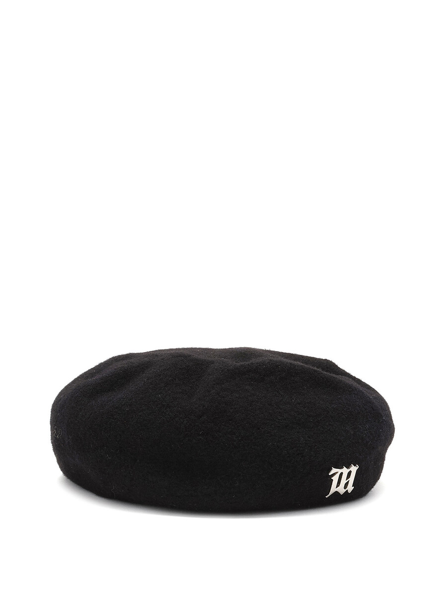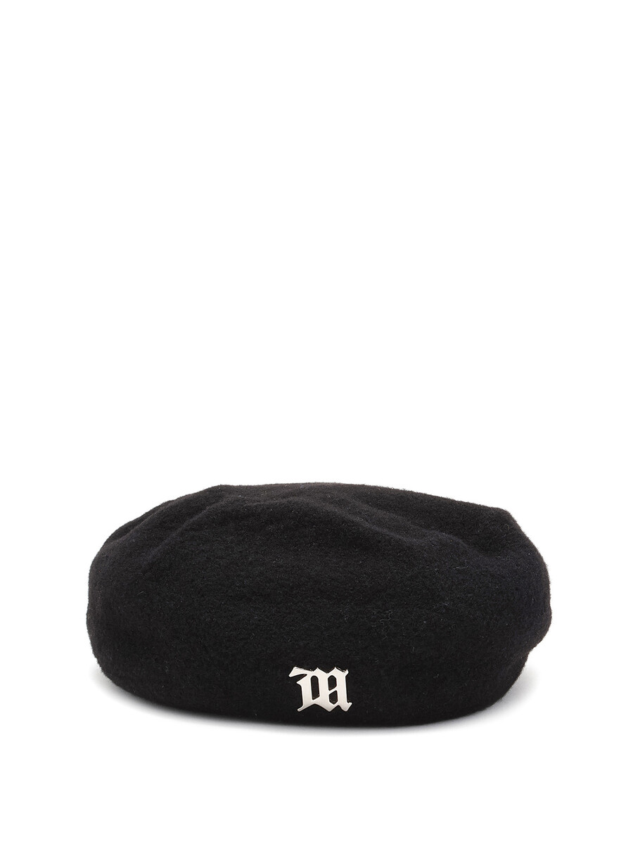 Black wool beret featuring a silver-tone logo on the front. Classic silhouette with a soft, textured finish.