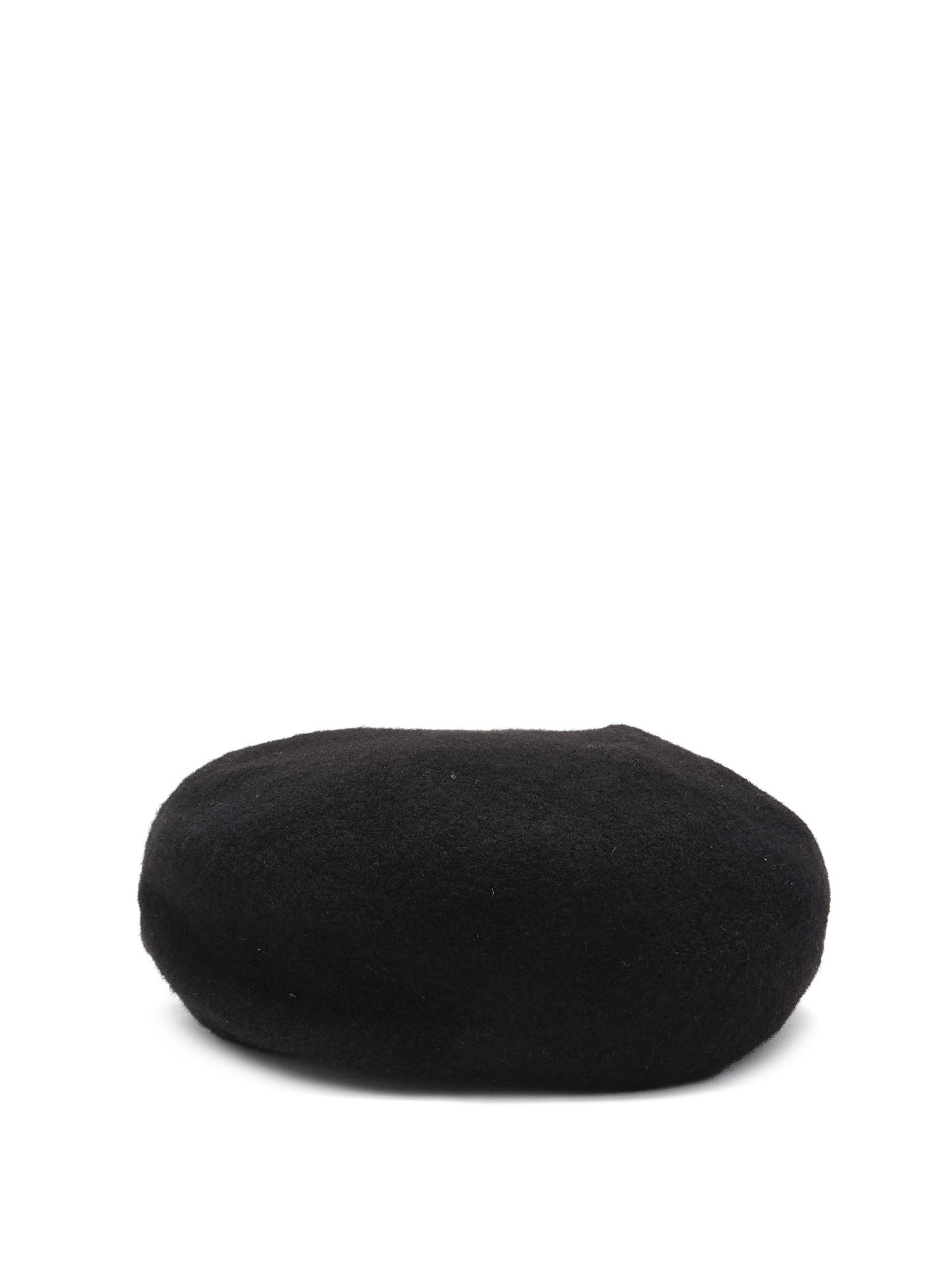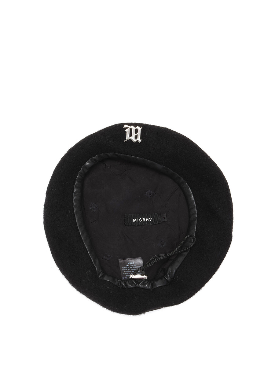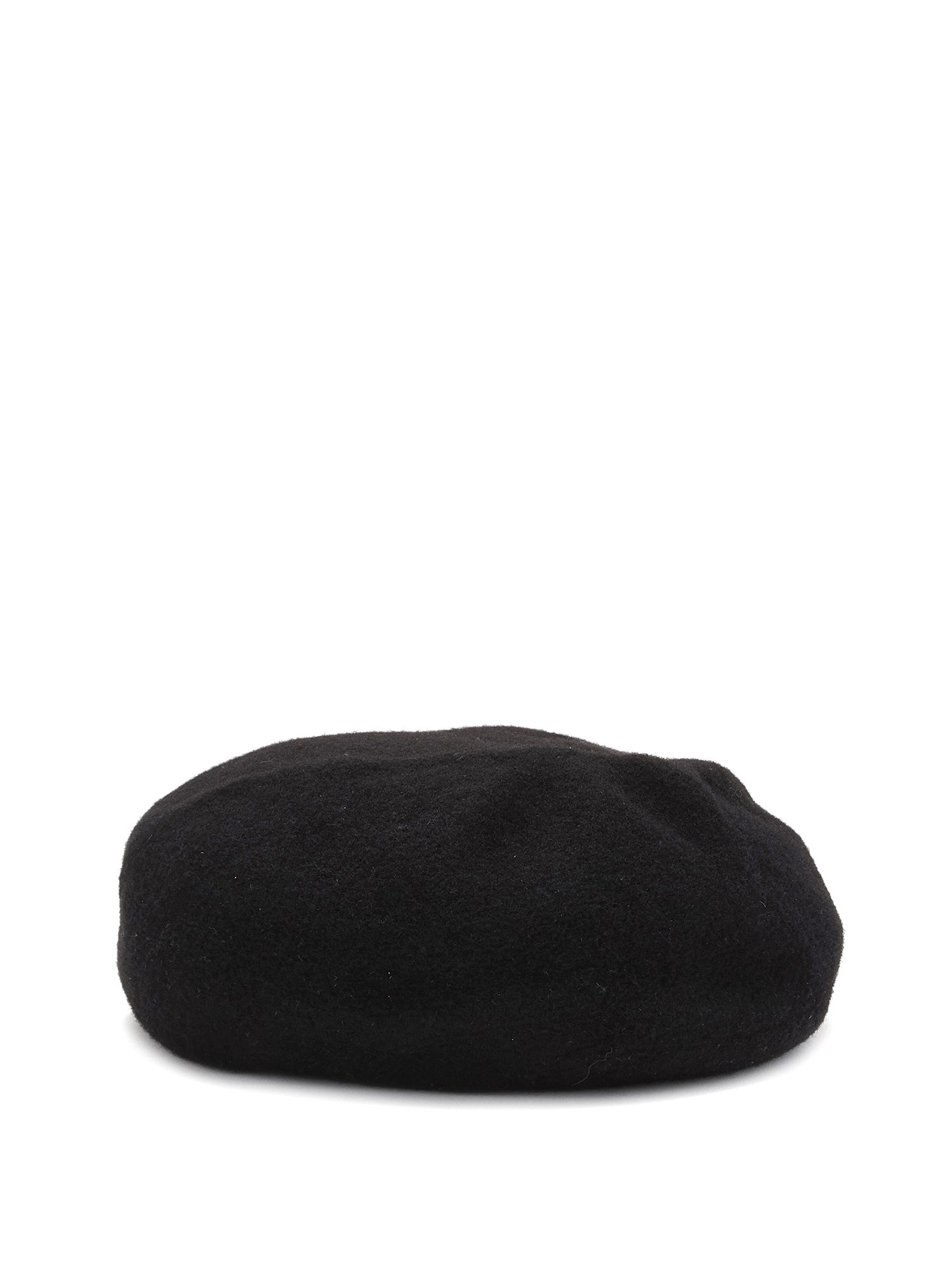 Black wool beret featuring a silver-tone logo on the front. Classic silhouette with a soft, textured finish.
