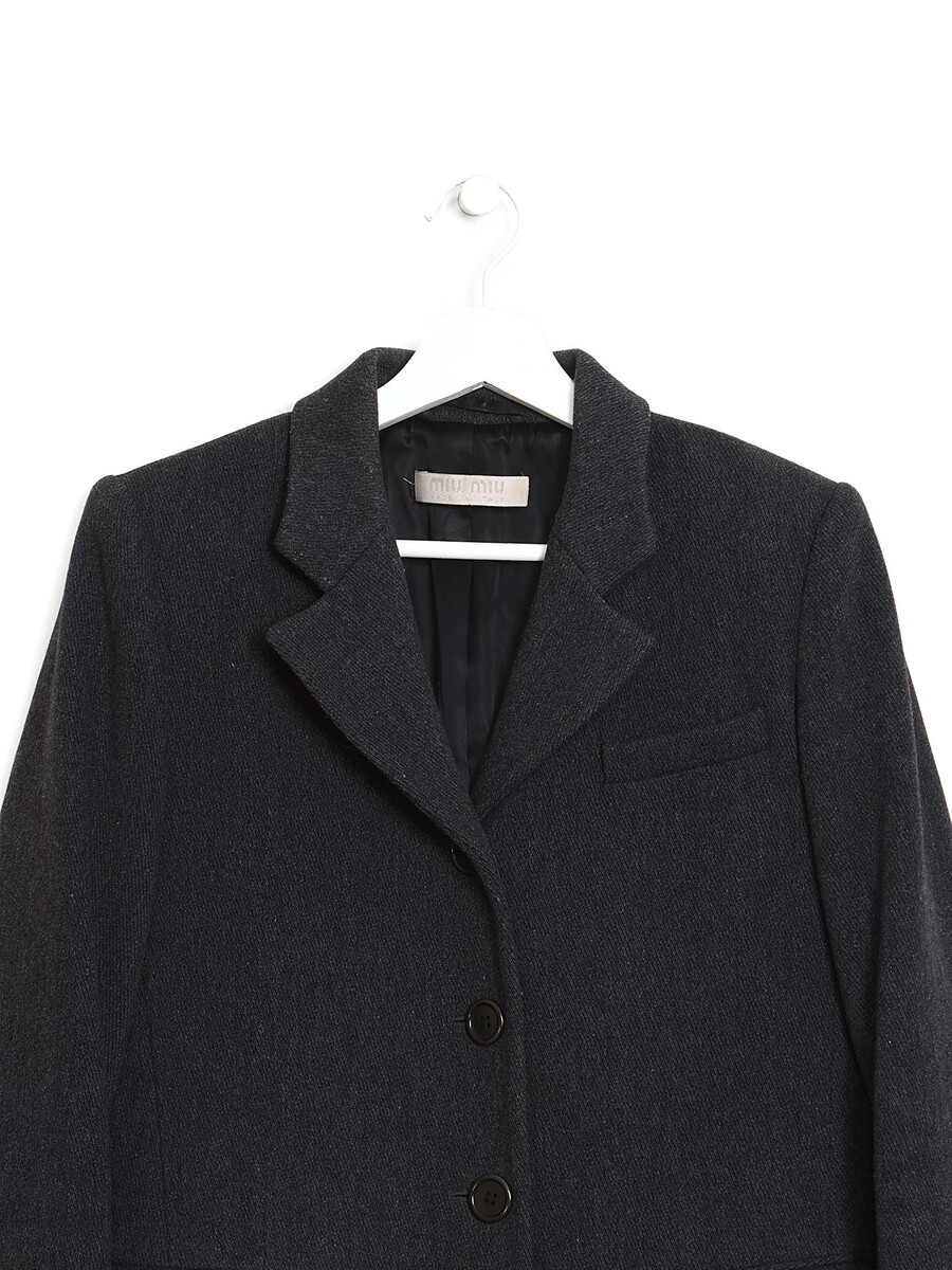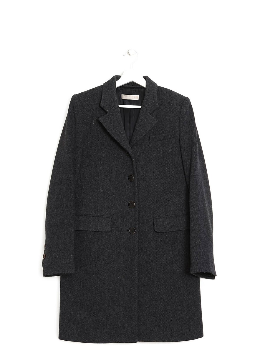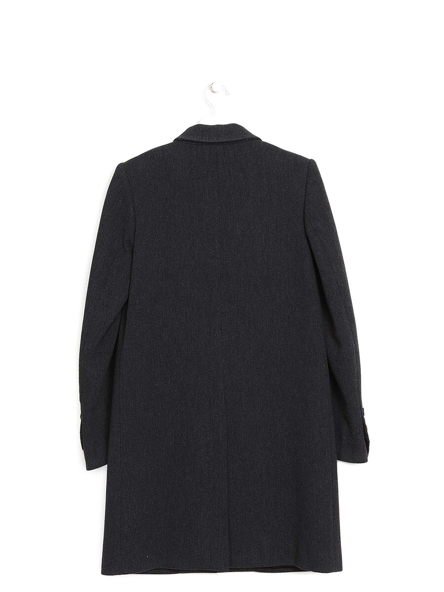 Mid-length wool-blend coat in grey. Long sleeves with button-front closure. Notched lapel collar. Three pocket styling at front.