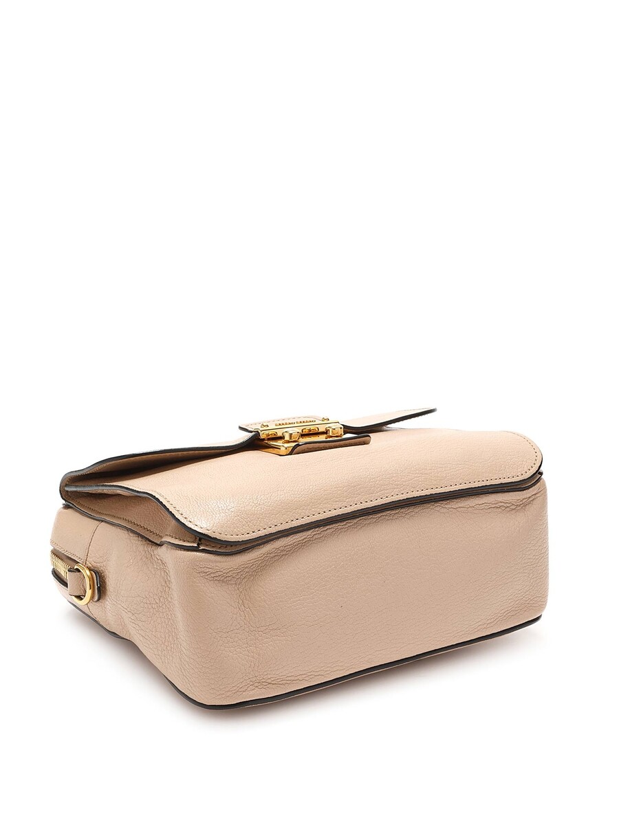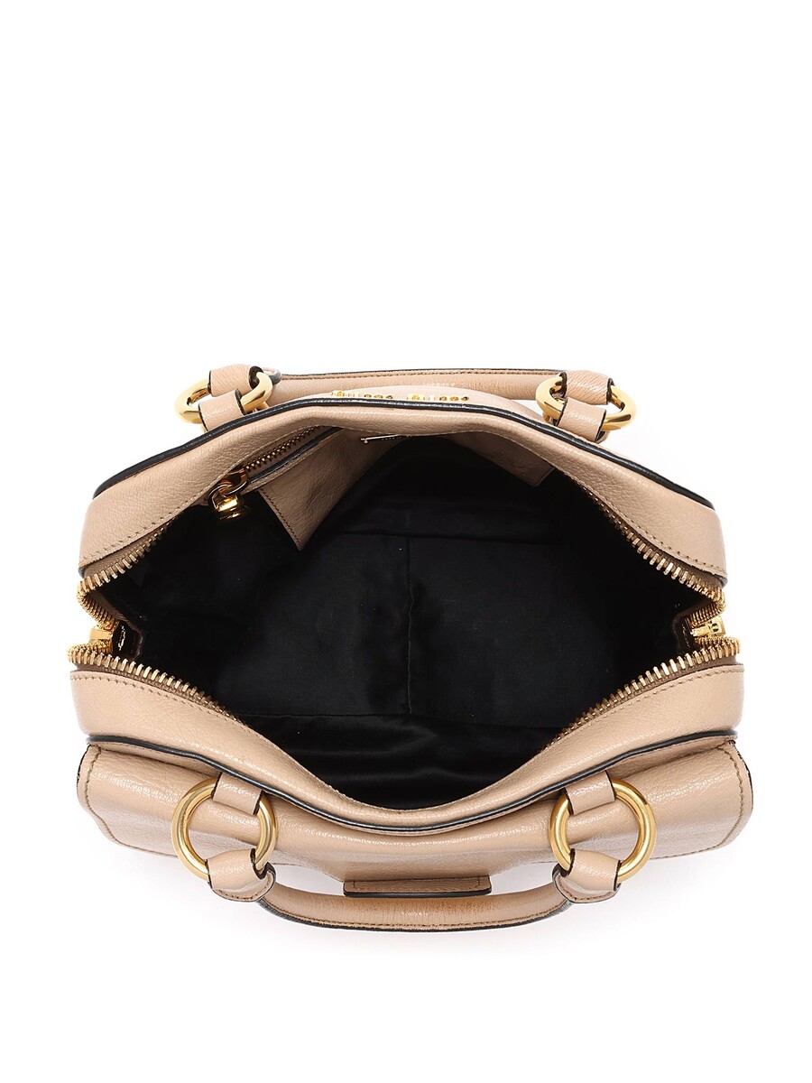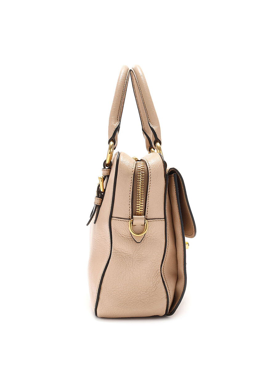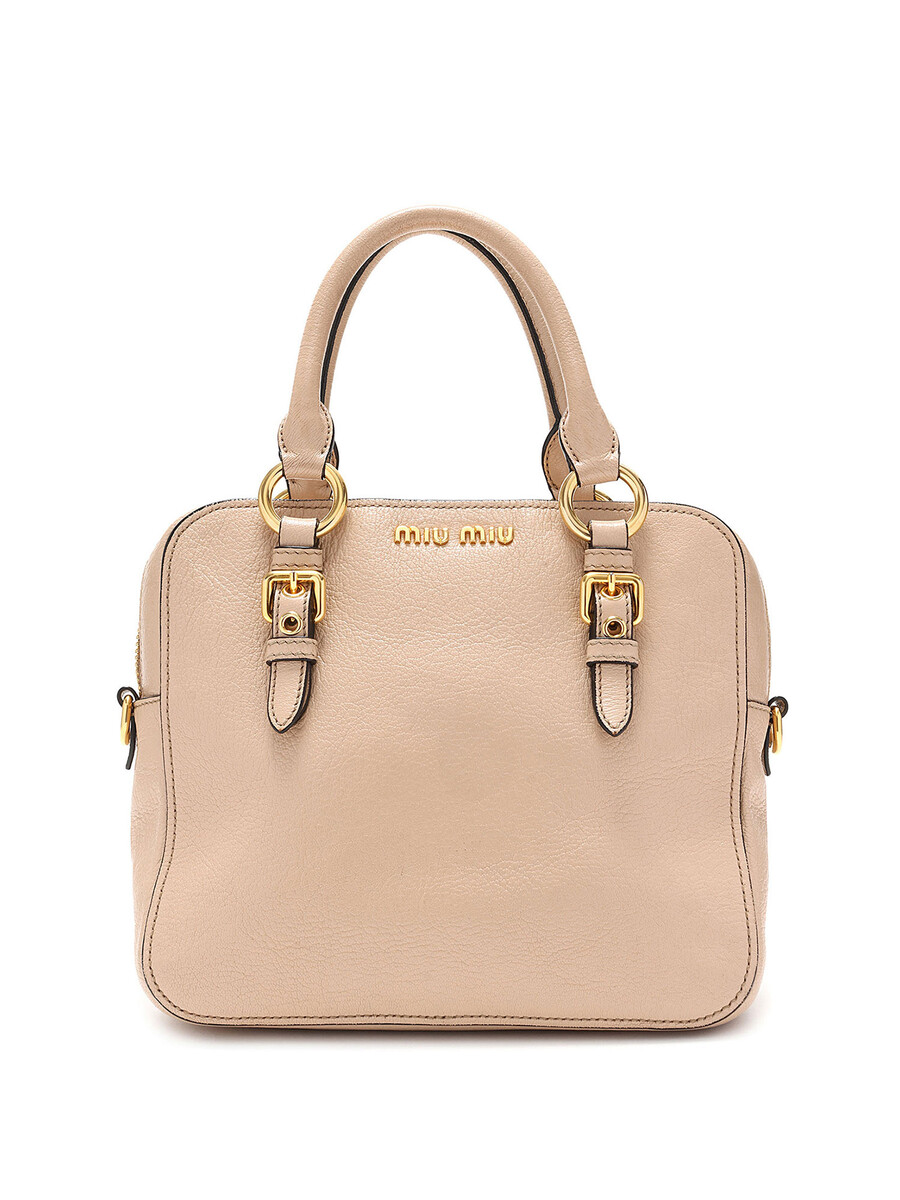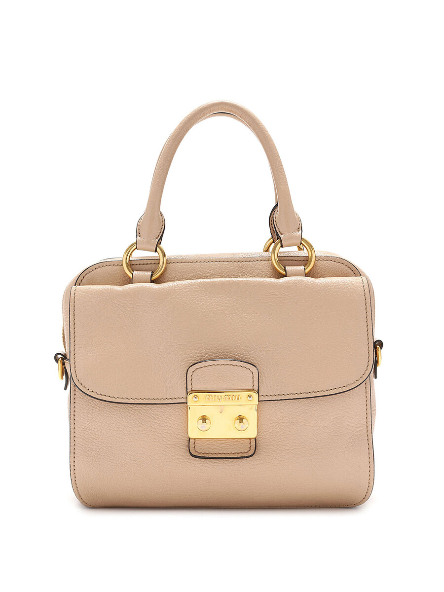 Beige leather handbag featuring a zip closure. Top handles with adjustable and detachable shoulder strap. Gold-tone hardware.