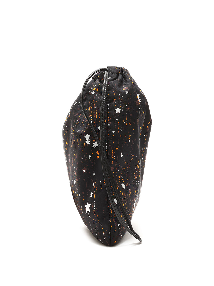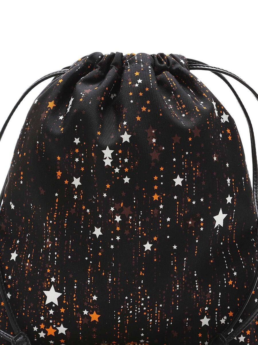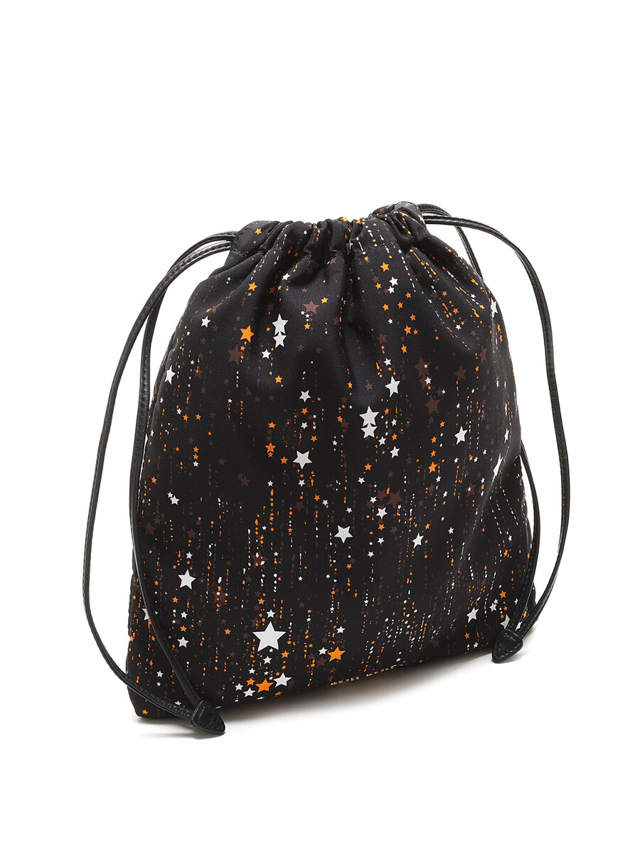 Adjustable drawstring pouch featuring an abstract pattern in black, white, and orange. Compact and versatile for everyday use.