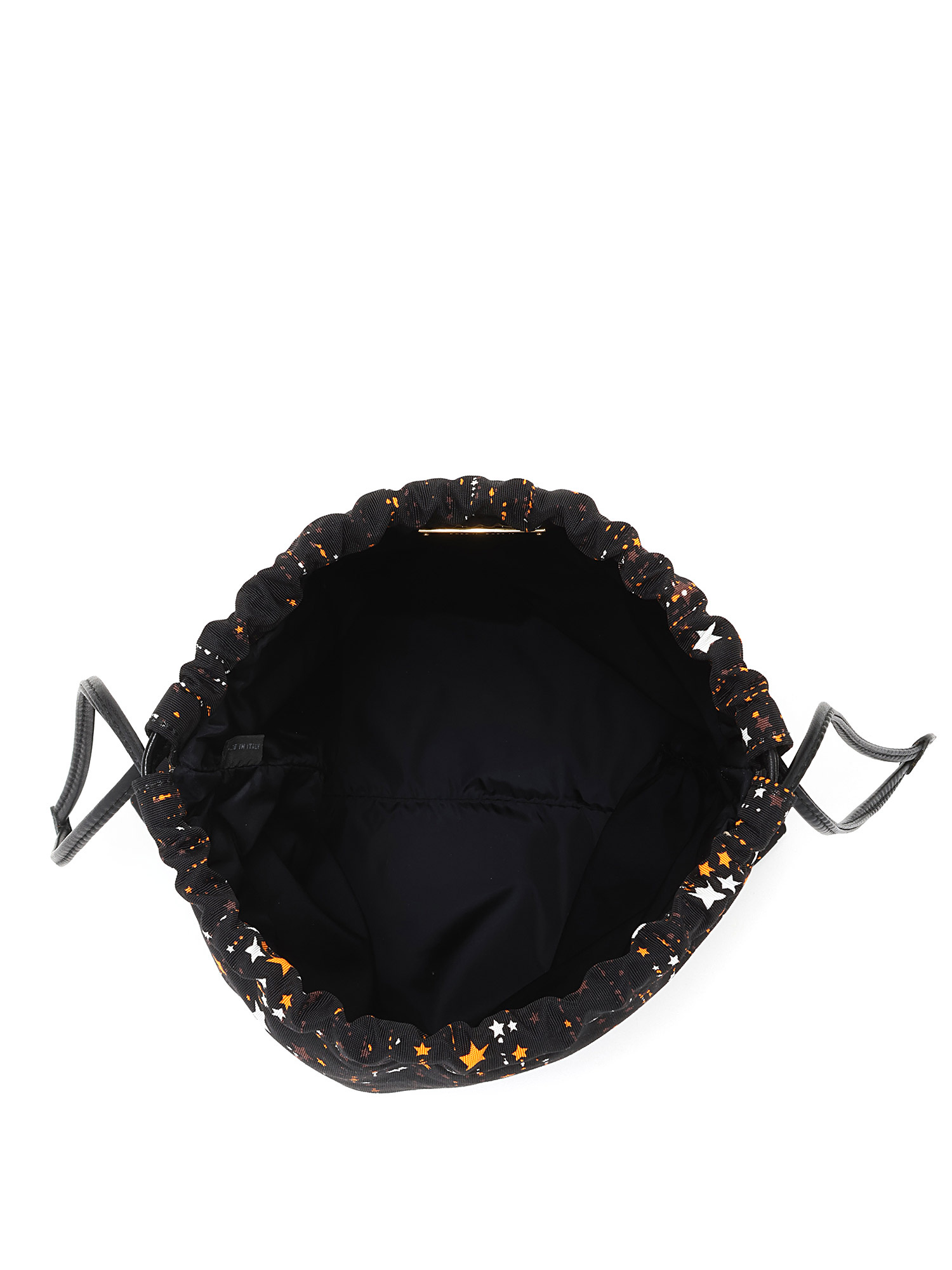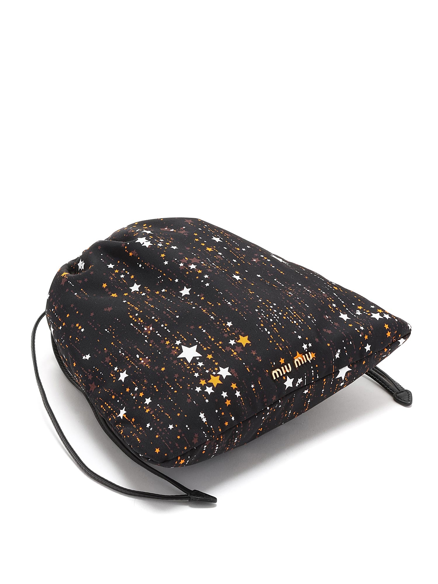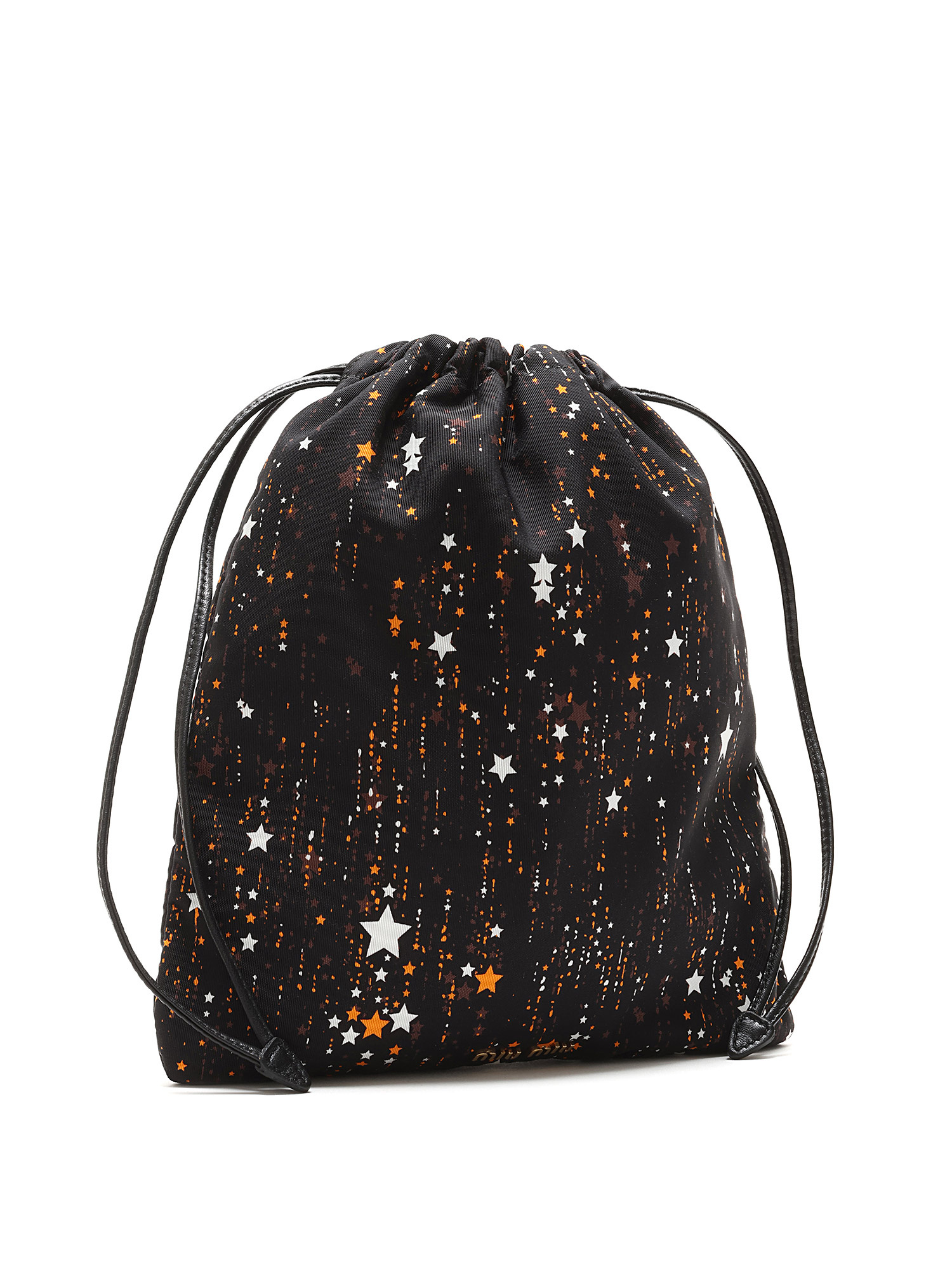Adjustable drawstring pouch featuring an abstract pattern in black, white, and orange. Compact and versatile for everyday use.