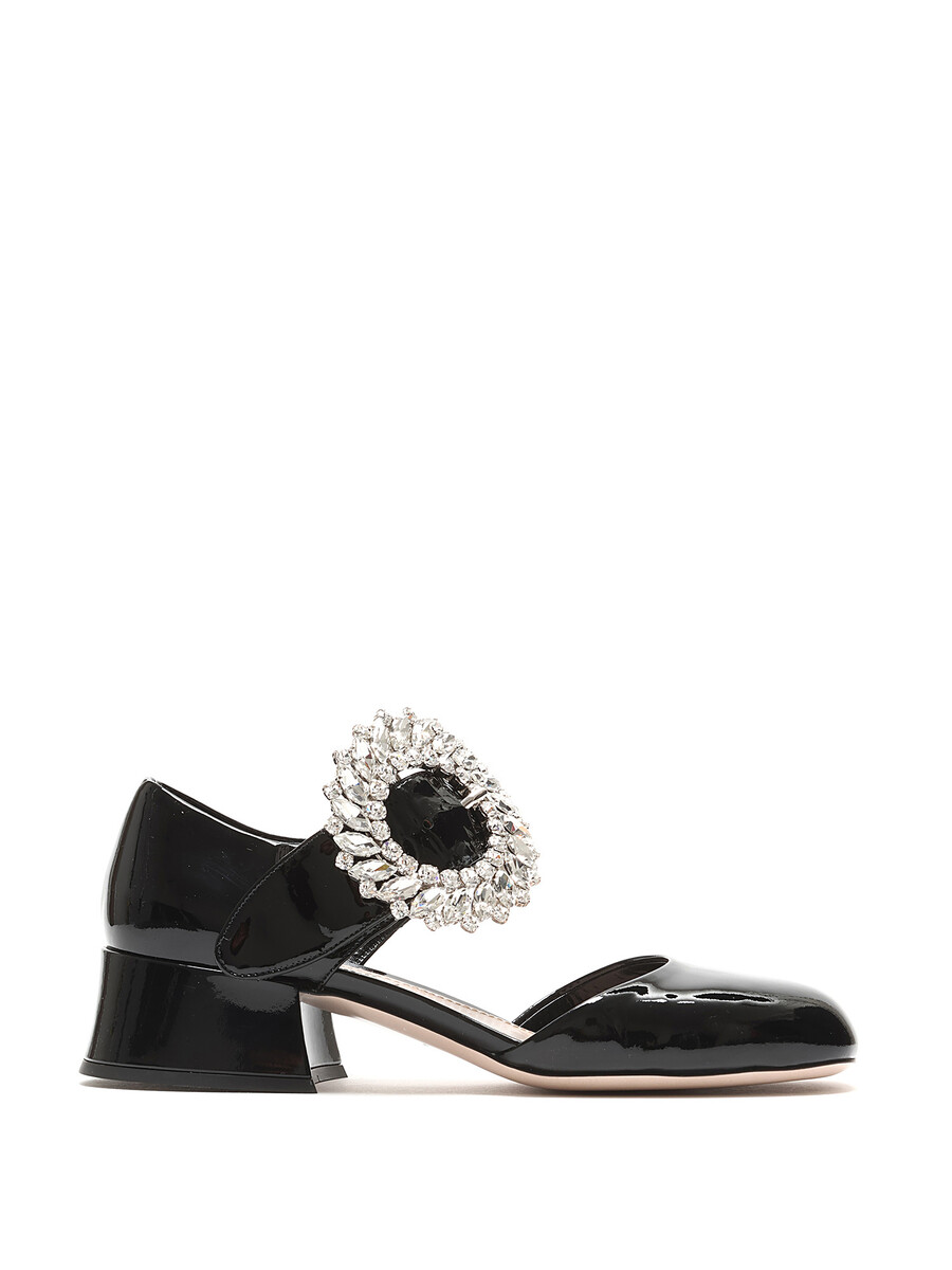 Patent leather square-toe pumps in black. Crystal buckle closure at vamp. Leather sole. With box.