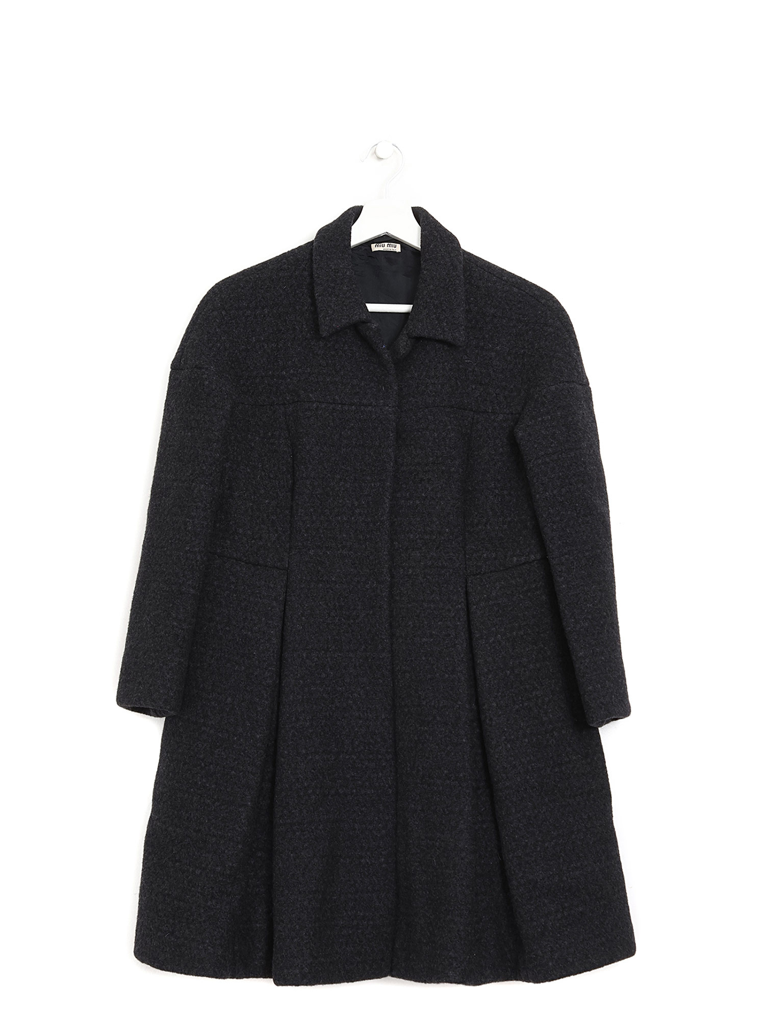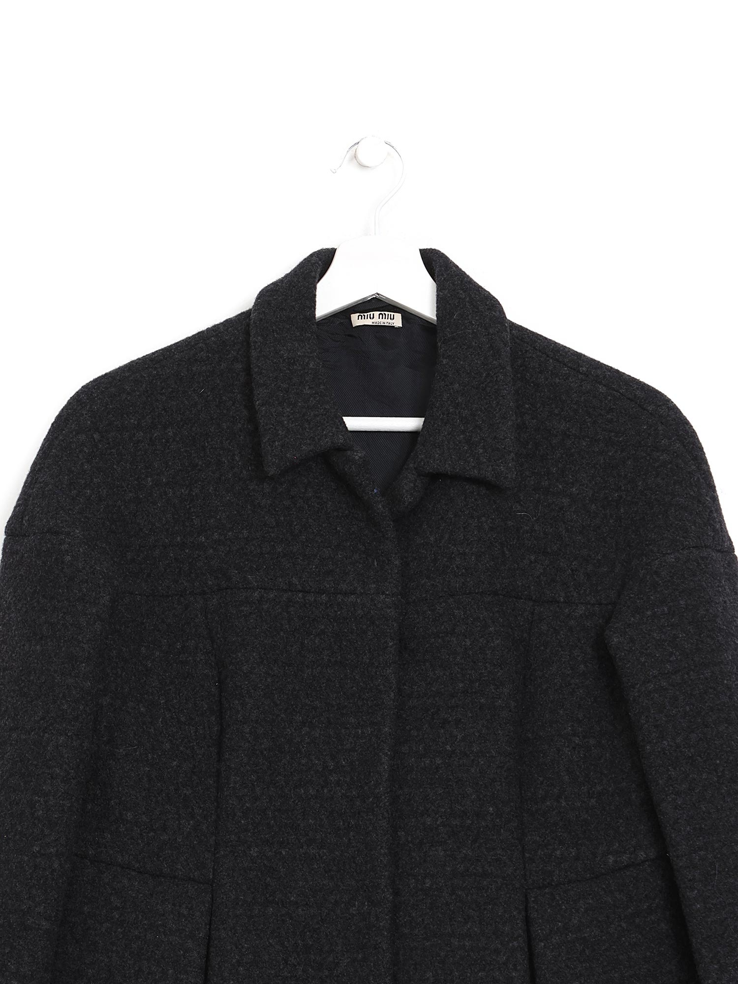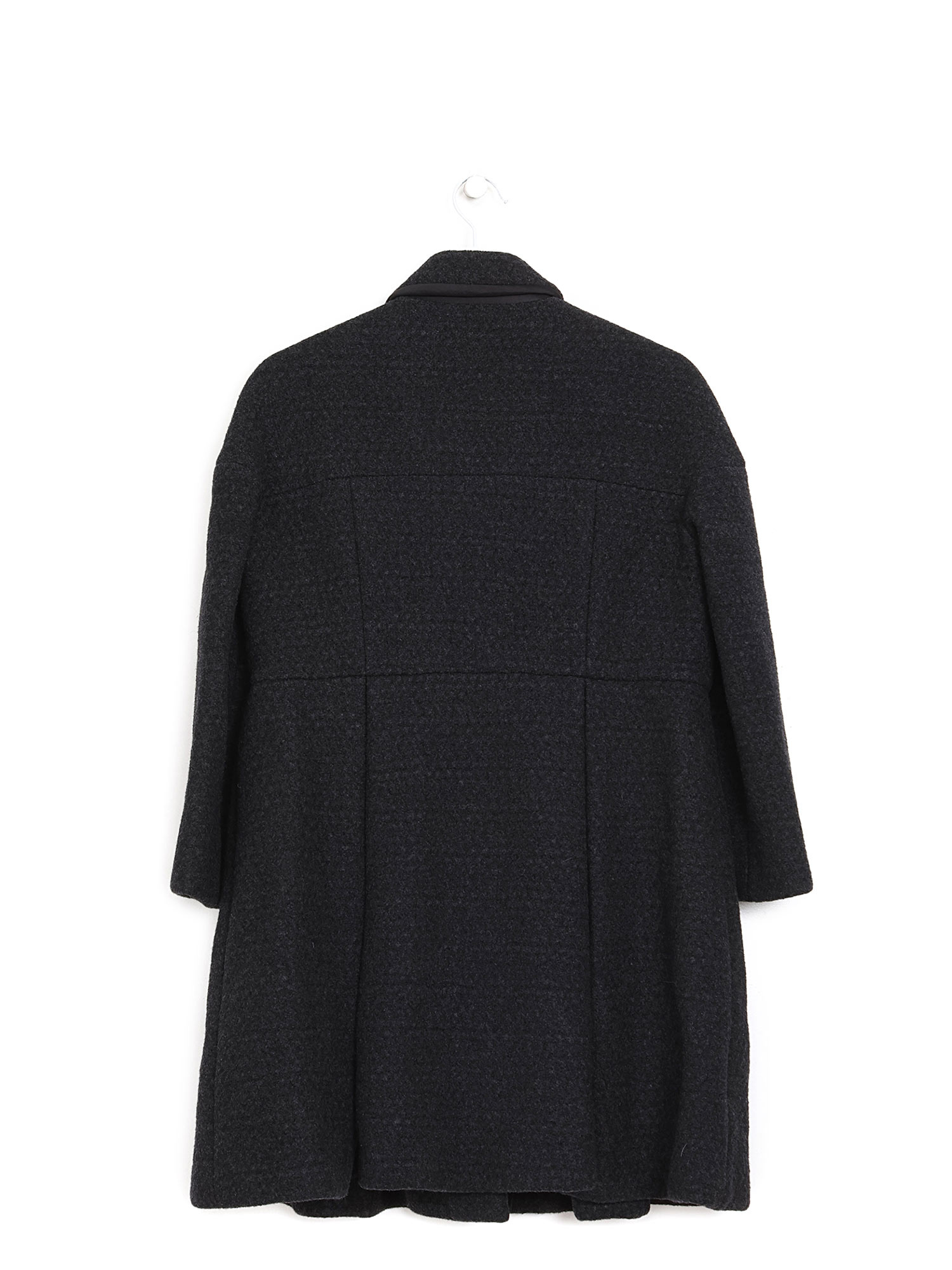 Long sleeve paneled wool coat in gray. Button front closure. Shirt collar.