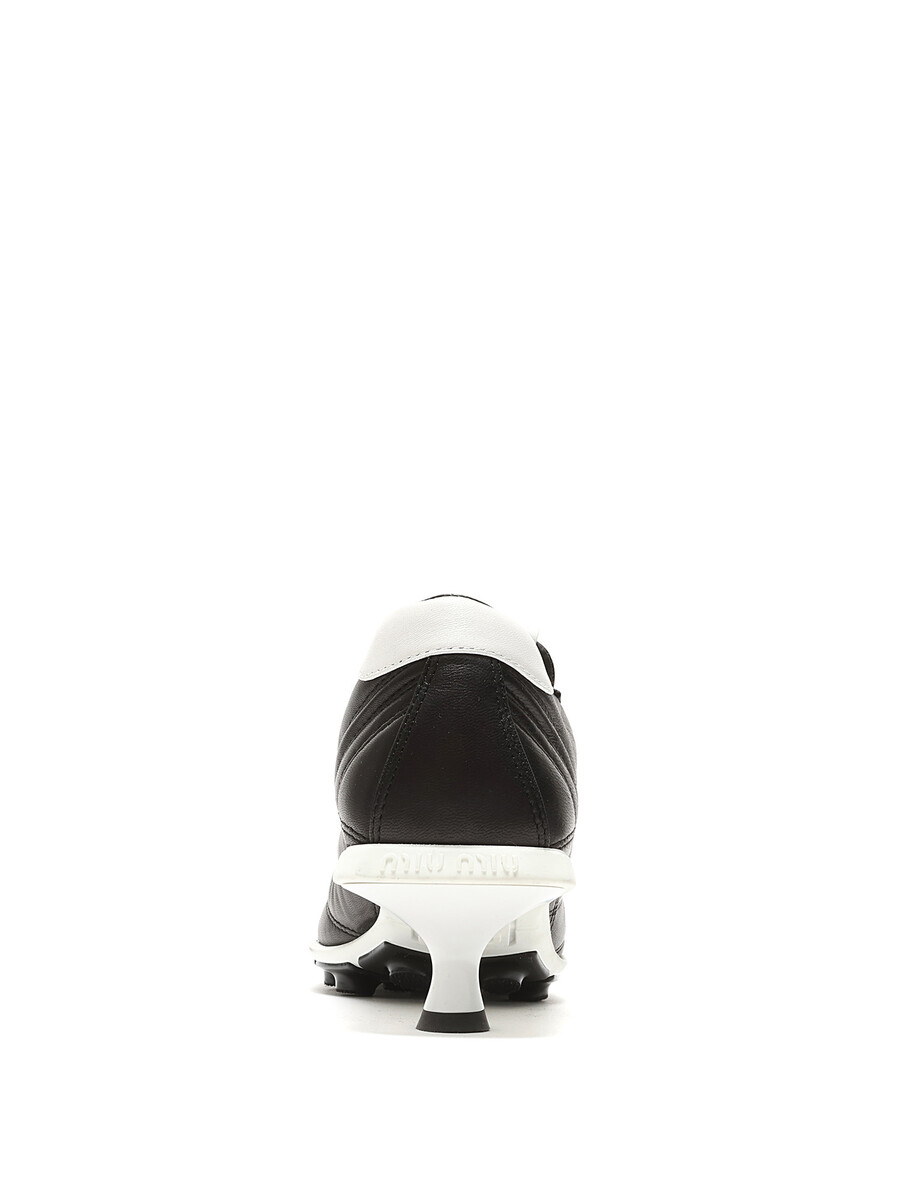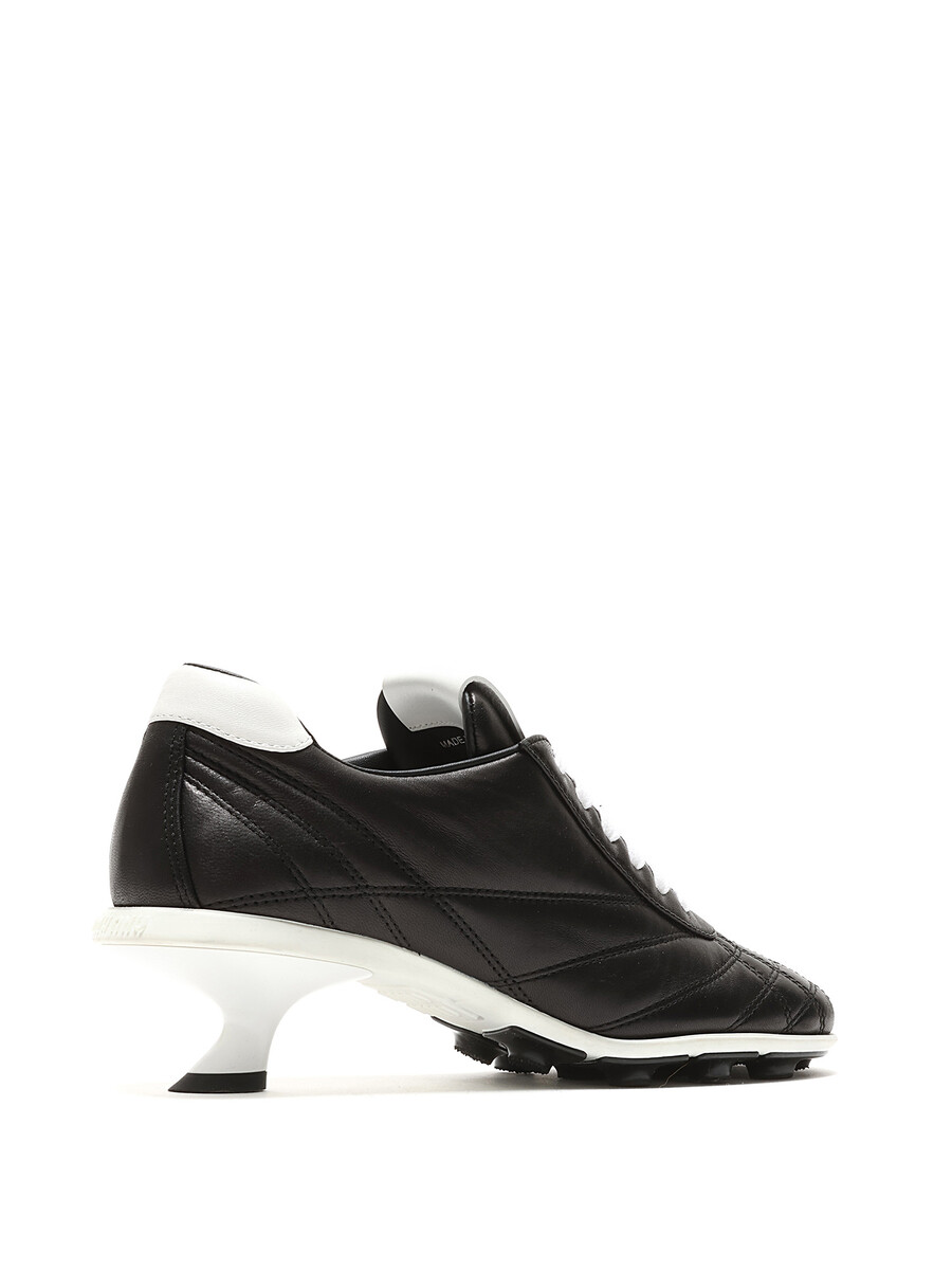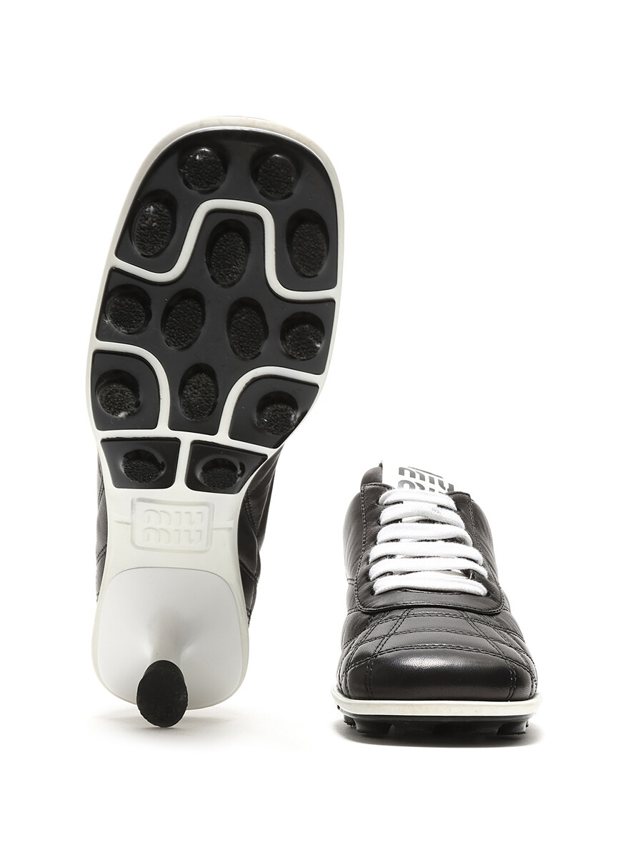 Quilted leather low top sneakers in a chic black and white color scheme. Round toe design with a lace-up closure. Durable rubber sole.