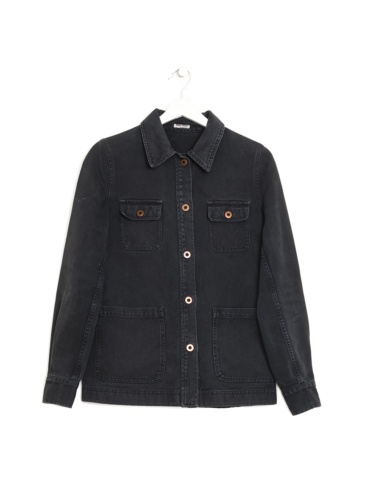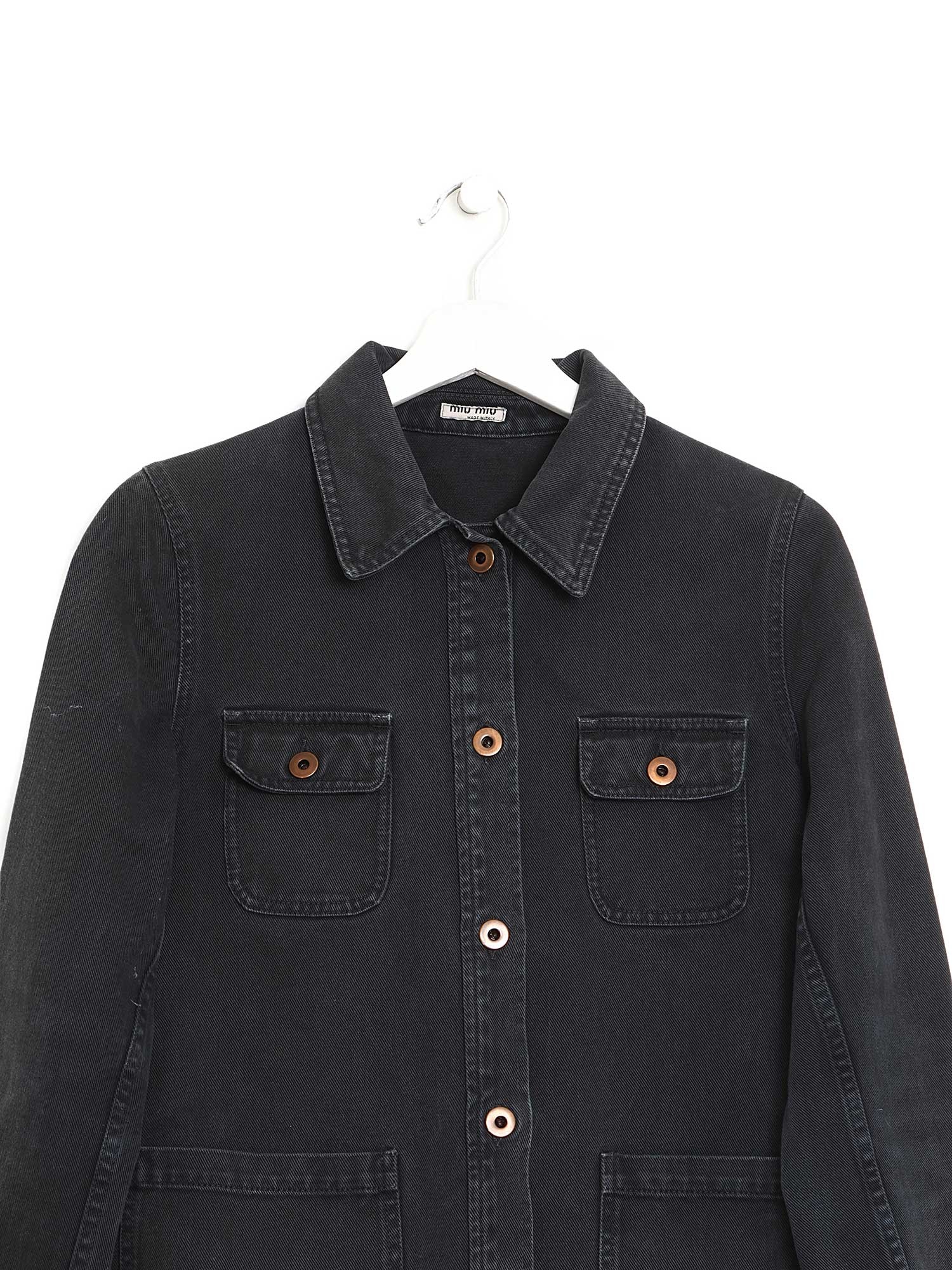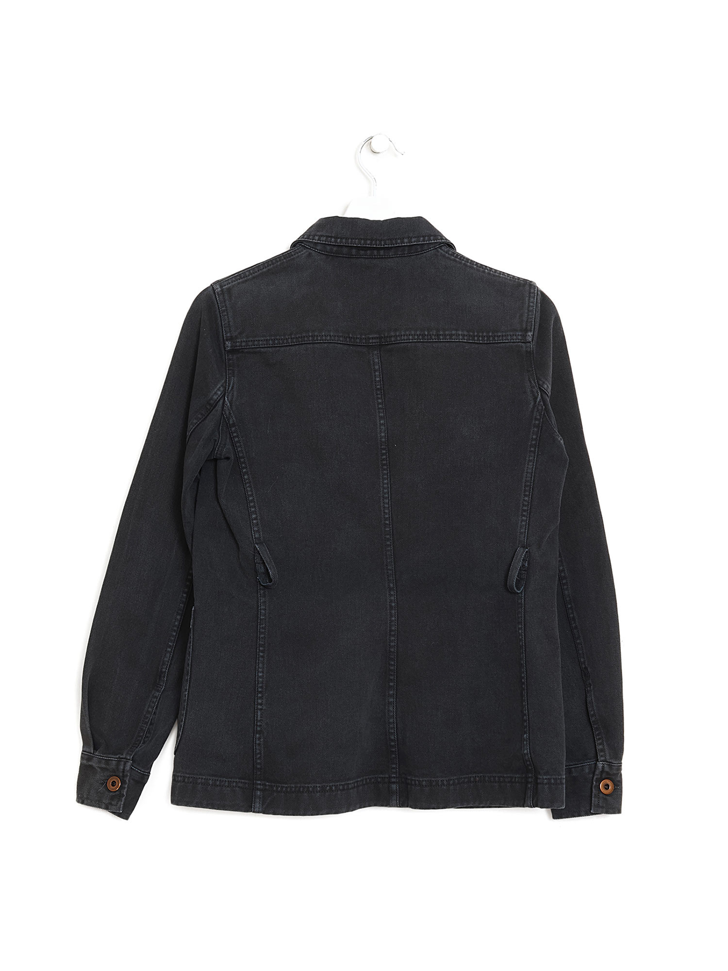 Long sleeve denim shirt jacket in gray. Button-up front closure. Shirt collar. Four pockets. Includes a tie-up belt.