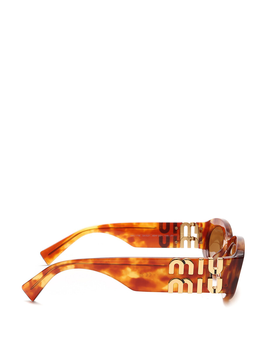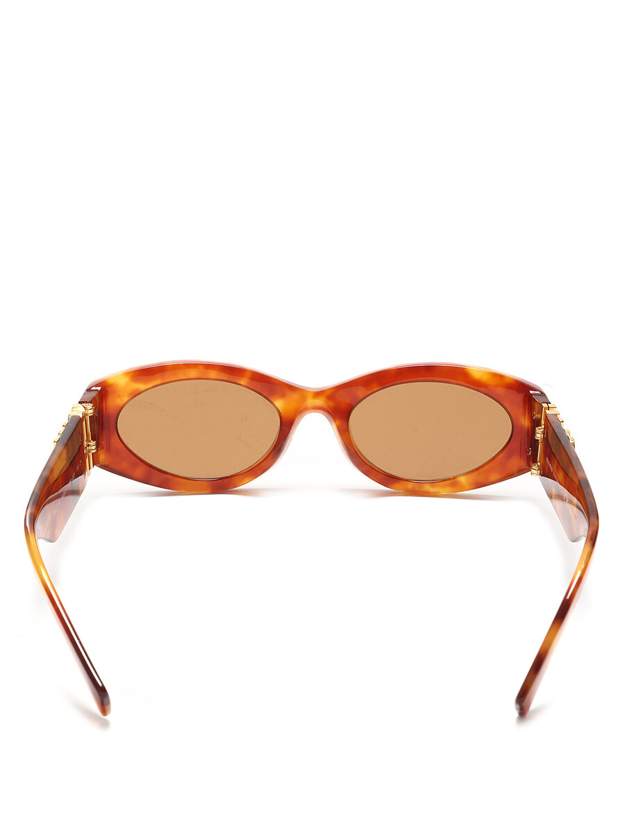Tortoiseshell-patterned oval sunglasses in shades of brown and orange. Gold metal logo at temples. Comes with a protective case.