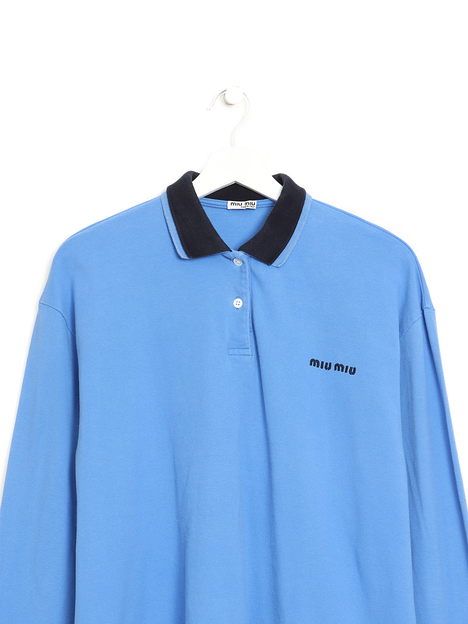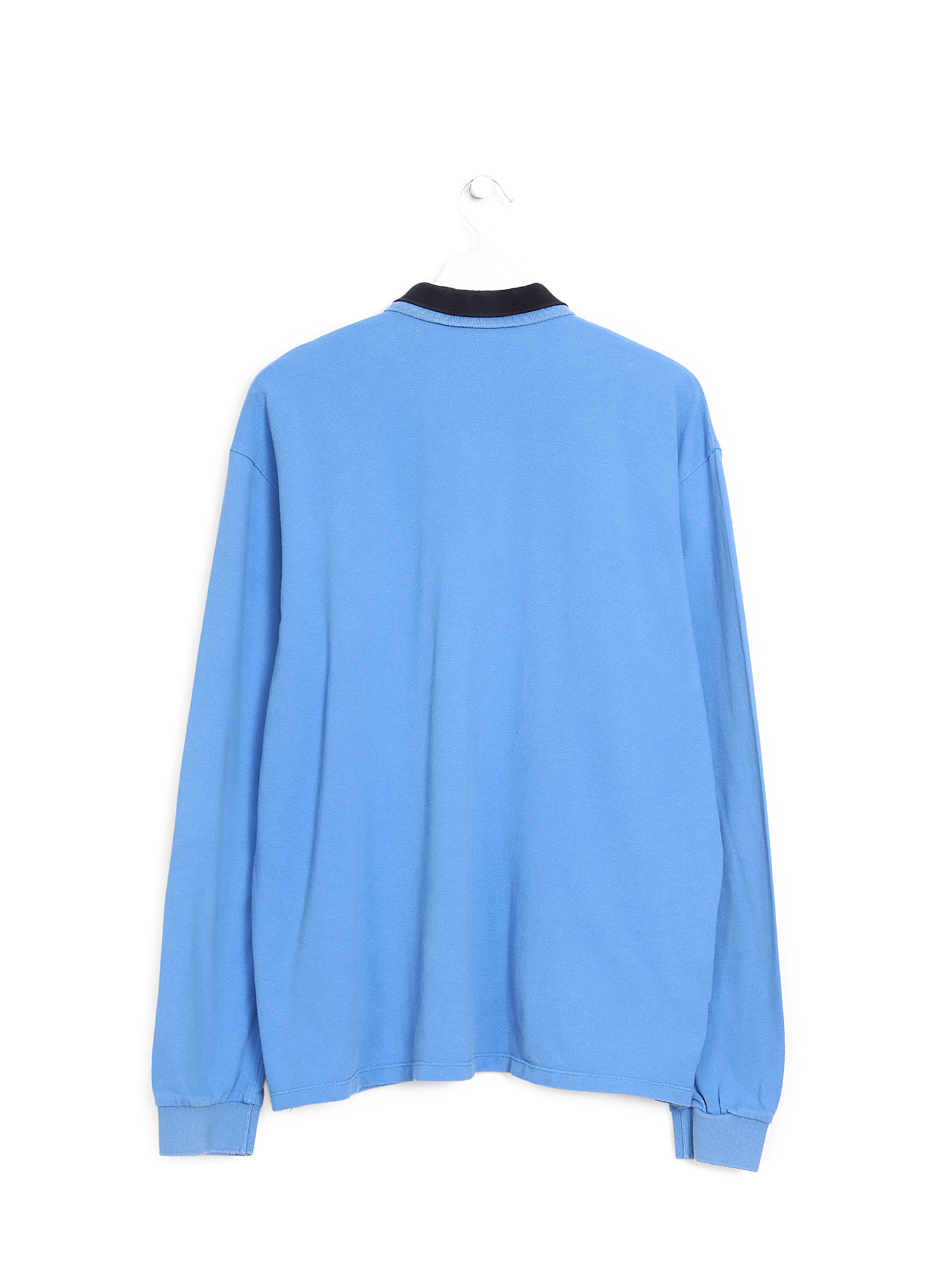 Long sleeve blue polo shirt featuring a contrast collar. Button closure at the front.