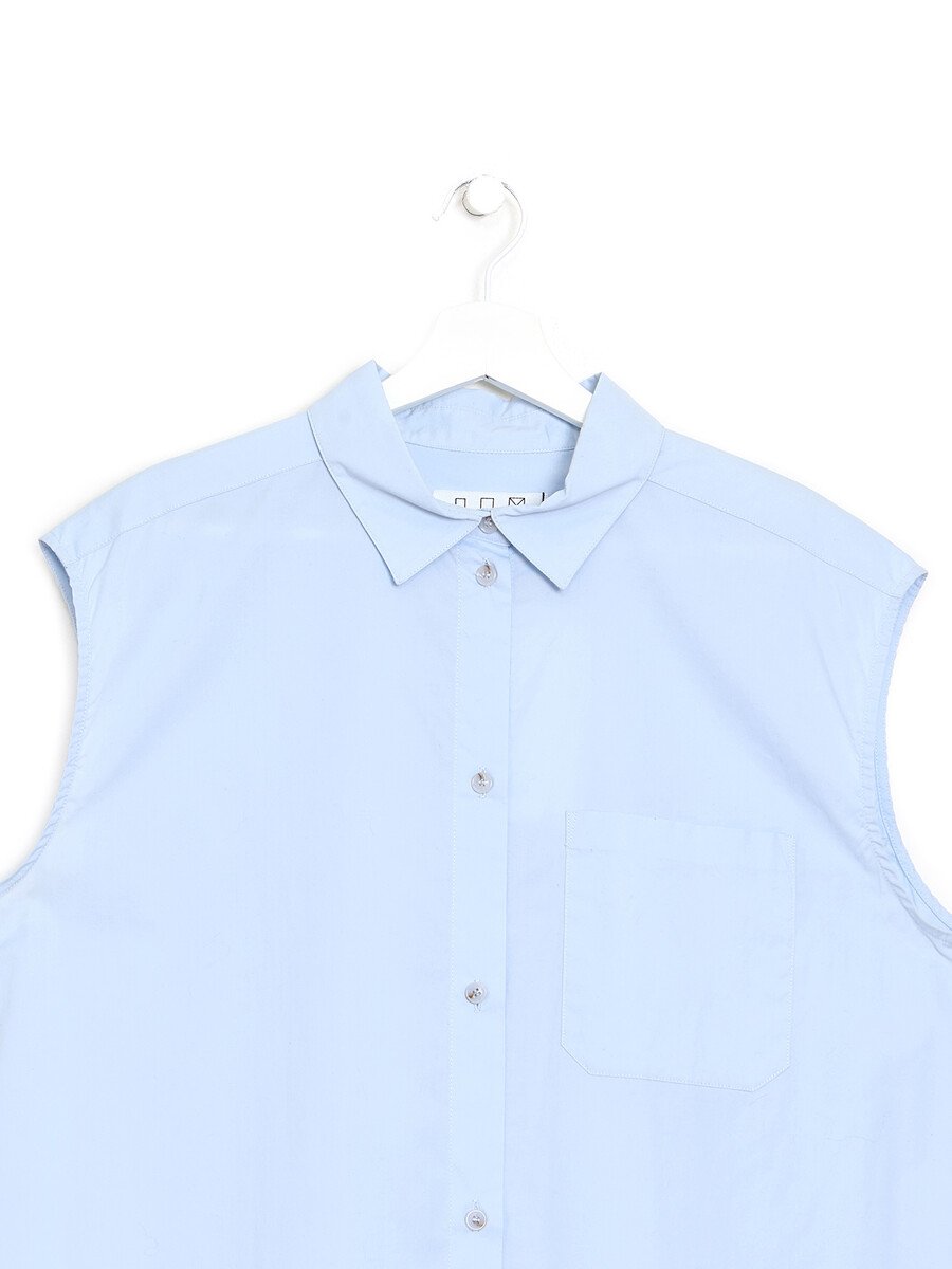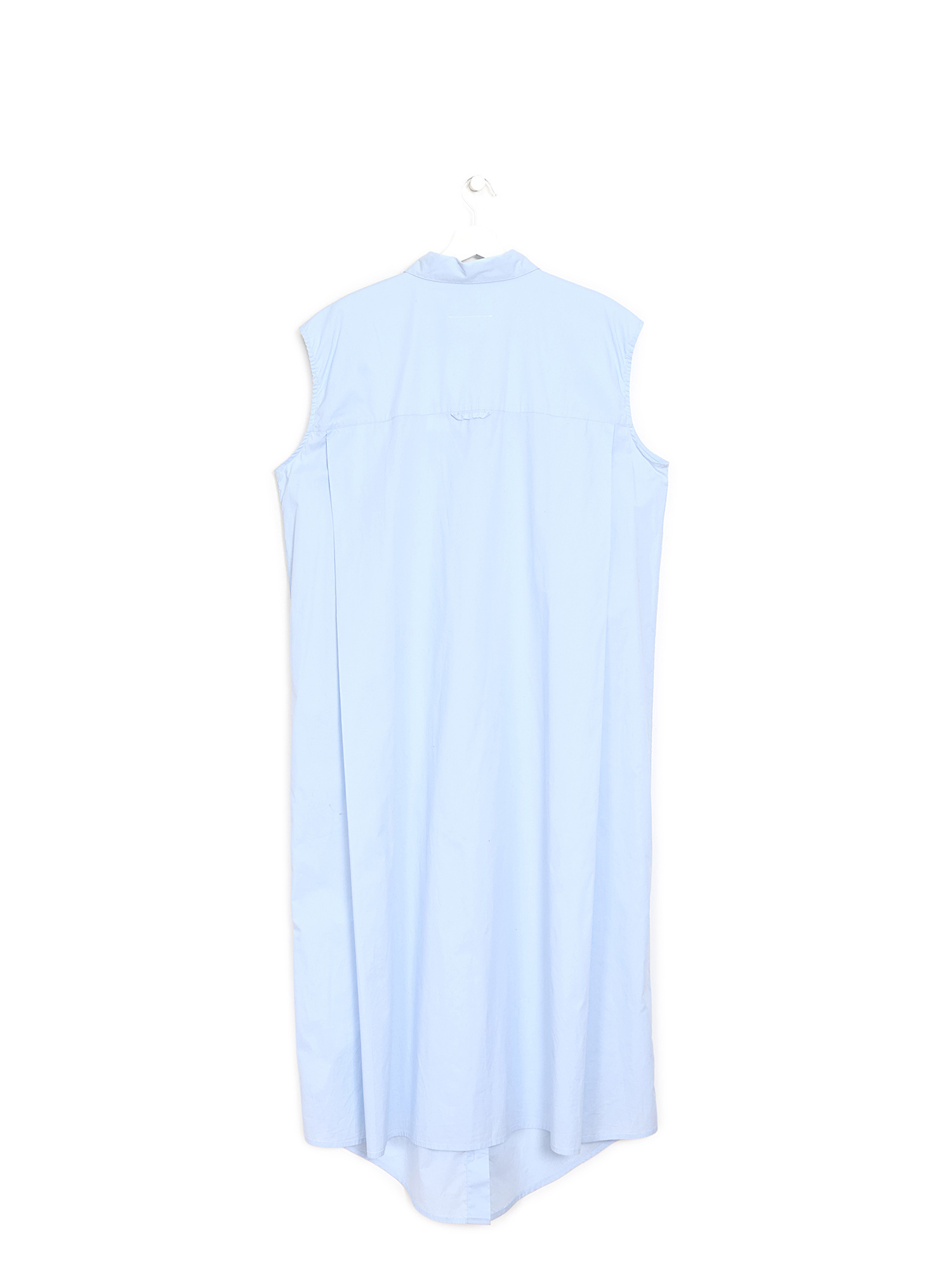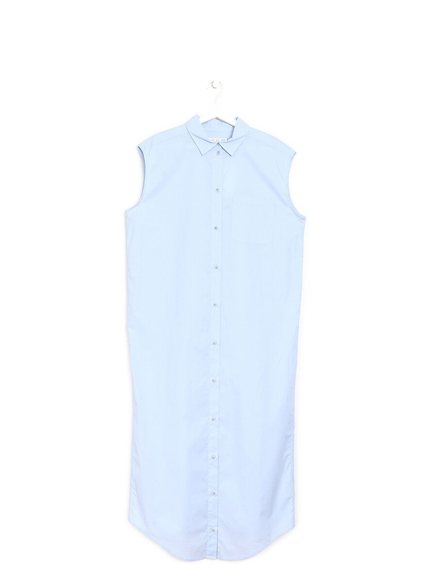 Sleeveless light blue shirt dress featuring a classic shirt collar. Crafted from a stretch cotton blend for a comfortable fit.