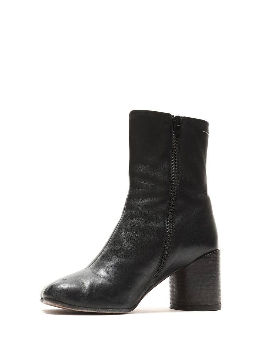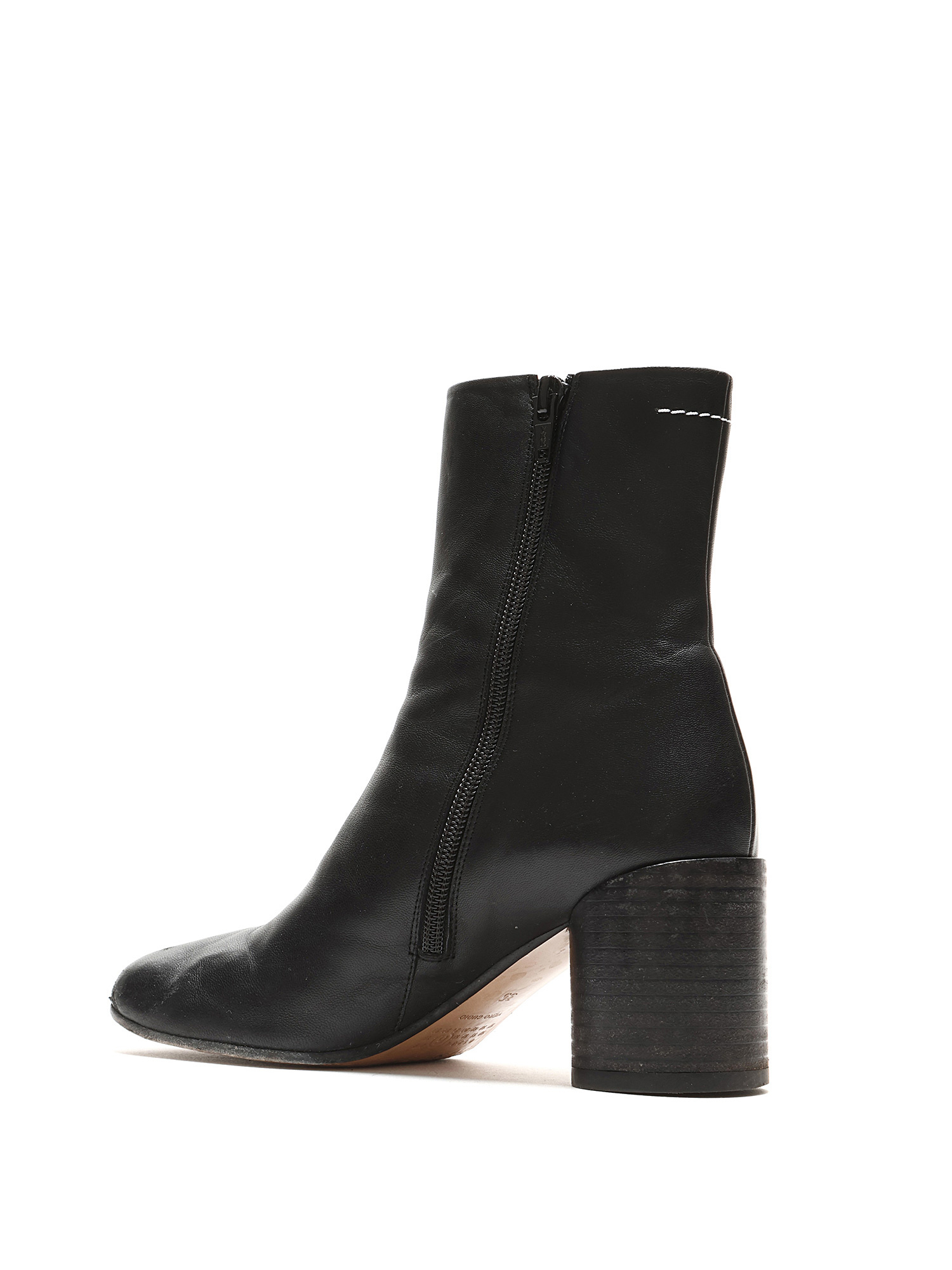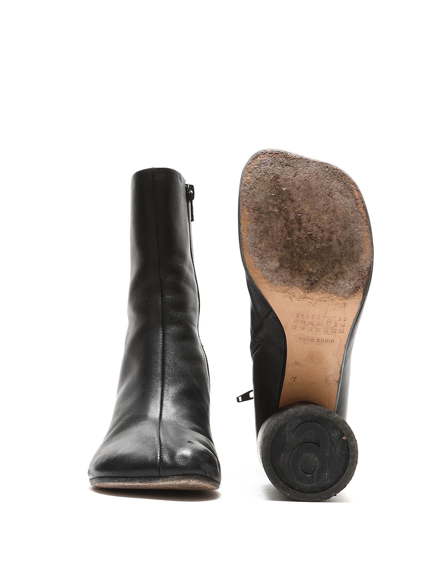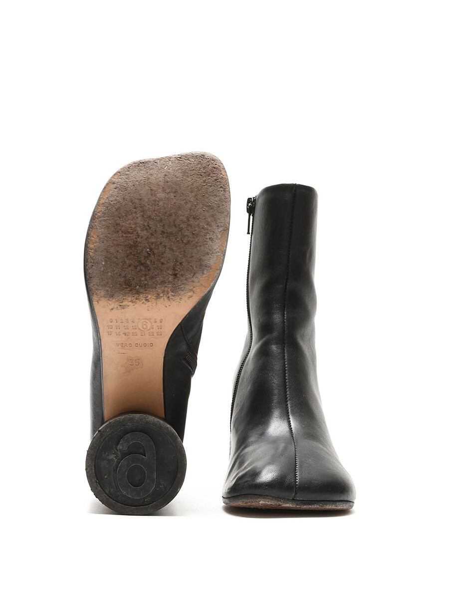 Grained leather ankle boots in black featuring a square toe design. Side zipper closure. Sturdy leather sole.