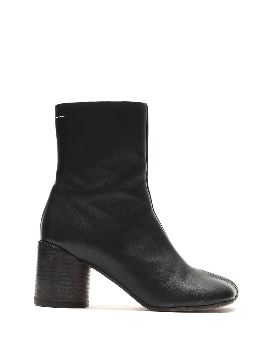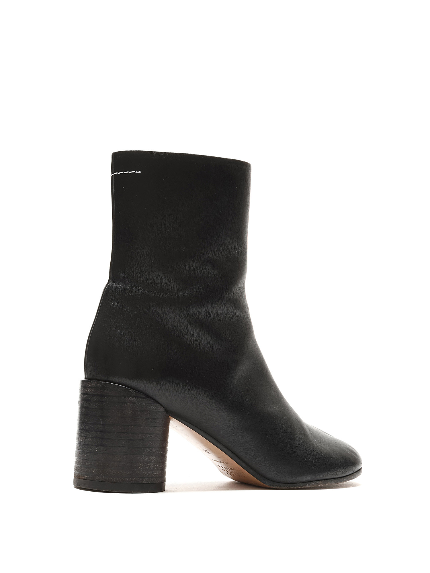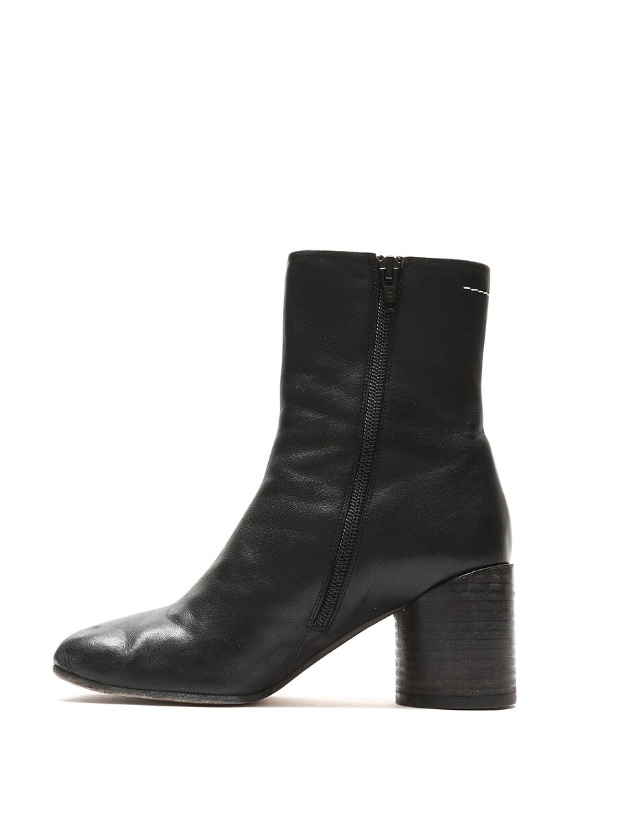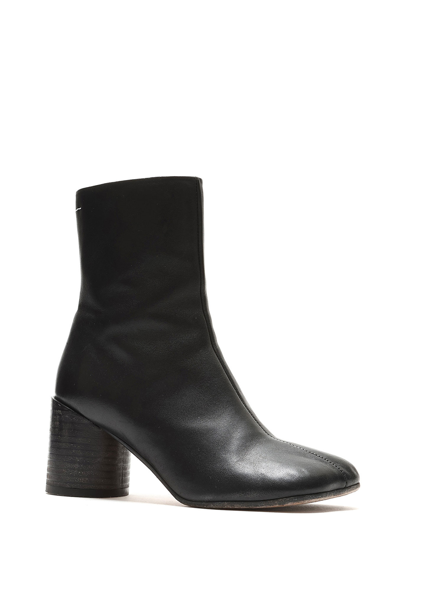 Grained leather ankle boots in black featuring a square toe design. Side zipper closure. Sturdy leather sole.
