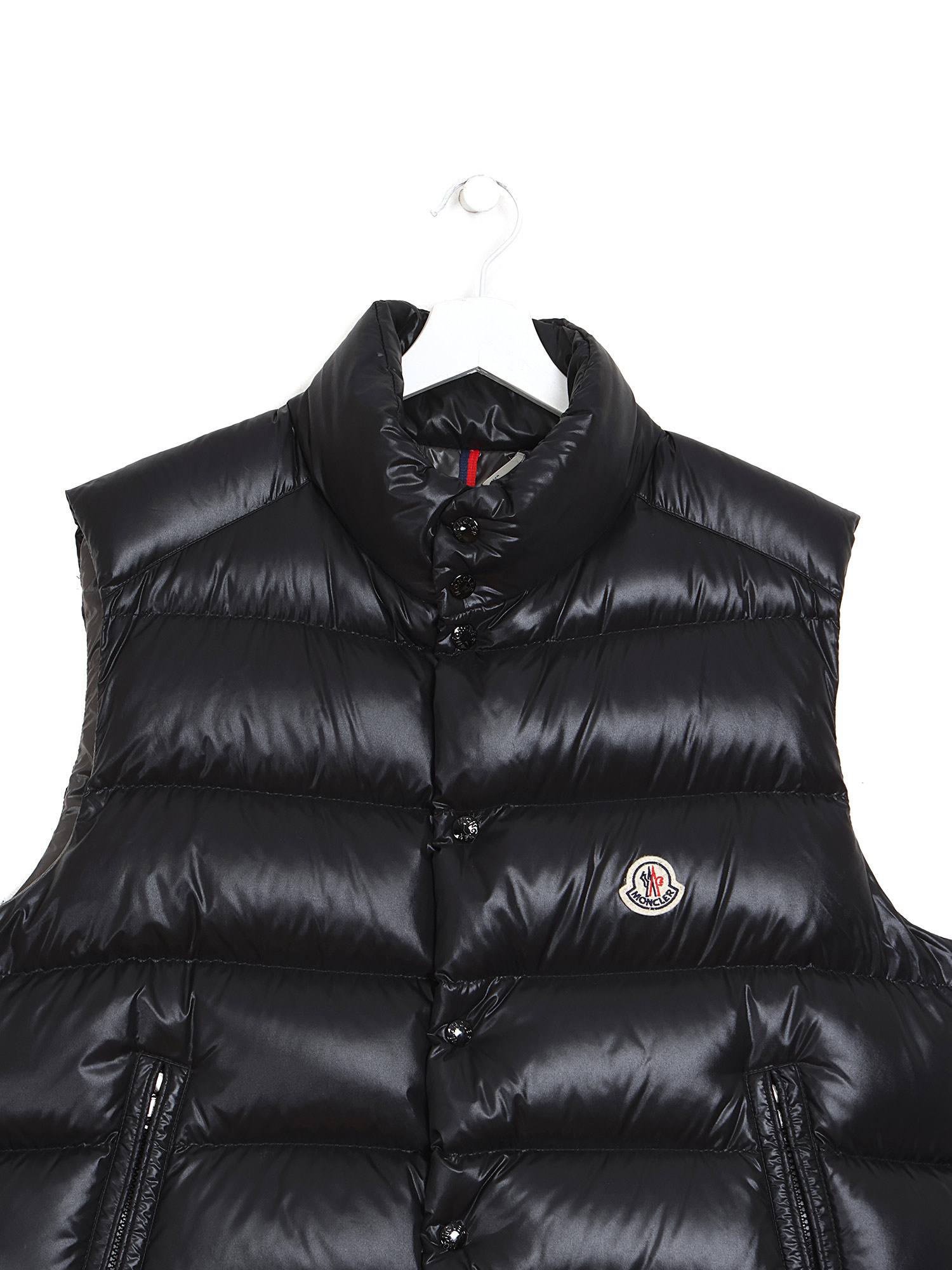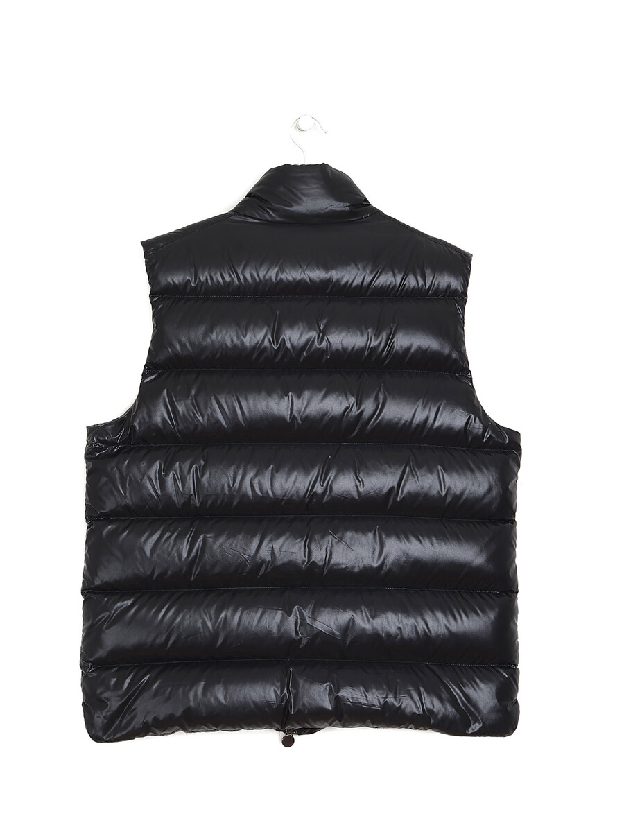 Padded, lightweight, sleeveless down jacket in black. High standing collar. Front zip closure. Zipped pockets at front.