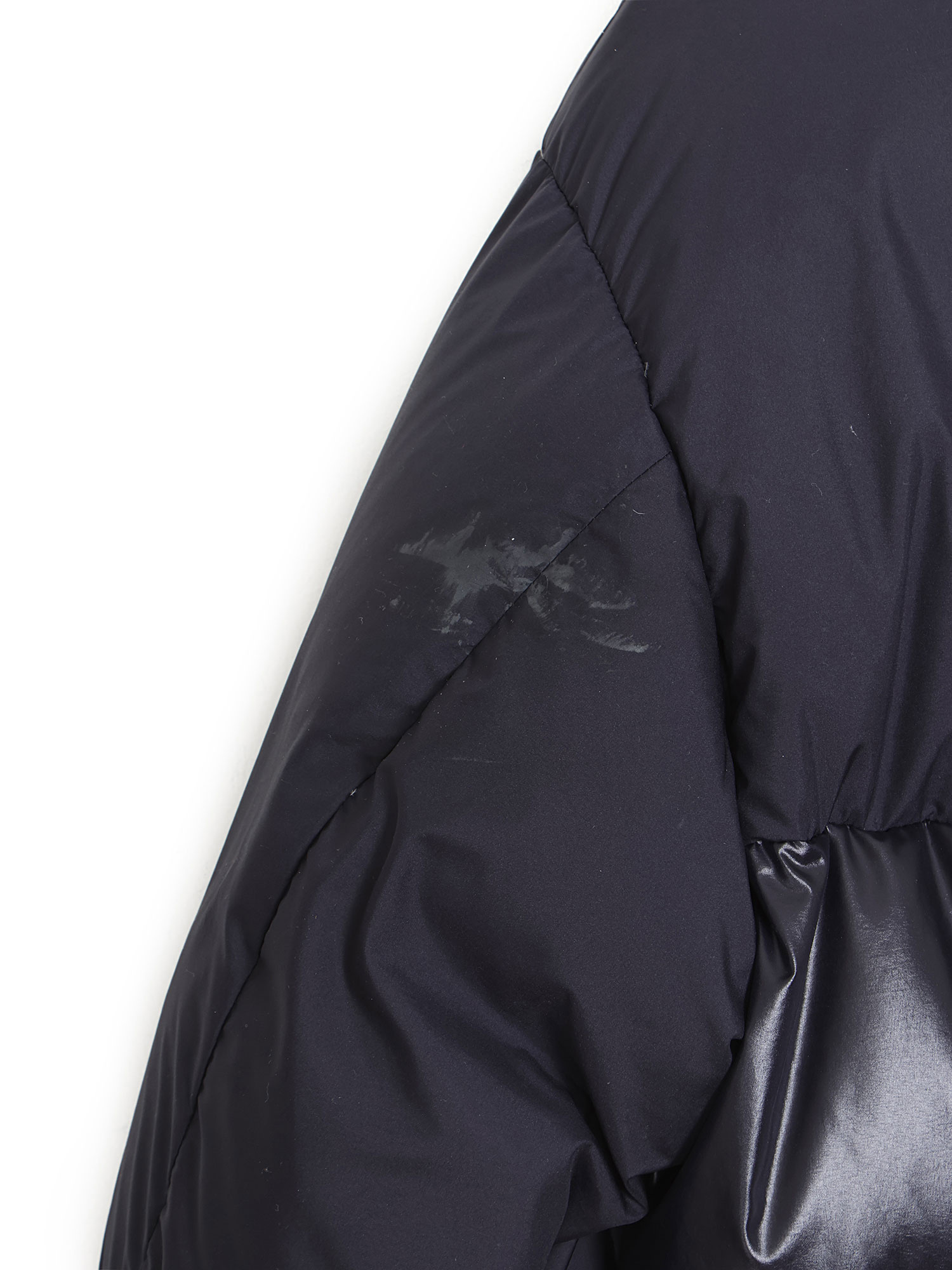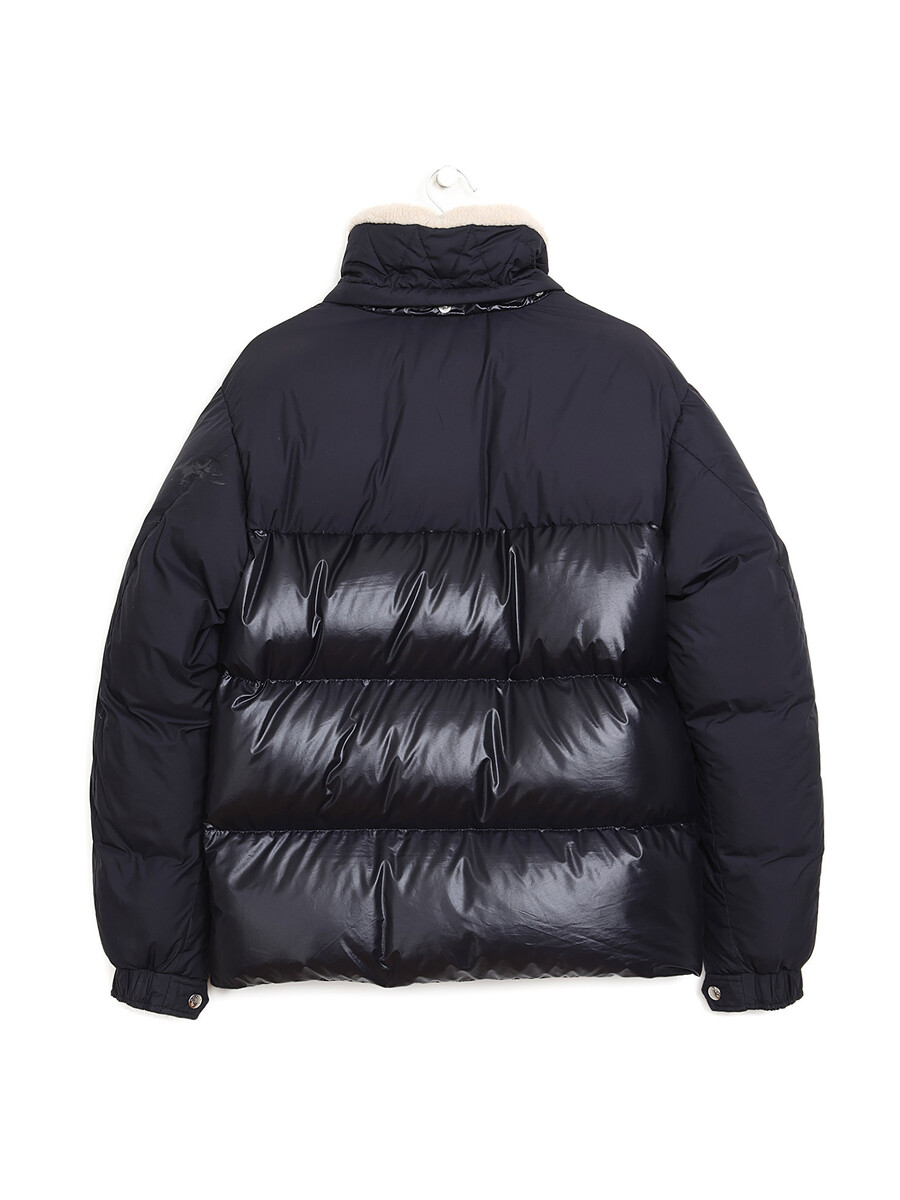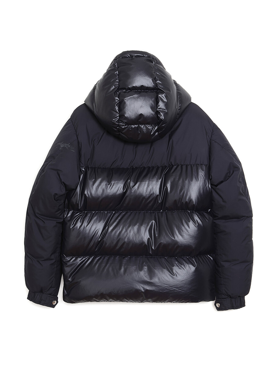 Black quilted down coat with front zipper closure and black pull tab. Integrated hood with fleece lining. Two front flap pockets.