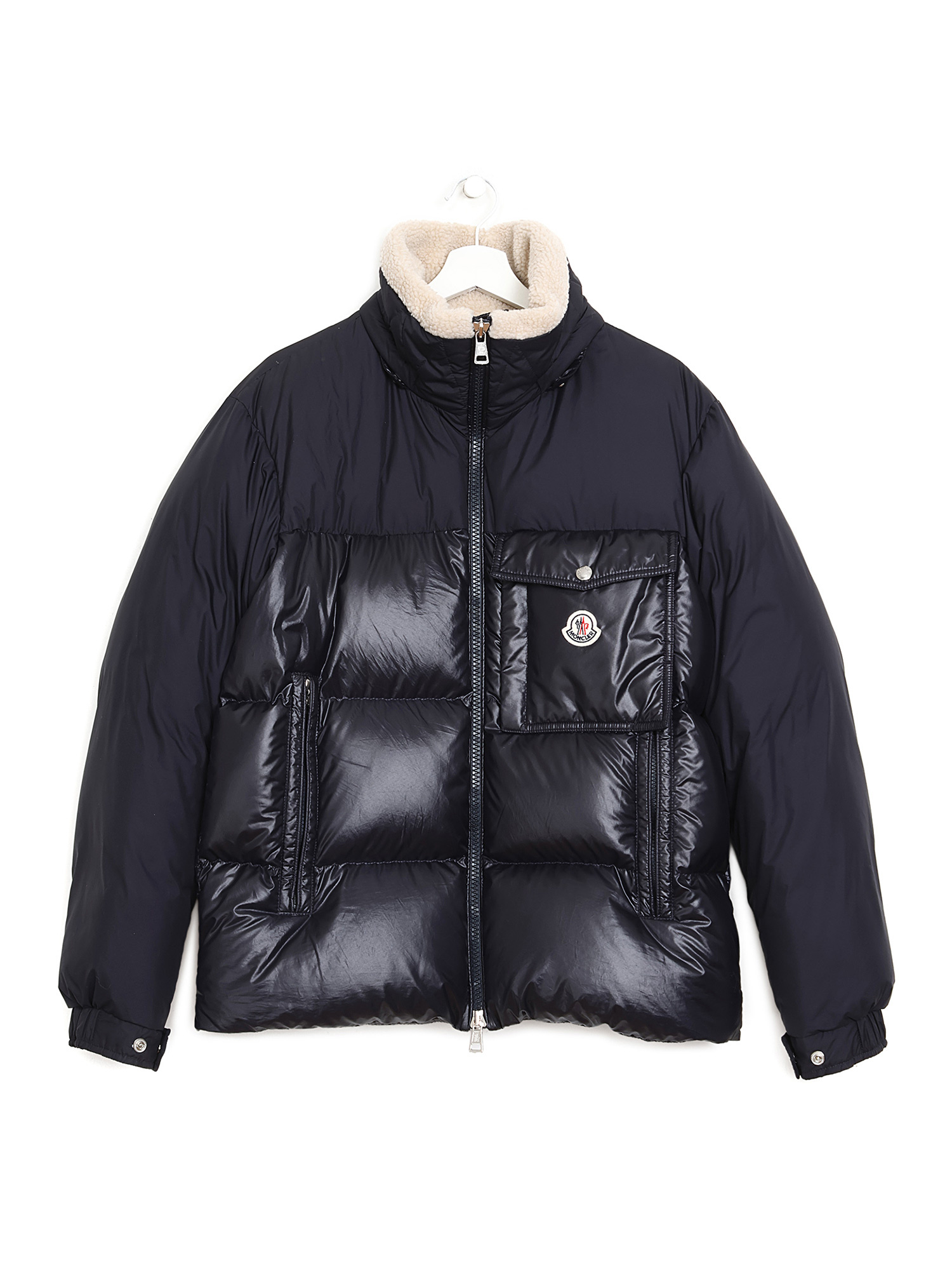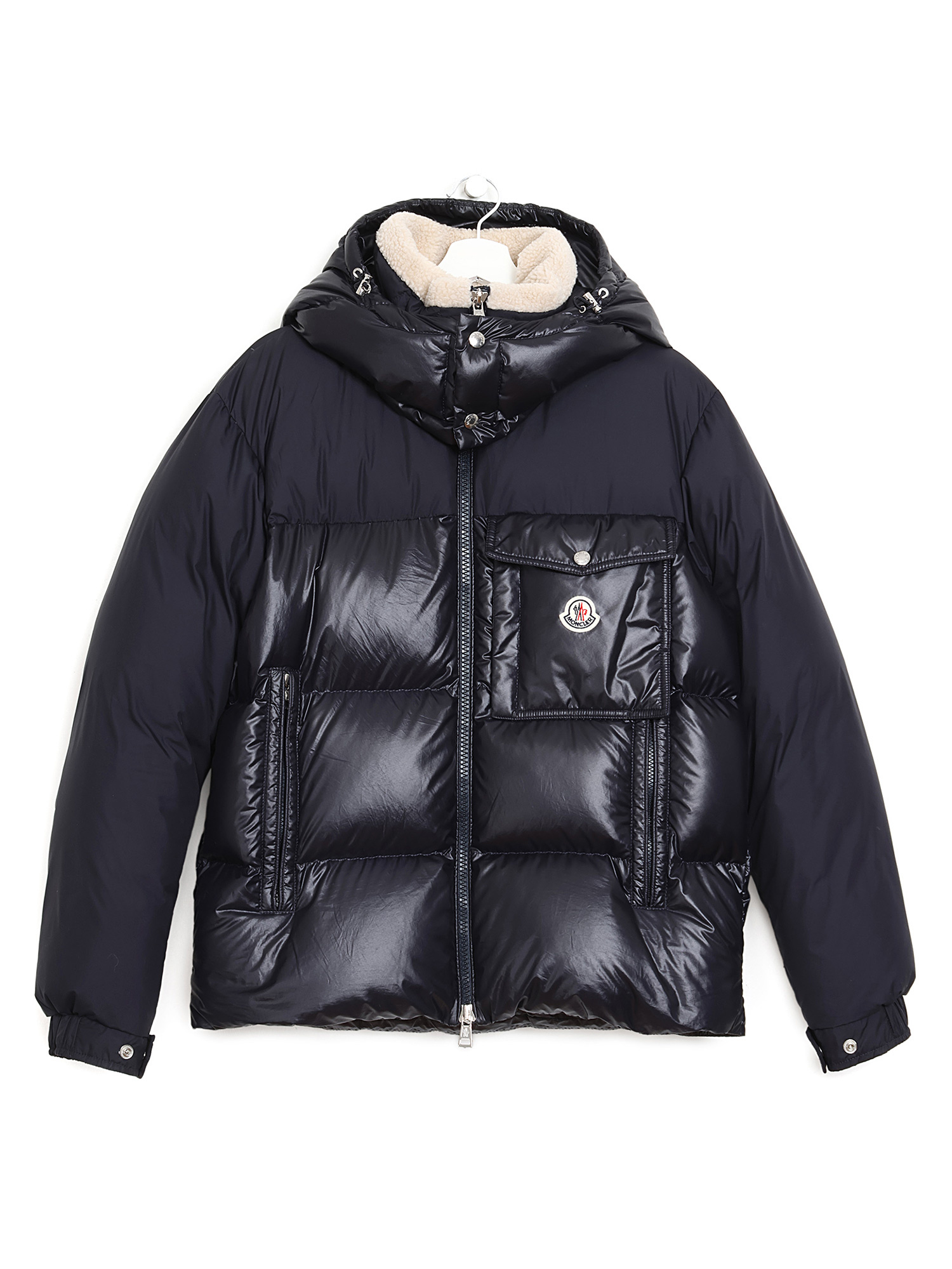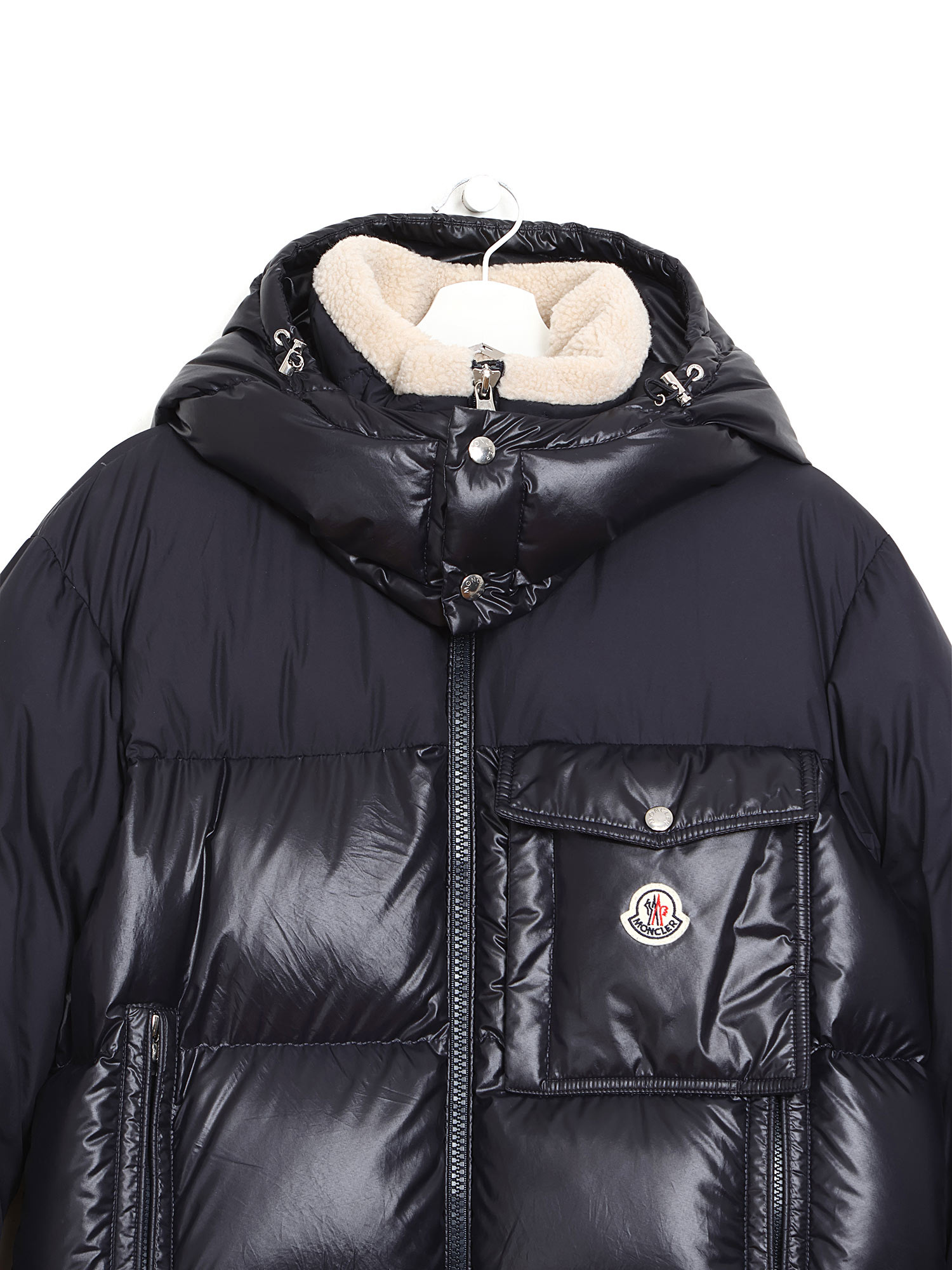 Black quilted down coat with front zipper closure and black pull tab. Integrated hood with fleece lining. Two front flap pockets.