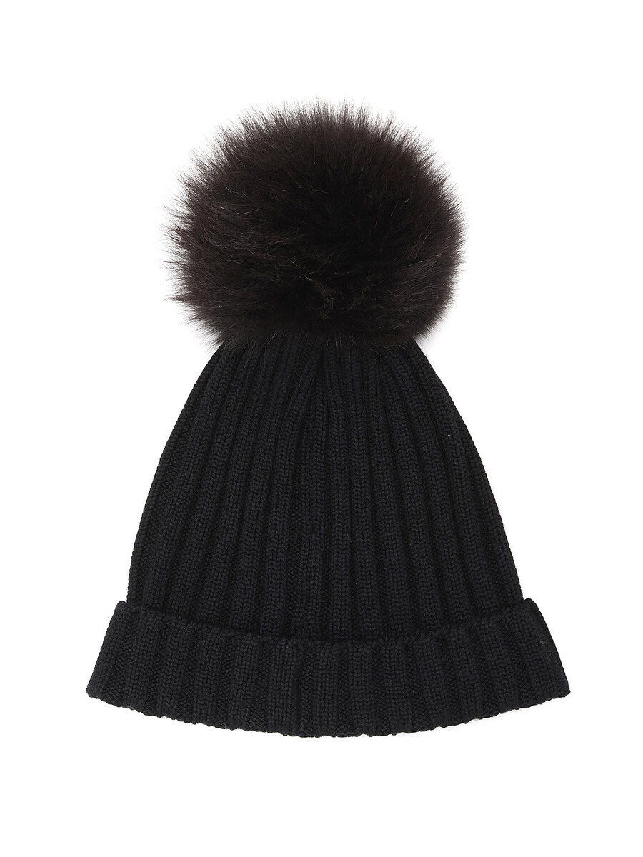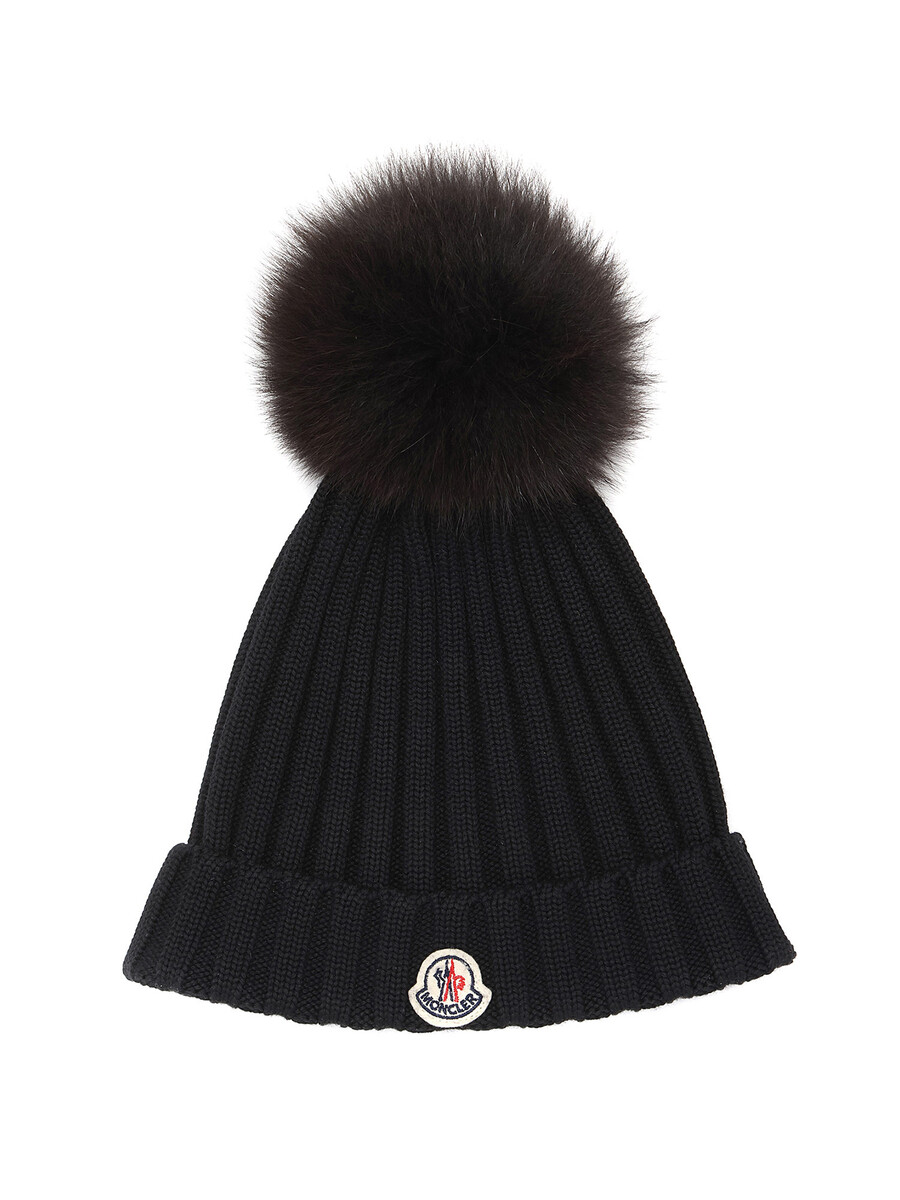 Classic black beanie crafted in 100% virgin wool, accentuated by a fur pom pom on top. Iconic Moncler logo patch at the front.