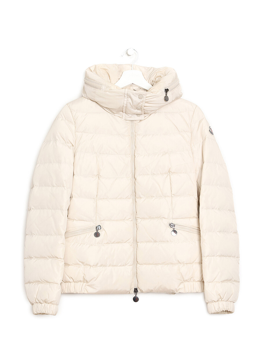 Quilted puffer coat in cream with integrated hoodie. Front zipper closure with snap button placket. High collar. Zippered pockets.