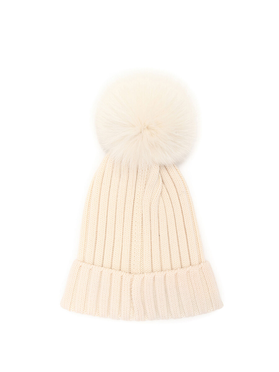 White rib knit beanie featuring a logo plaque and pom pom at the top. Soft and snug fit for extra warmth.