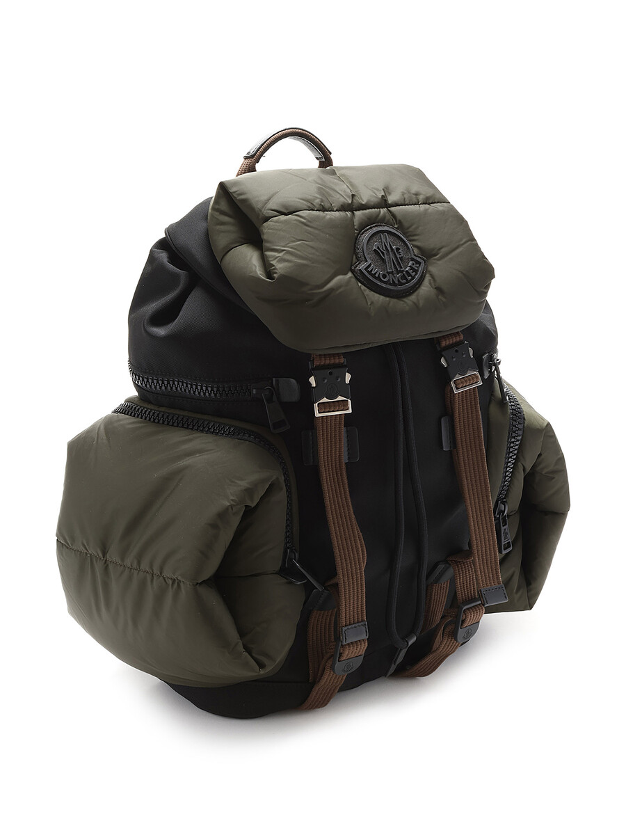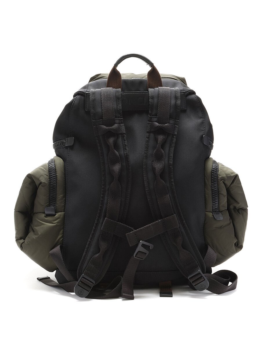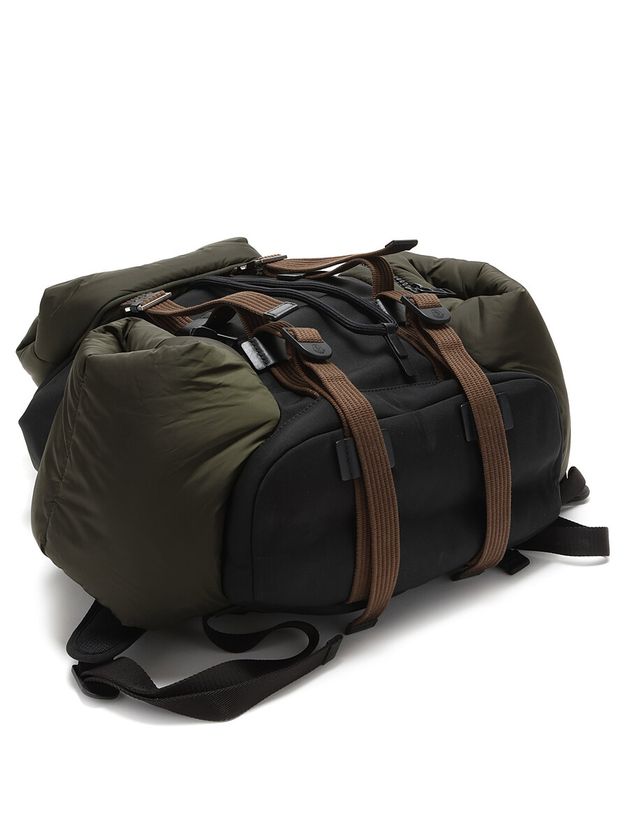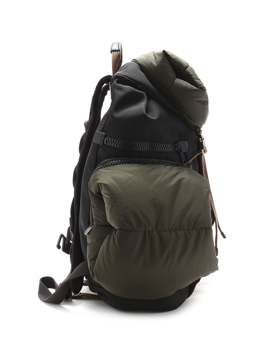 Paneled nylon-blend canvas and quilted nylon satin backpack in green and black. Adjustable padded shoulder straps with black metal hardware.