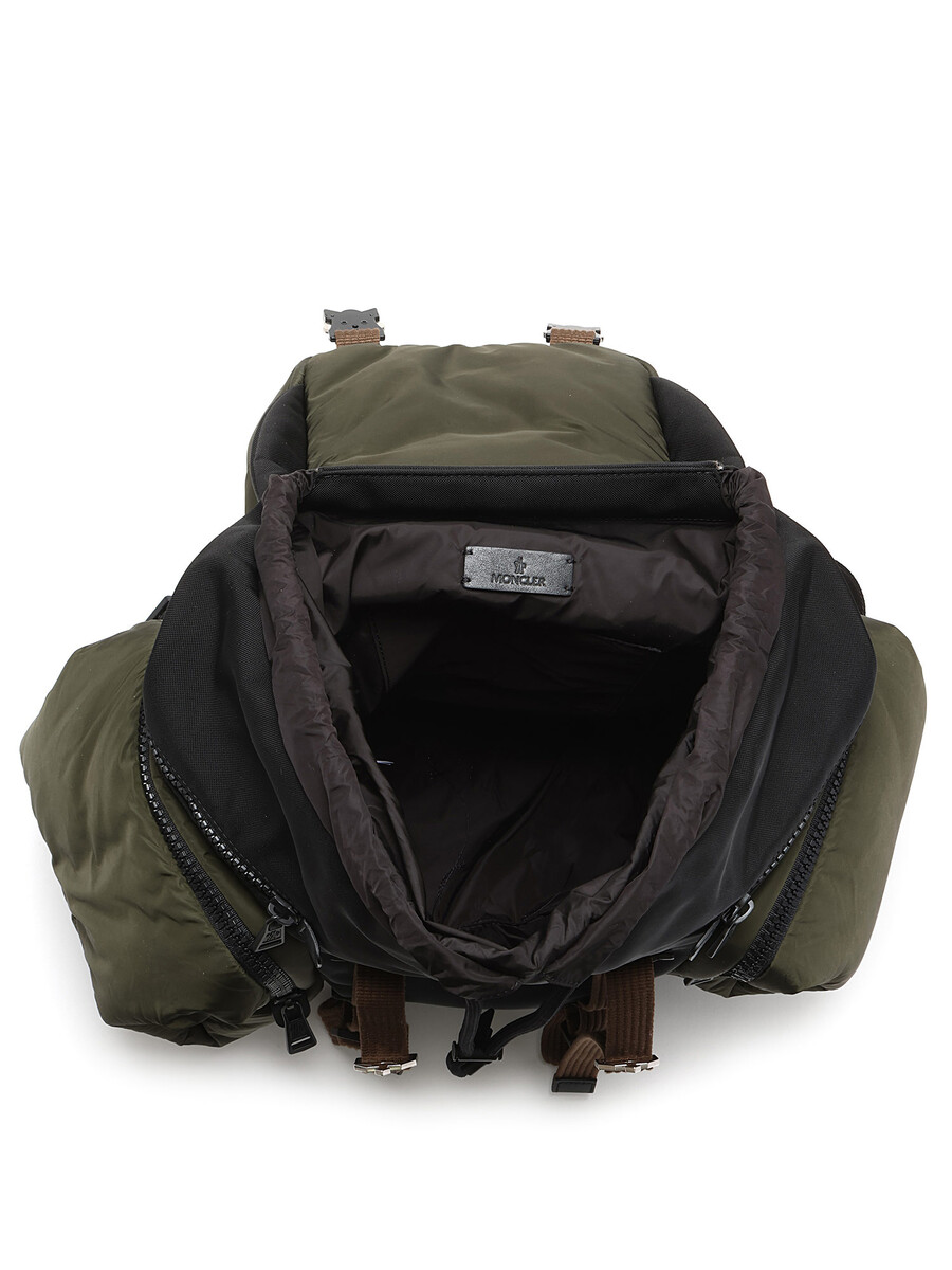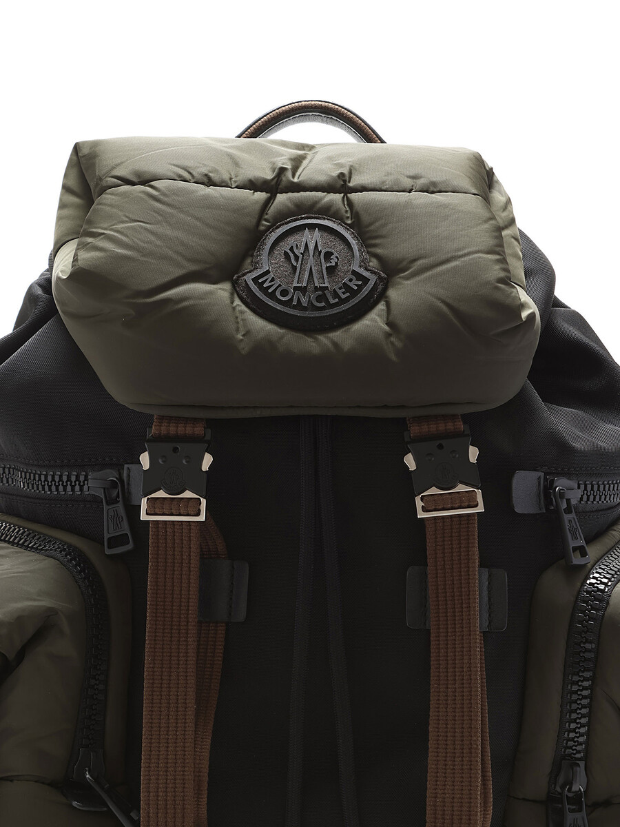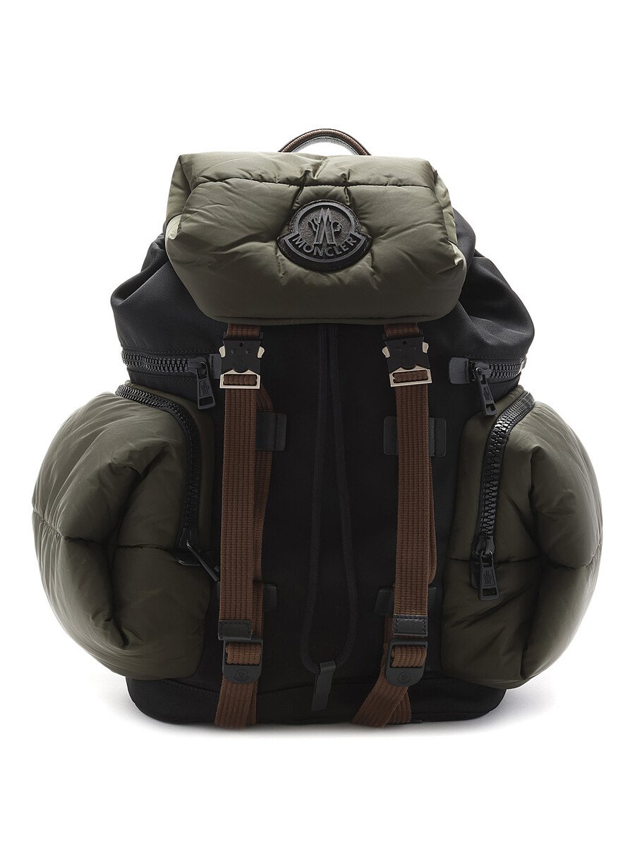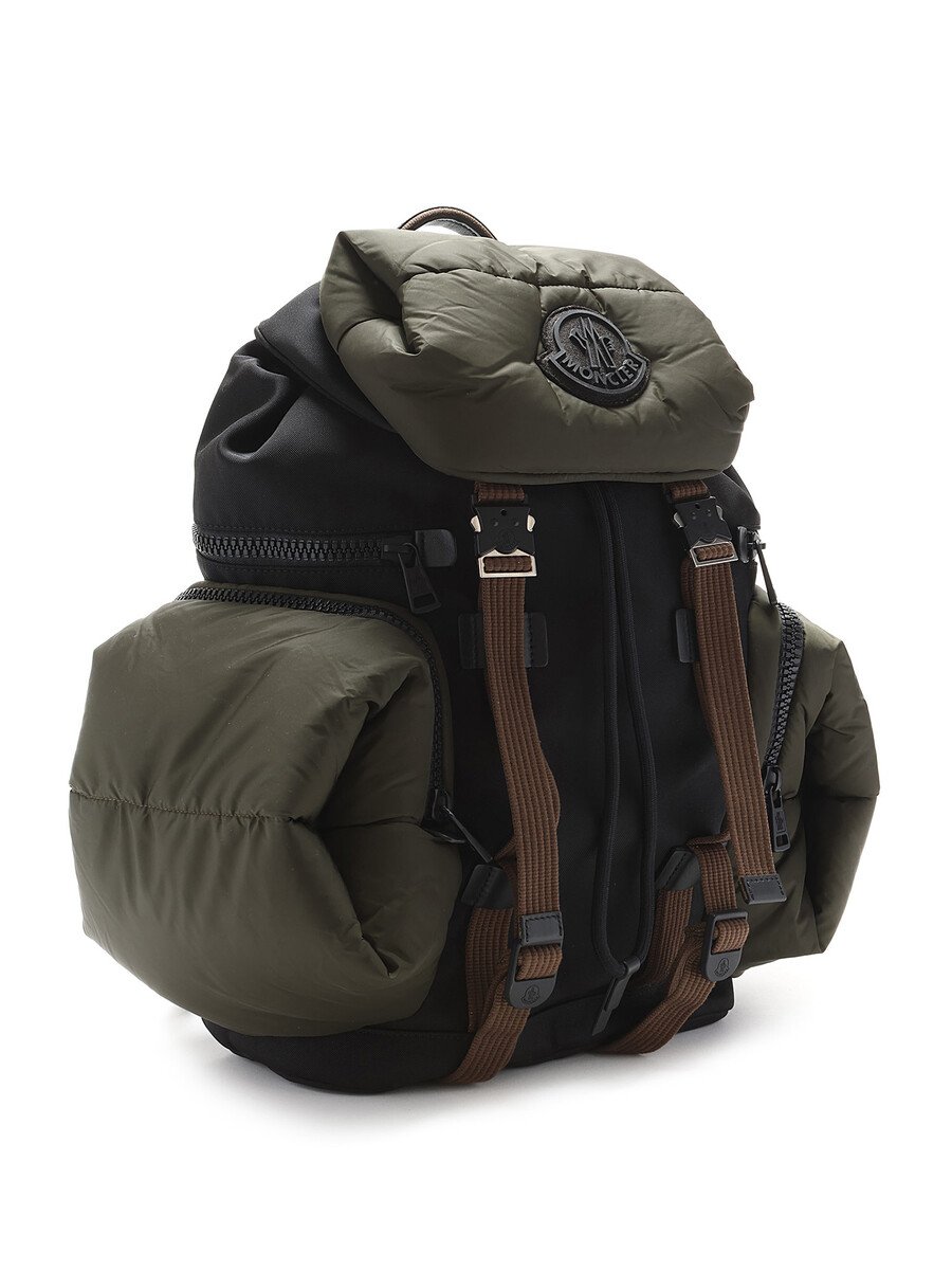 Paneled nylon-blend canvas and quilted nylon satin backpack in green and black. Adjustable padded shoulder straps with black metal hardware.