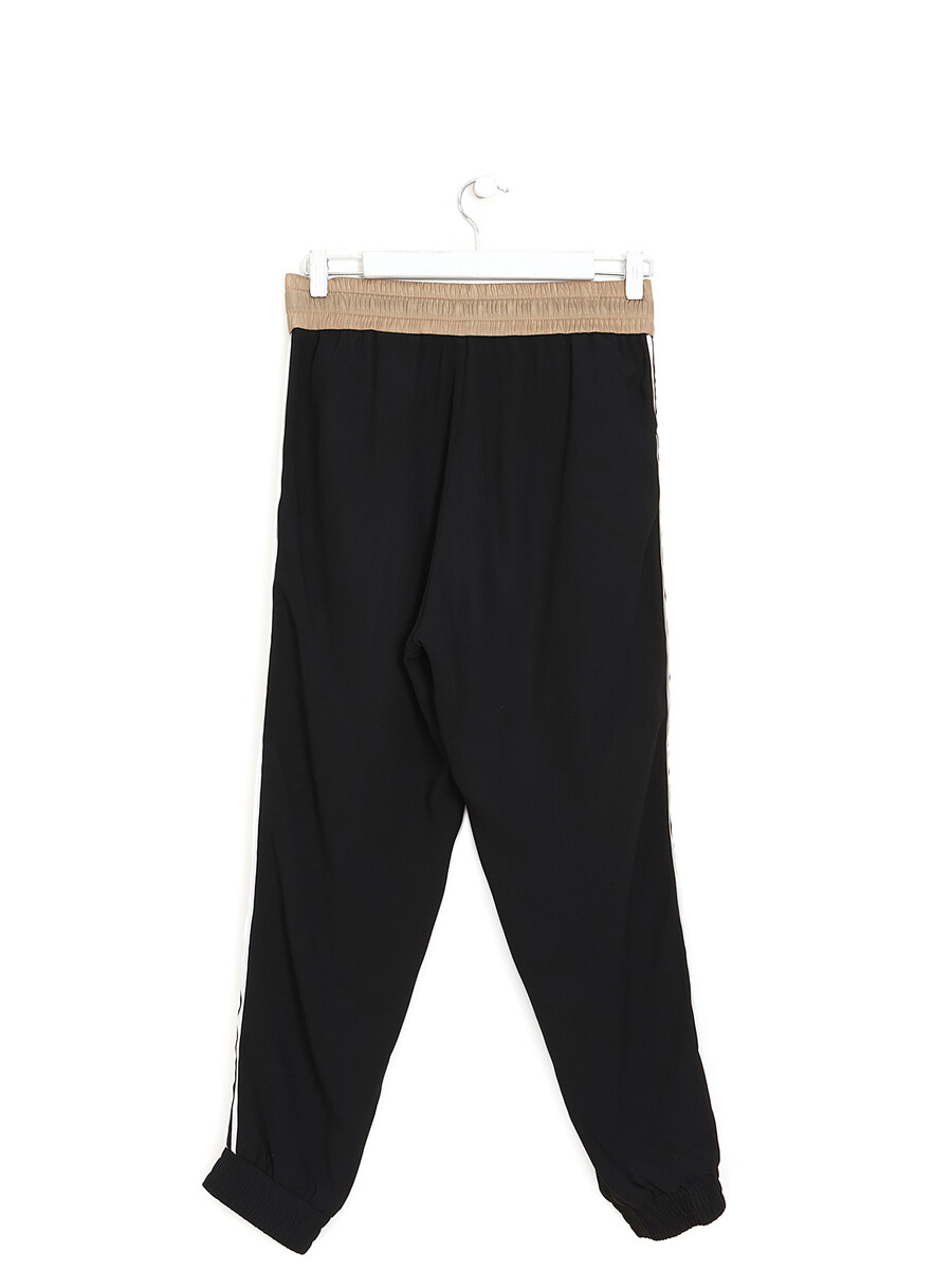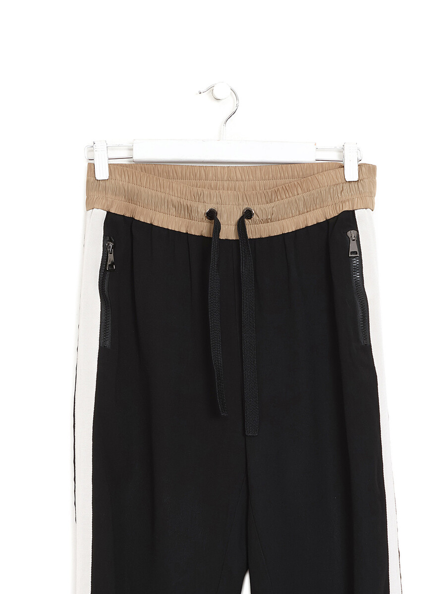 Ankle-length joggers with zippered side pockets. Elastic waistband with drawstring.