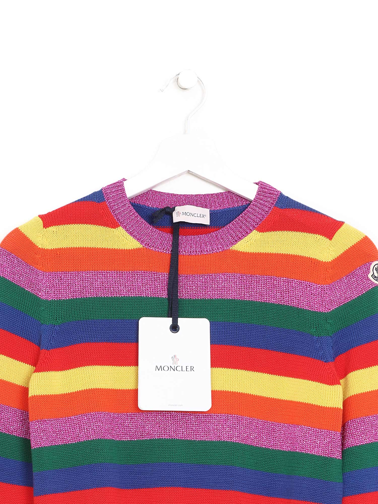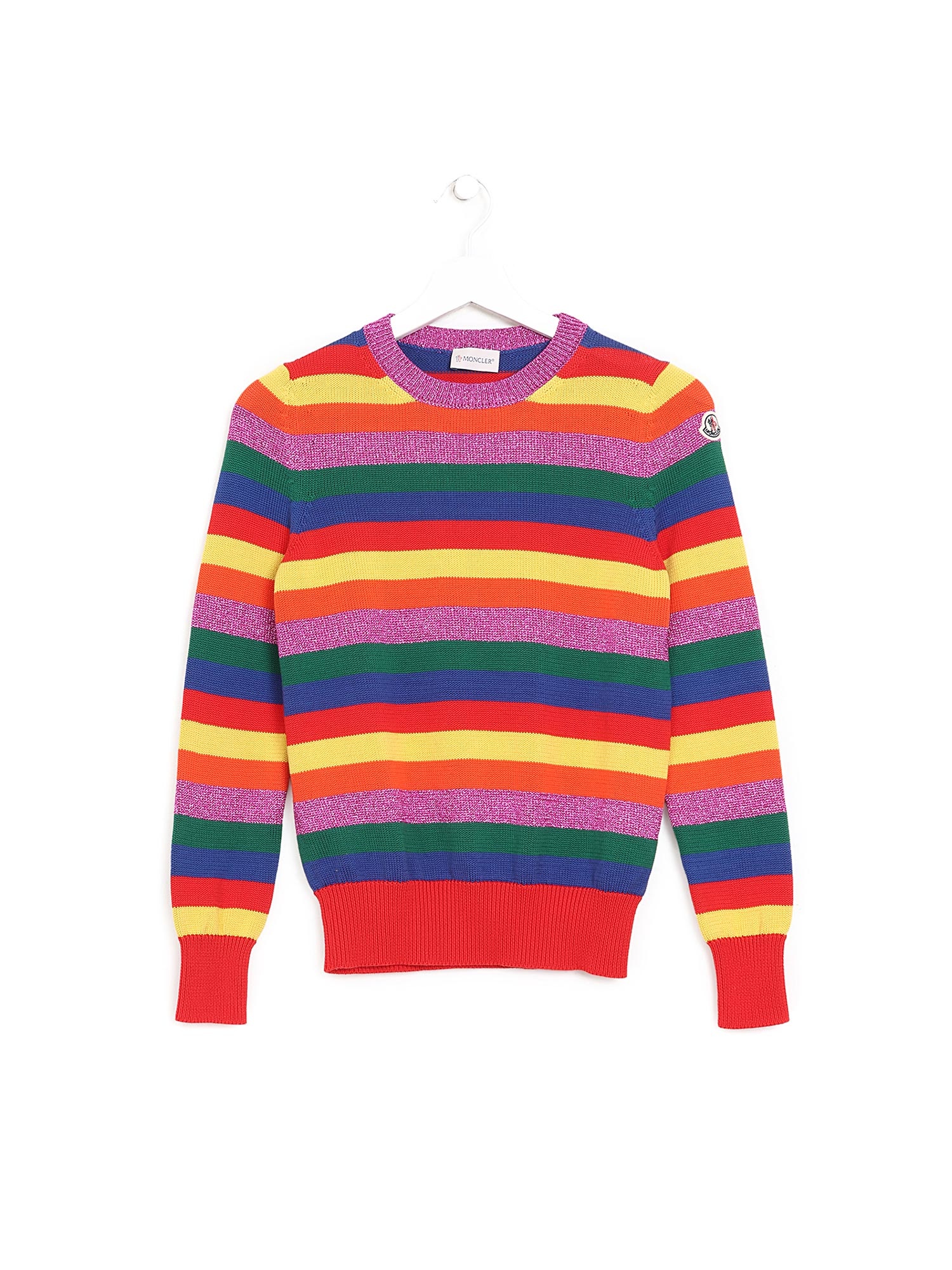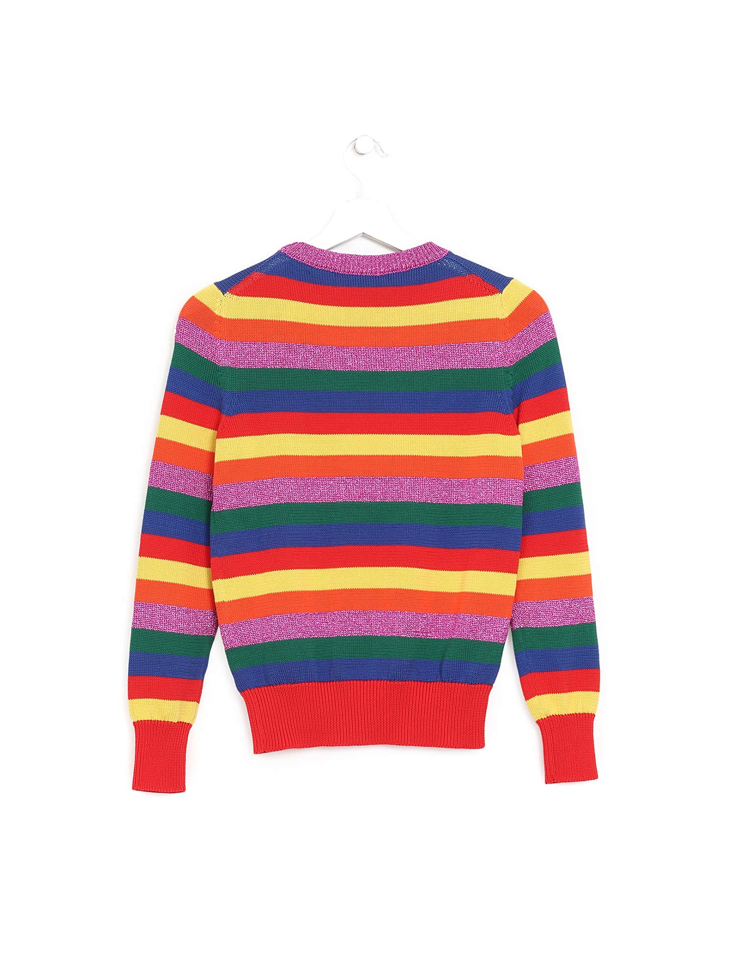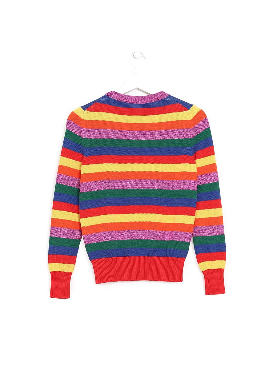 Multicolor striped cotton knit sweater. Crew neckline. Features ribbed trim at cuffs and hem.