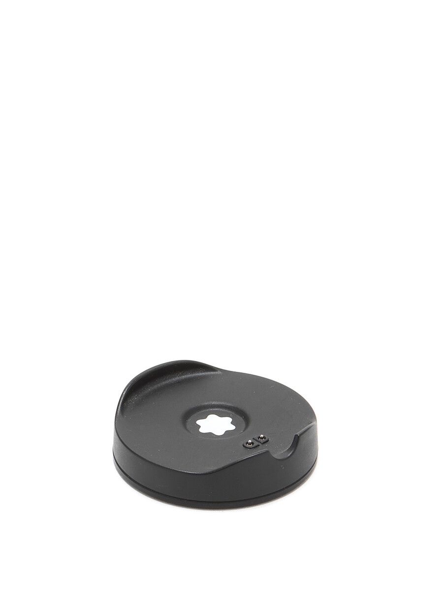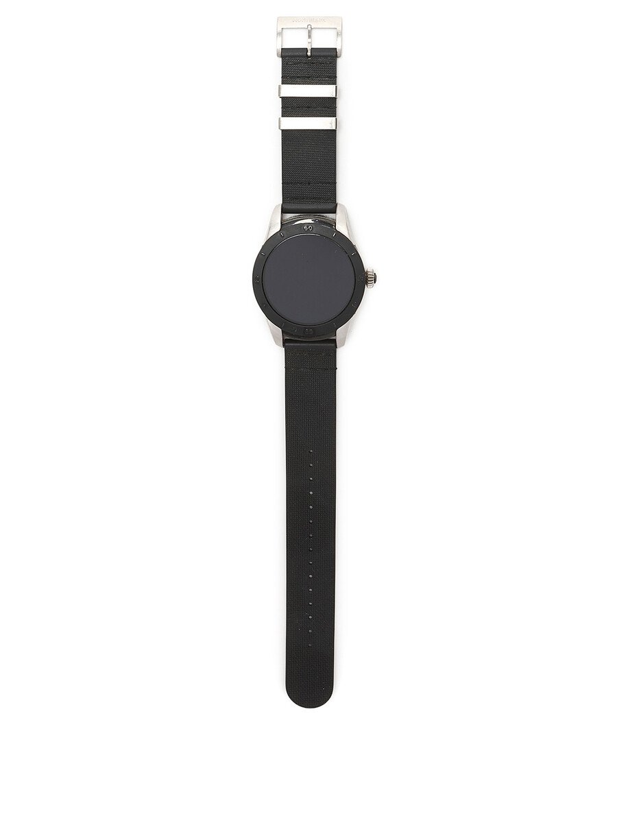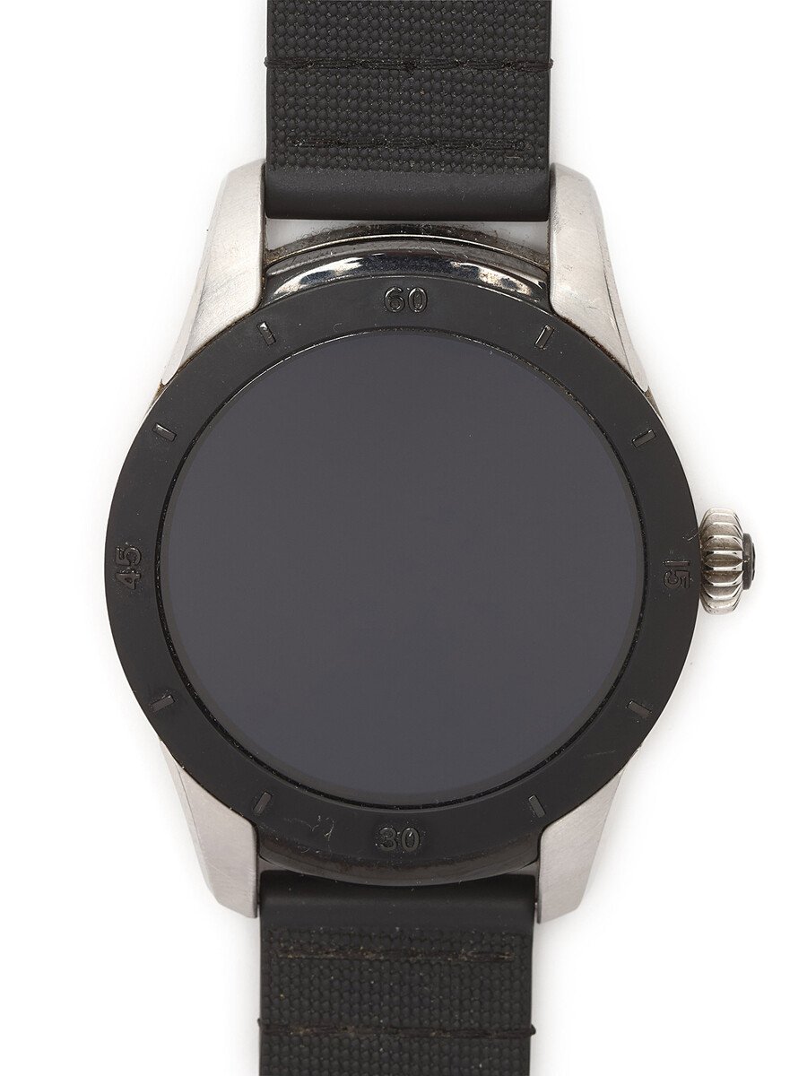 Smartwatch featuring a round face and black rubber strap. Silver-tone metal hardware. Water-resistant with IP68 rating. Includes charging cable and dock.