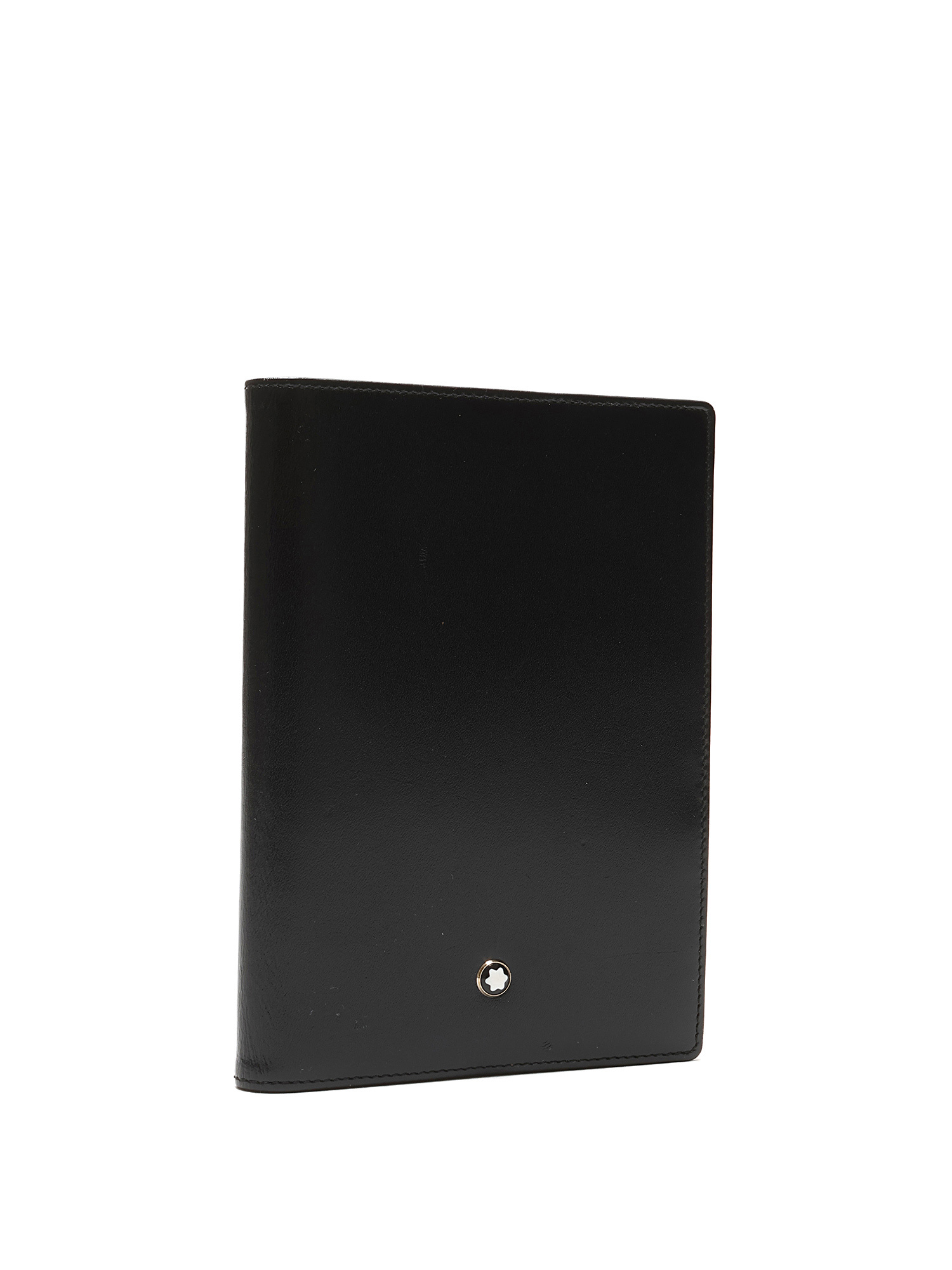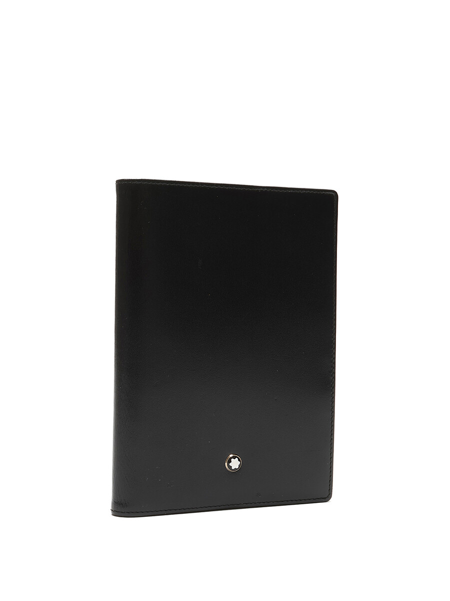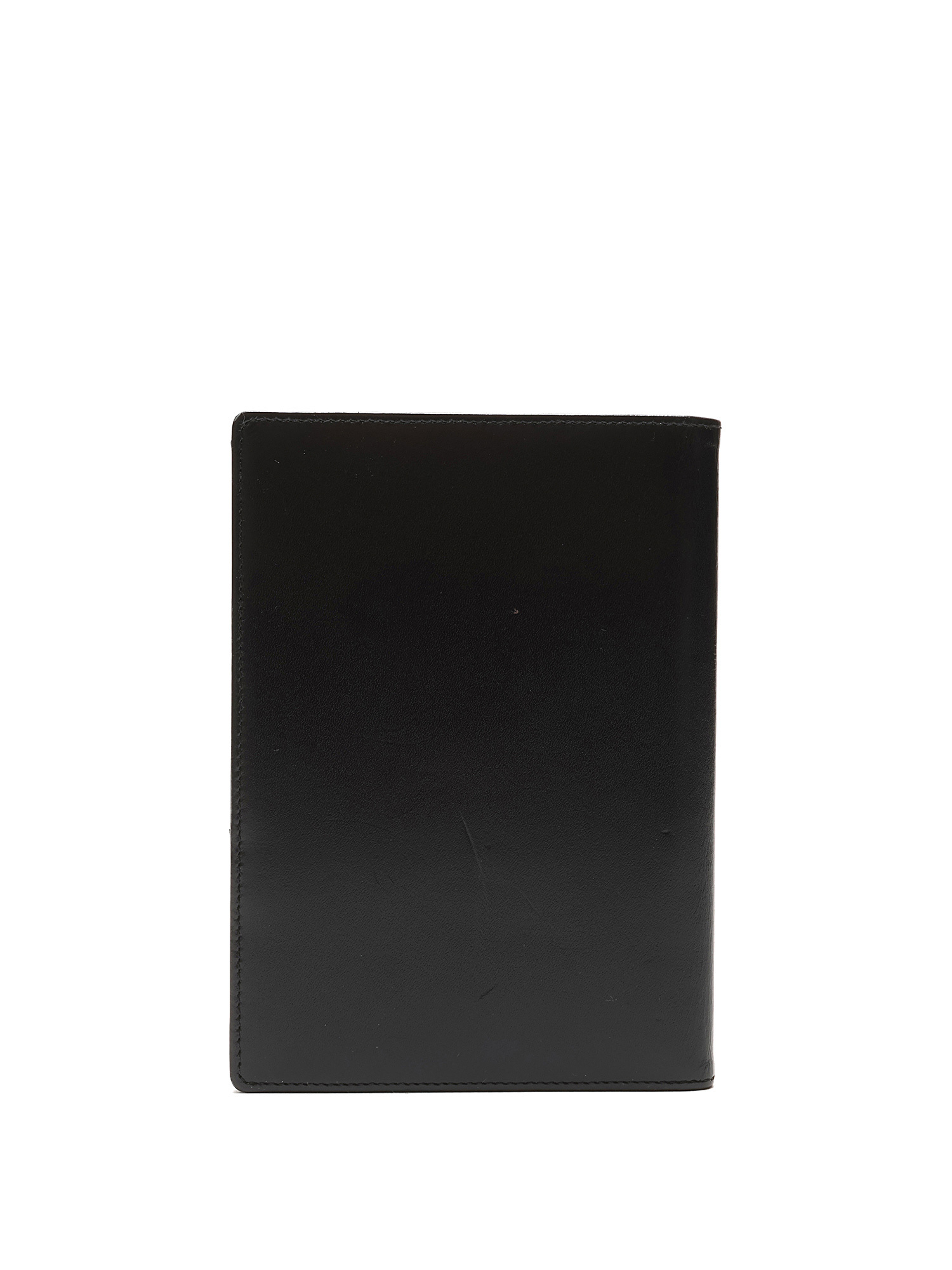 Full-grain leather wallet in deep black. Features a polished metal emblem and tonal stitching. Interior includes multiple card slots with embossed logo.