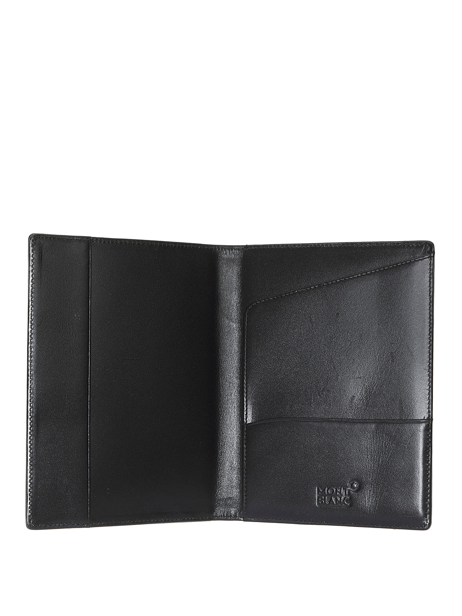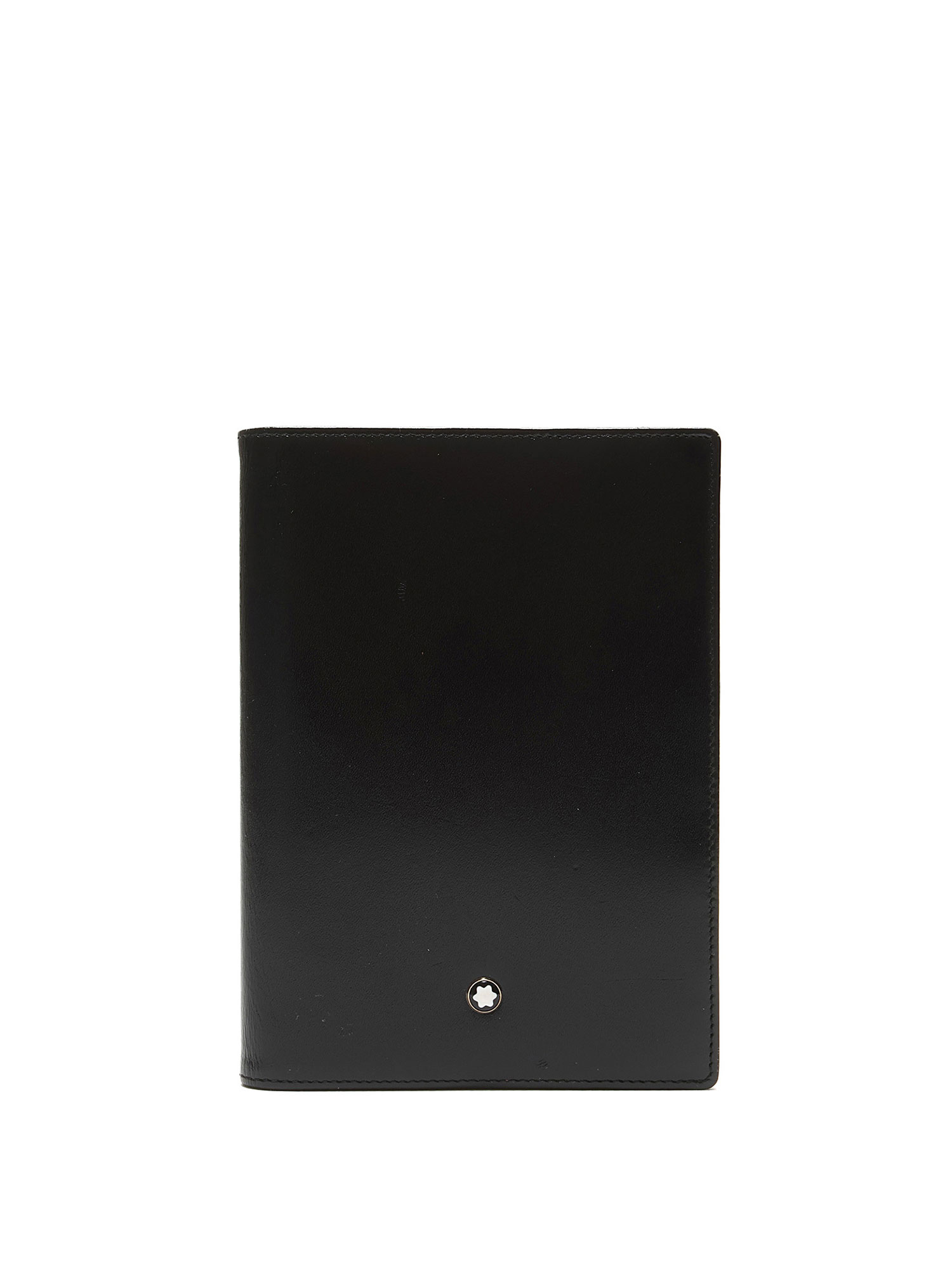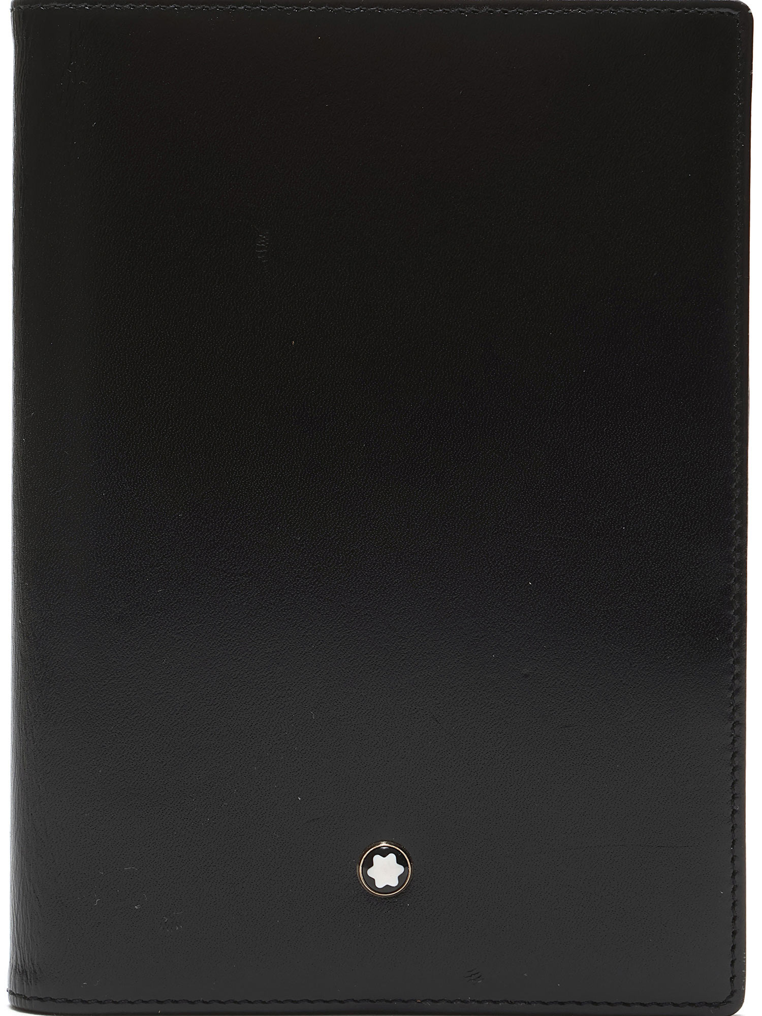 Full-grain leather wallet in deep black. Features a polished metal emblem and tonal stitching. Interior includes multiple card slots with embossed logo.