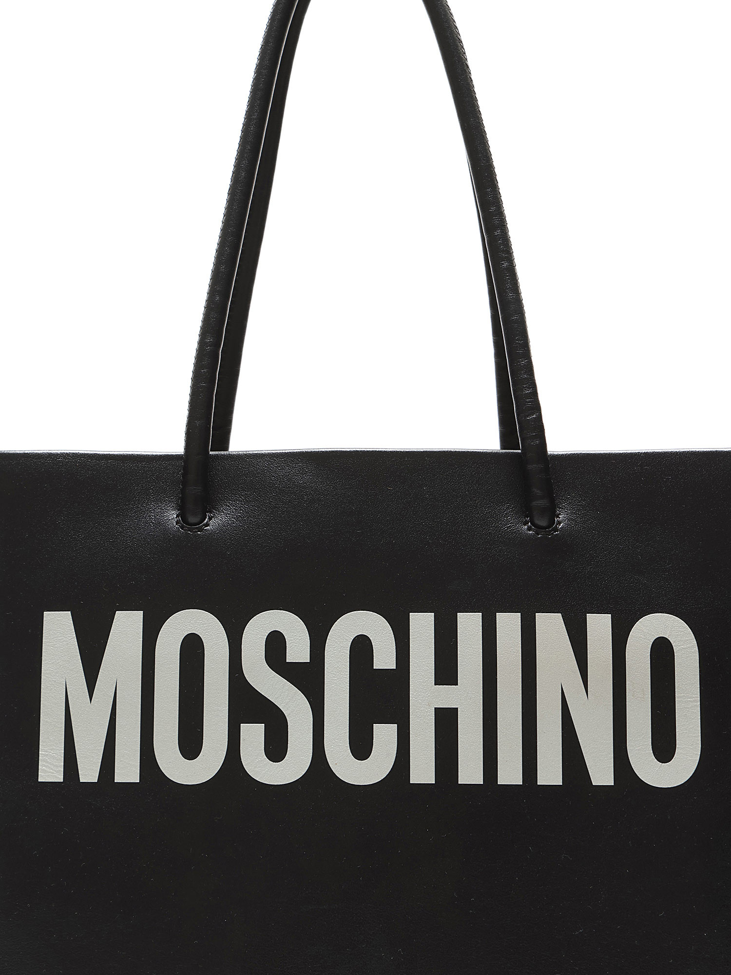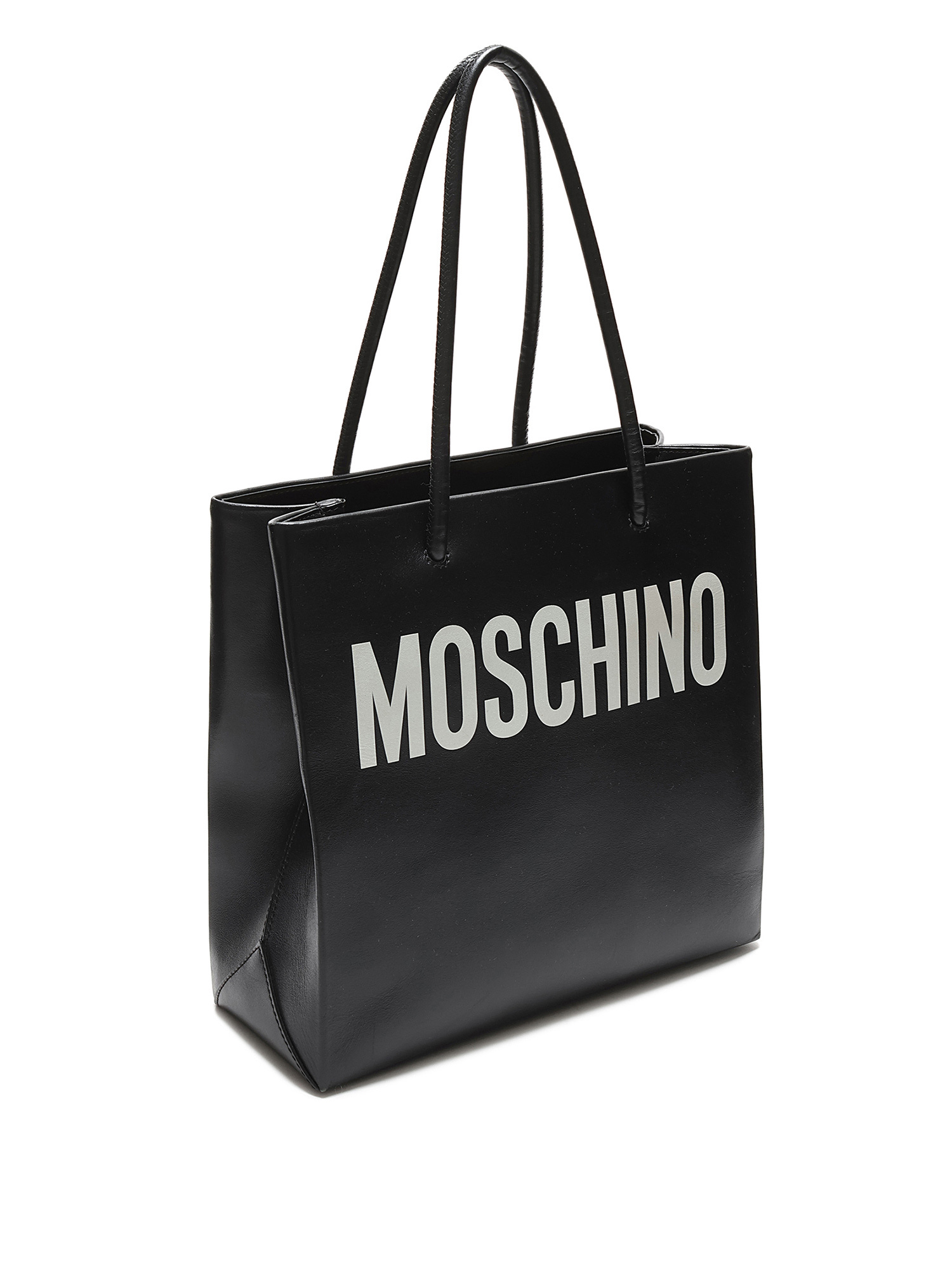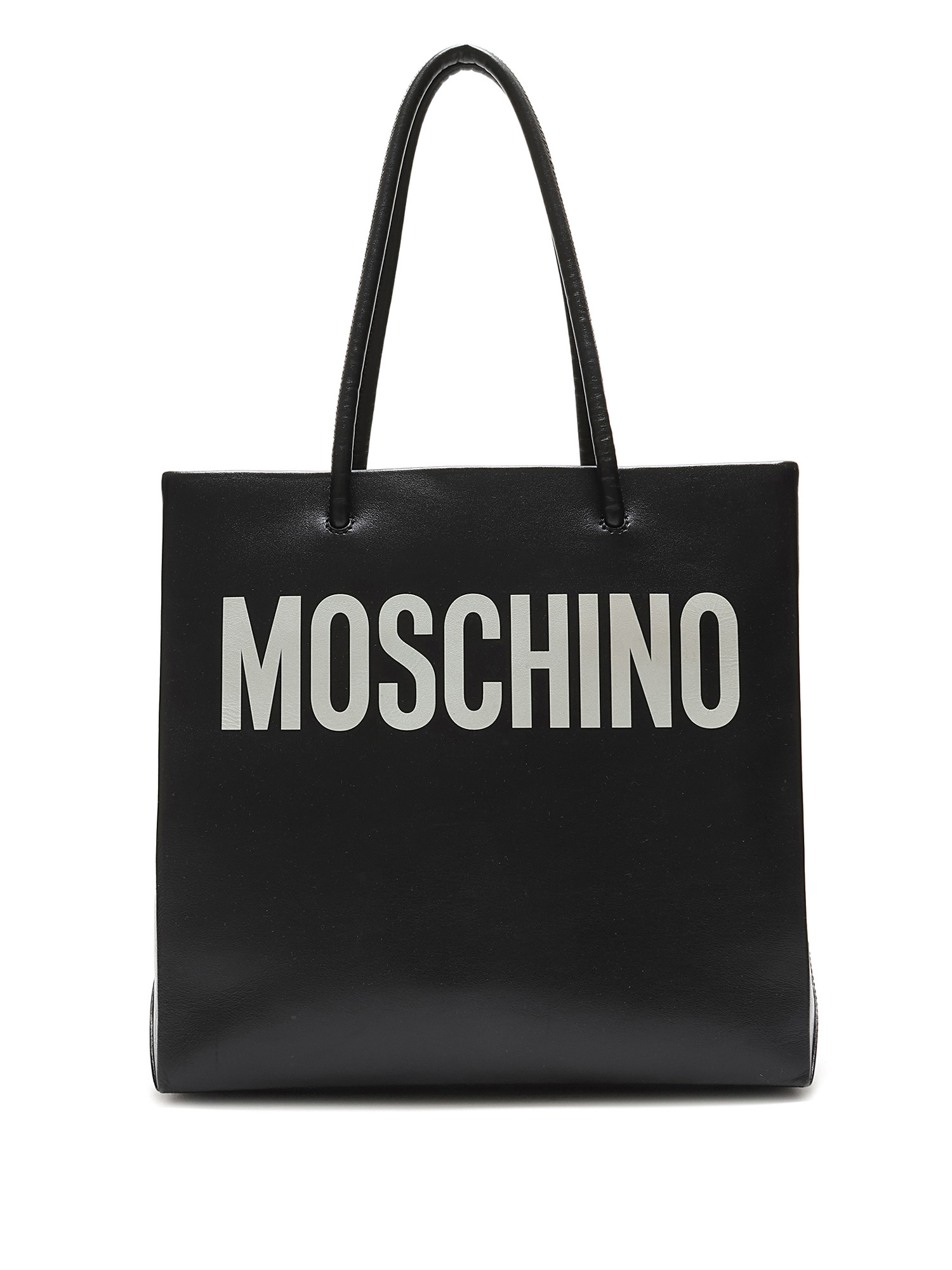 Black leather tote bag with MOSCHINO signature white lettering. Open top design with fixed leather handles. Tonal stitching throughout. Includes dustbag.