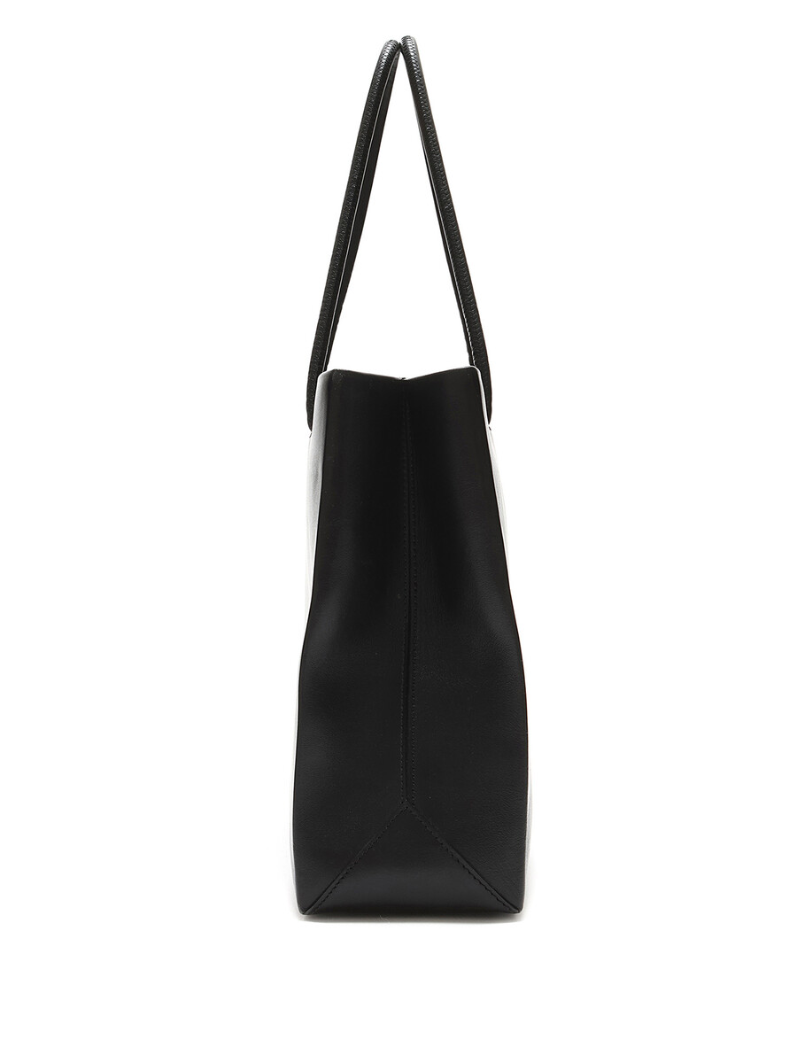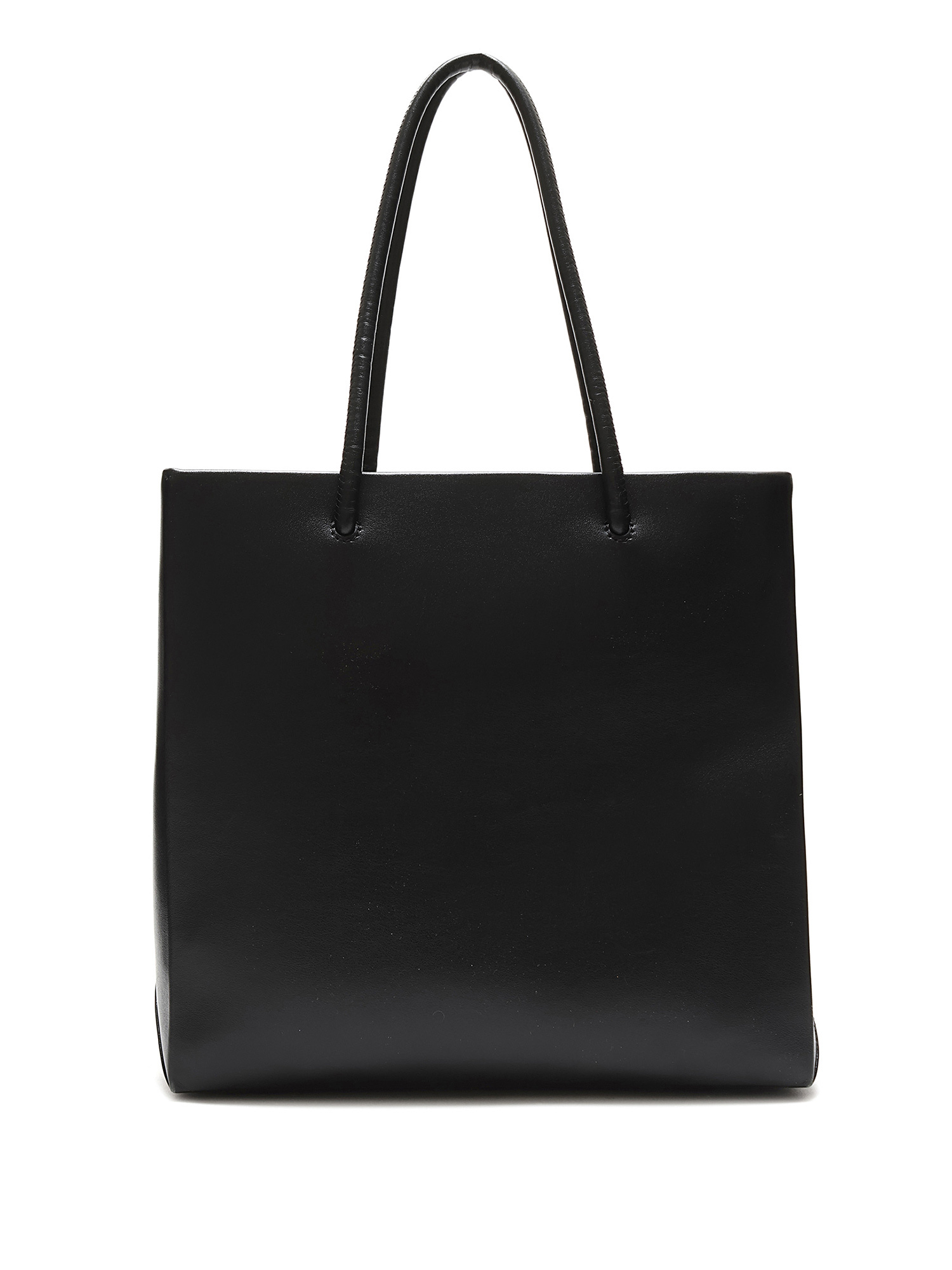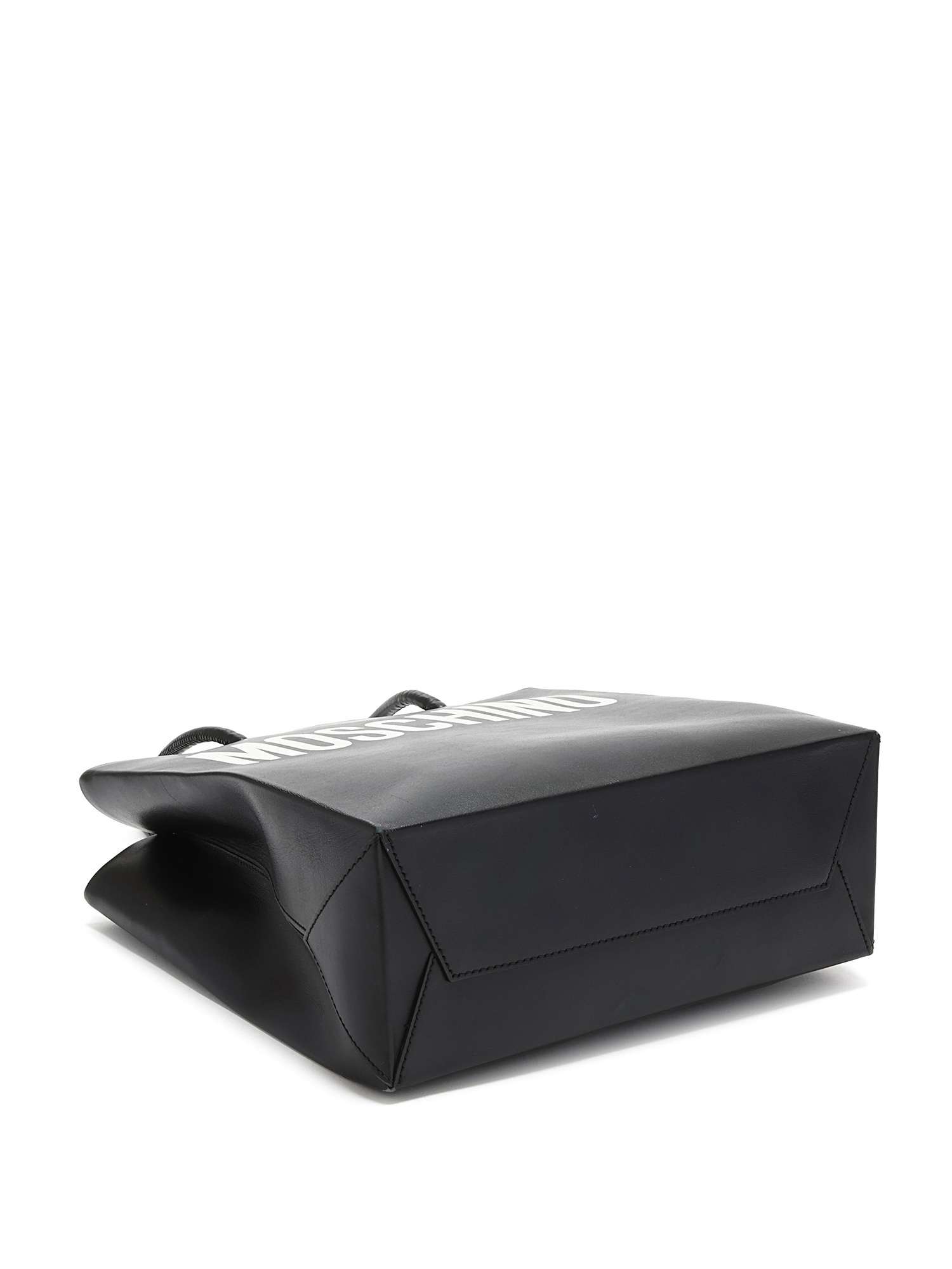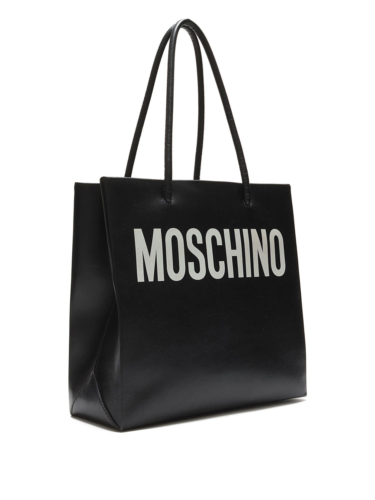Black leather tote bag with MOSCHINO signature white lettering. Open top design with fixed leather handles. Tonal stitching throughout. Includes dustbag.