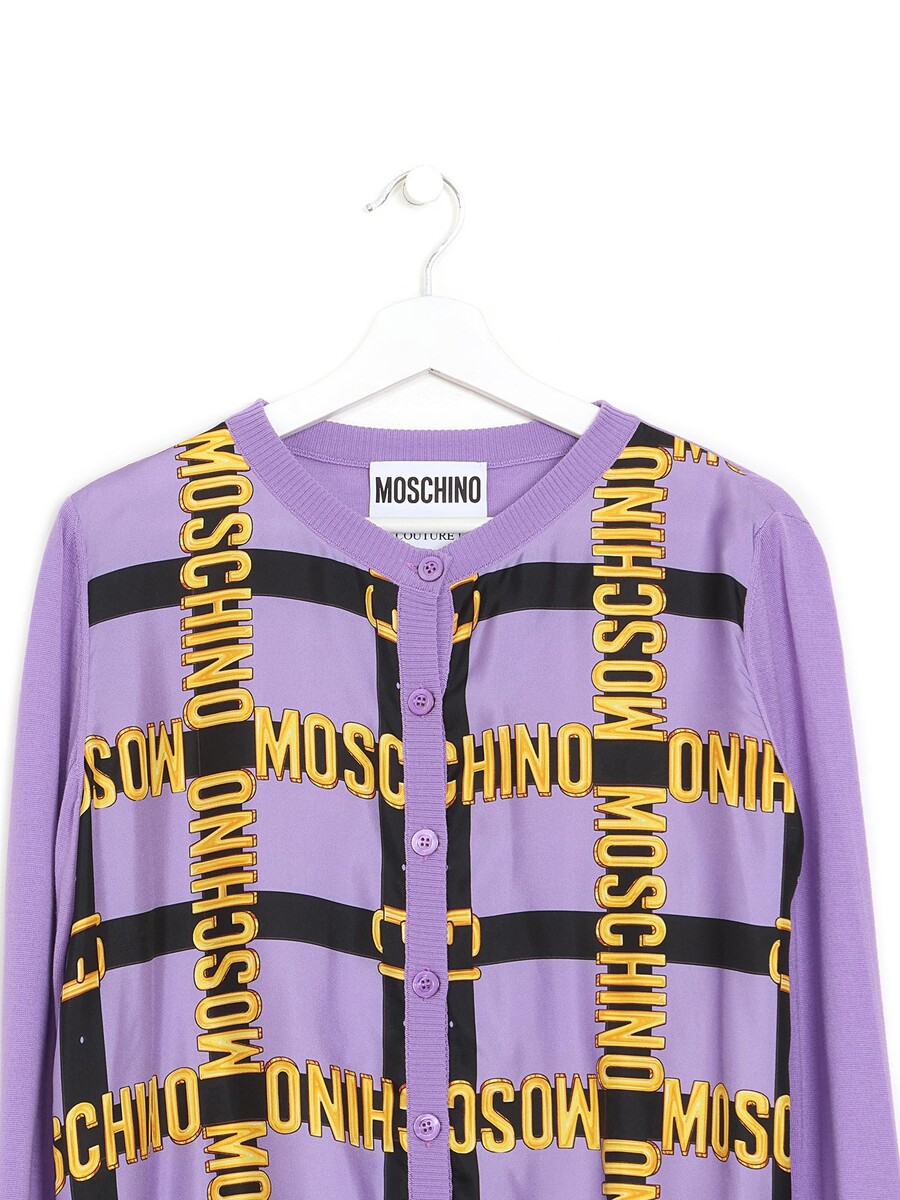 Long sleeve cardigan with Moschino logo motif and purple and black stripes. Button closure. Round neckline.