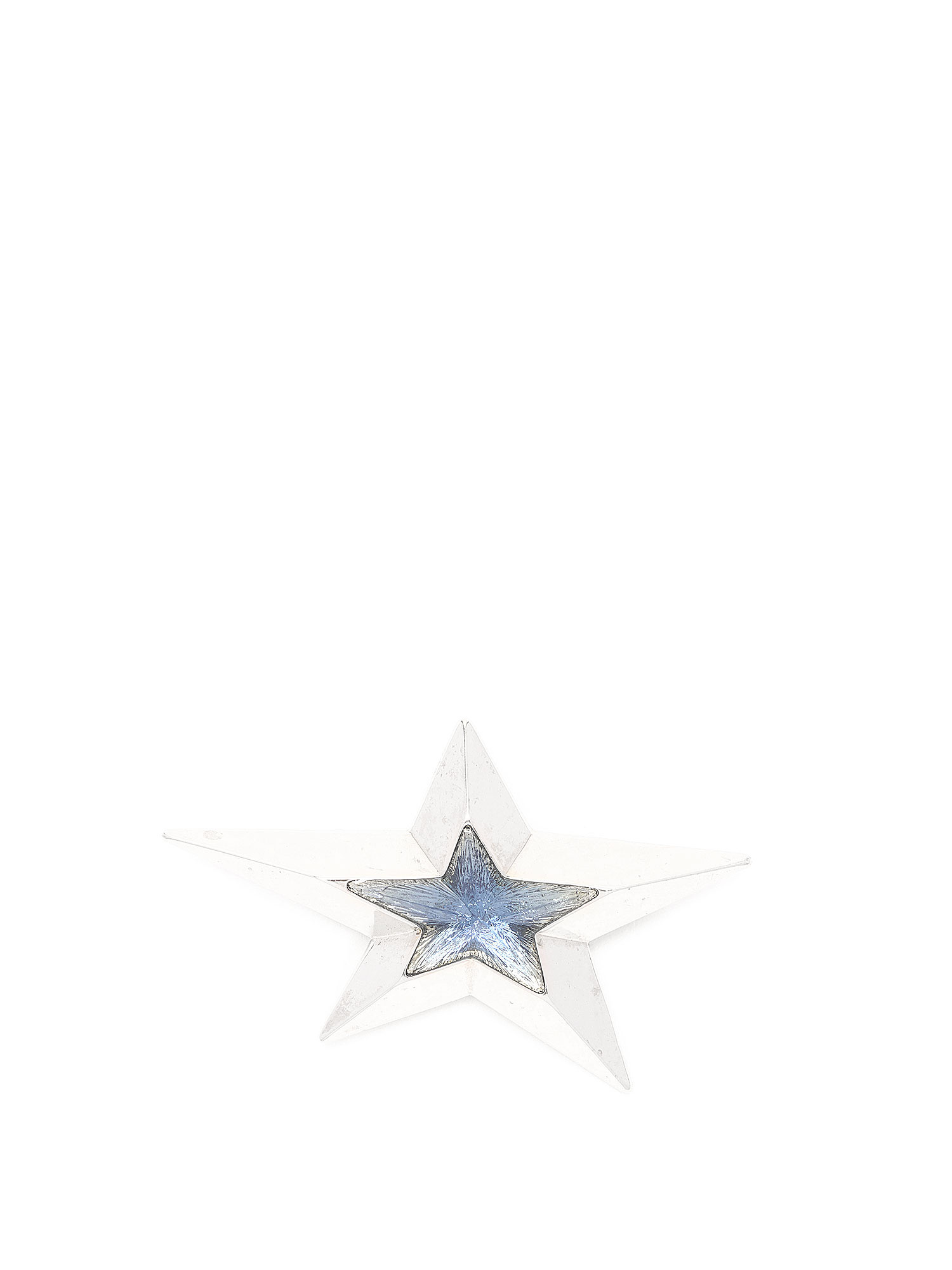 Metal star-shaped brooch with a blue center and silver finish. Pin attachment.
