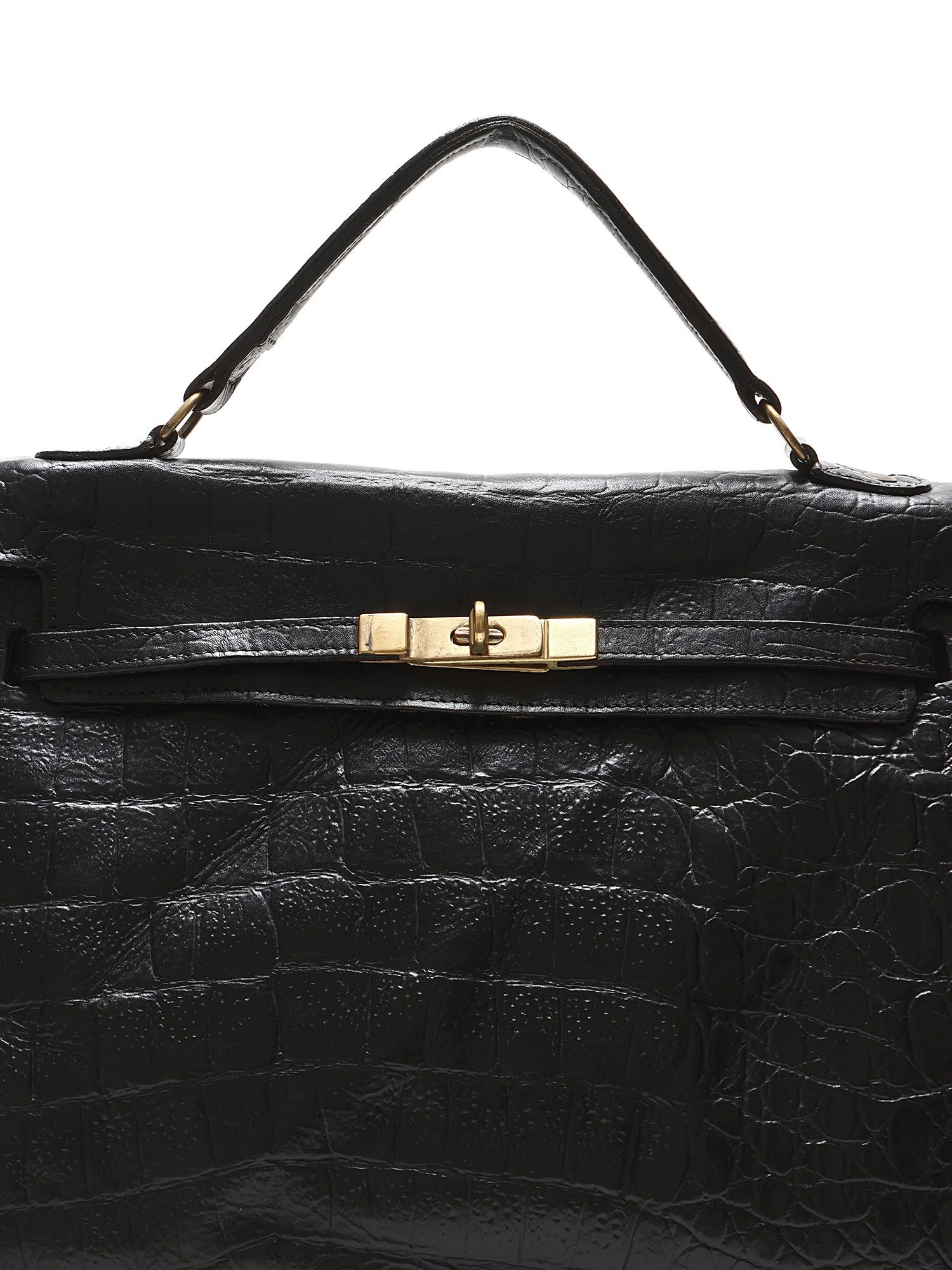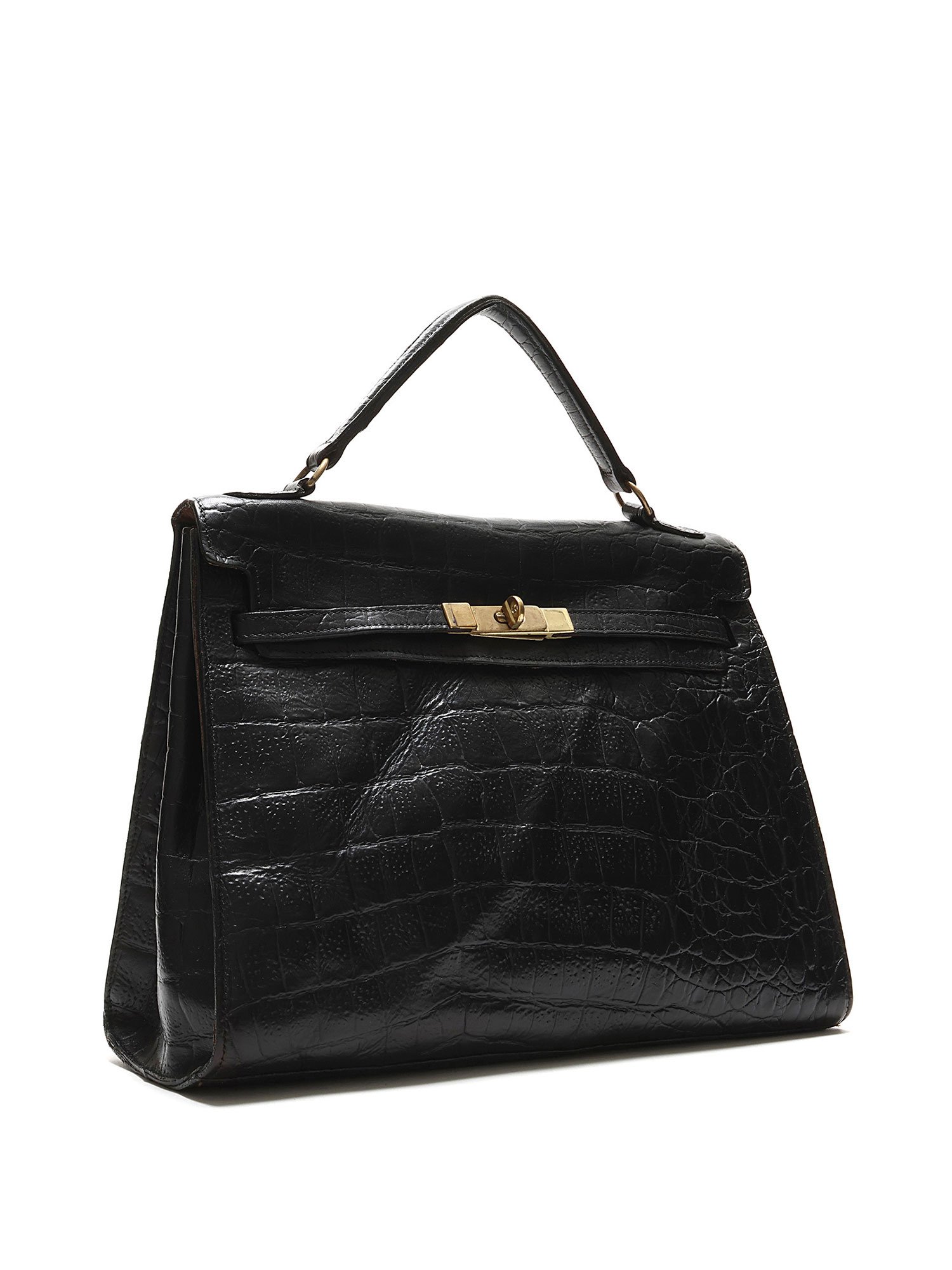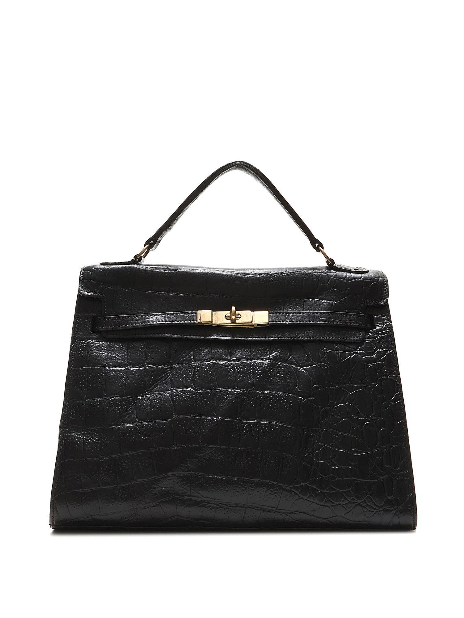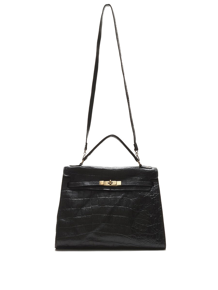 Croc-embossed leather handbag in black featuring a structured, timeless design. Elegant turn-lock closure with a single top handle and optional shoulder strap. Gold-tone hardware for a luxurious touch.