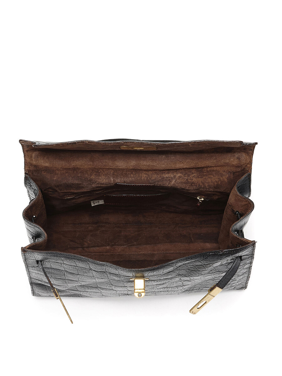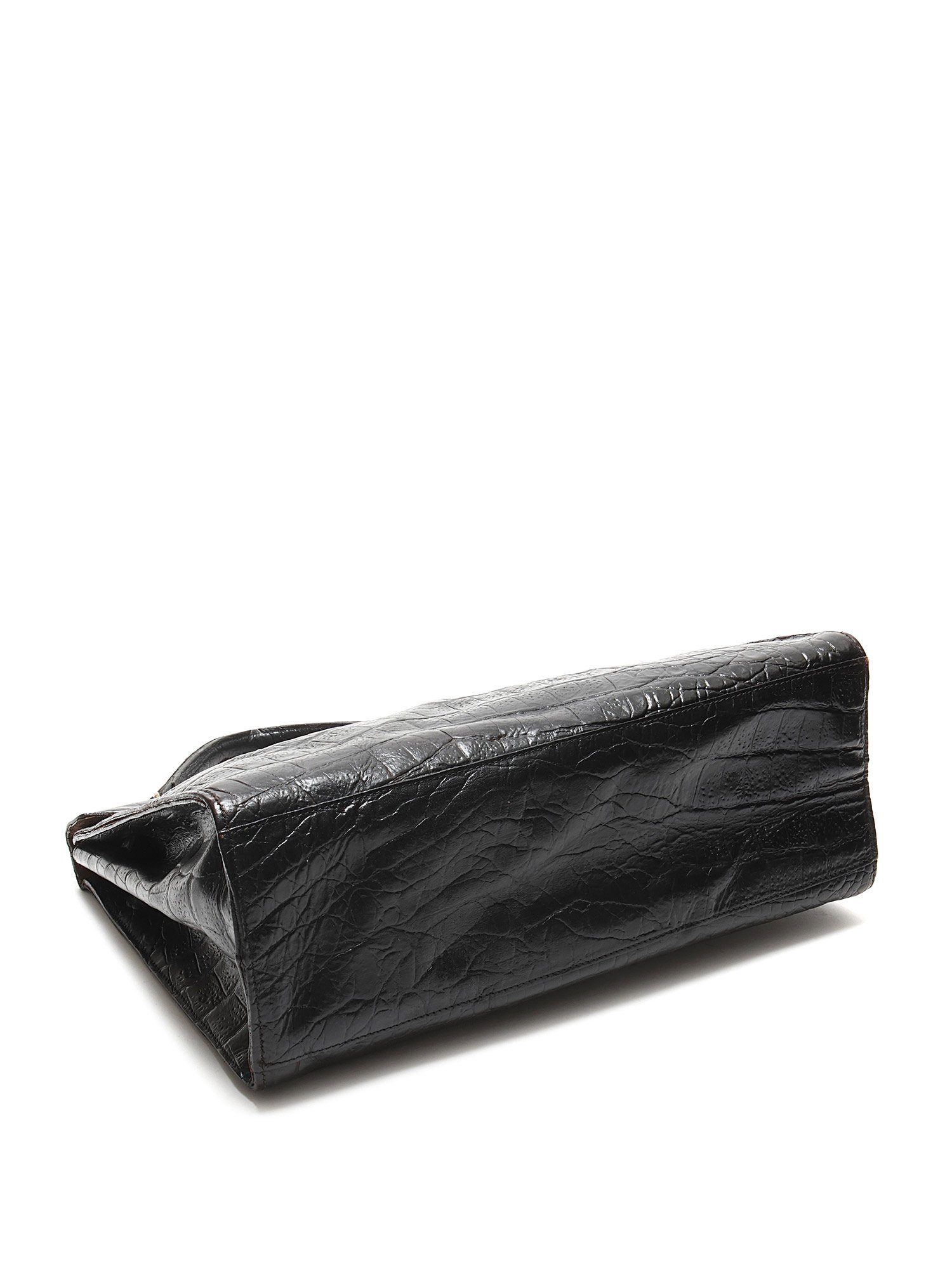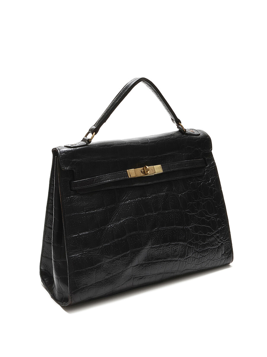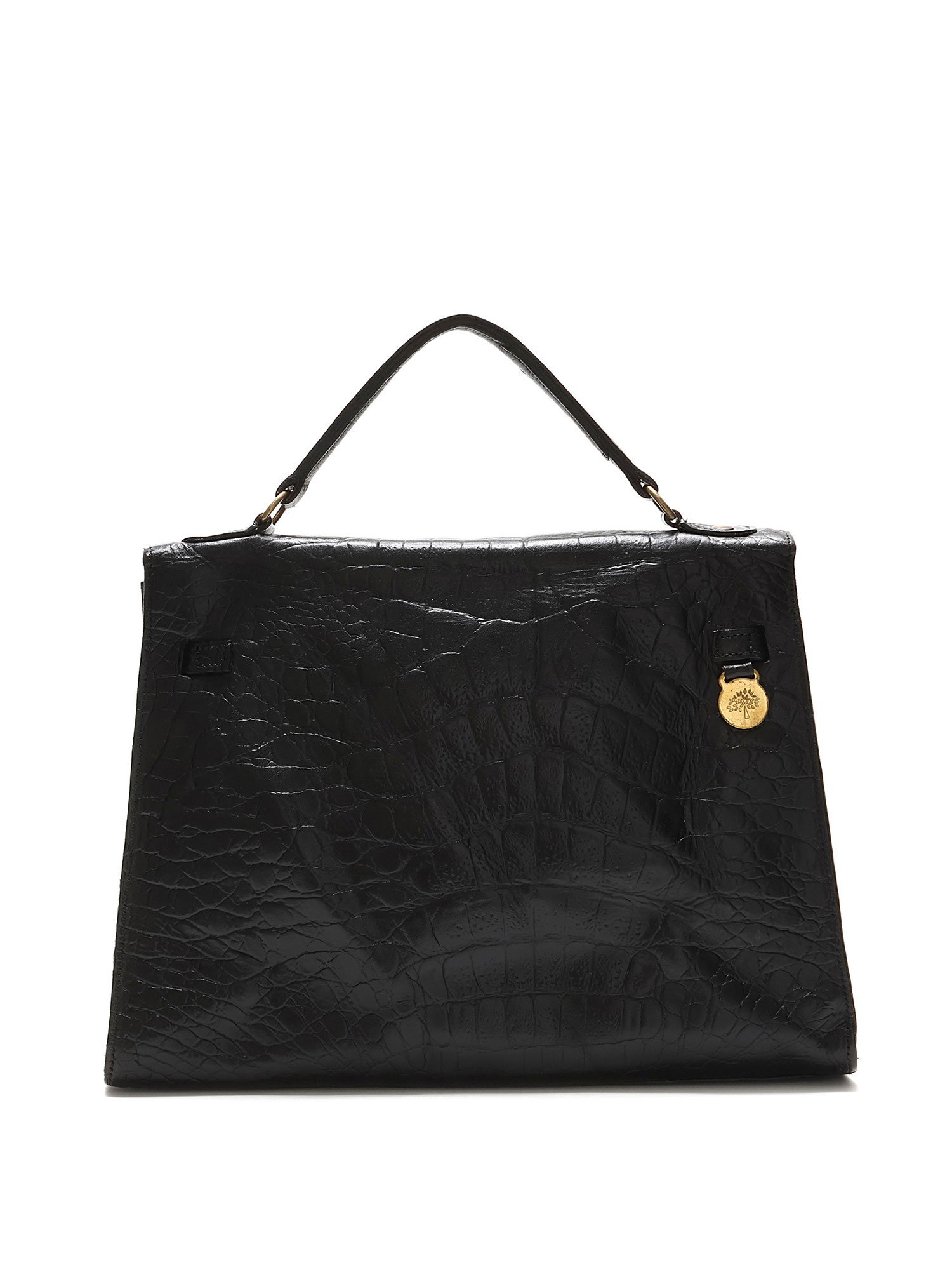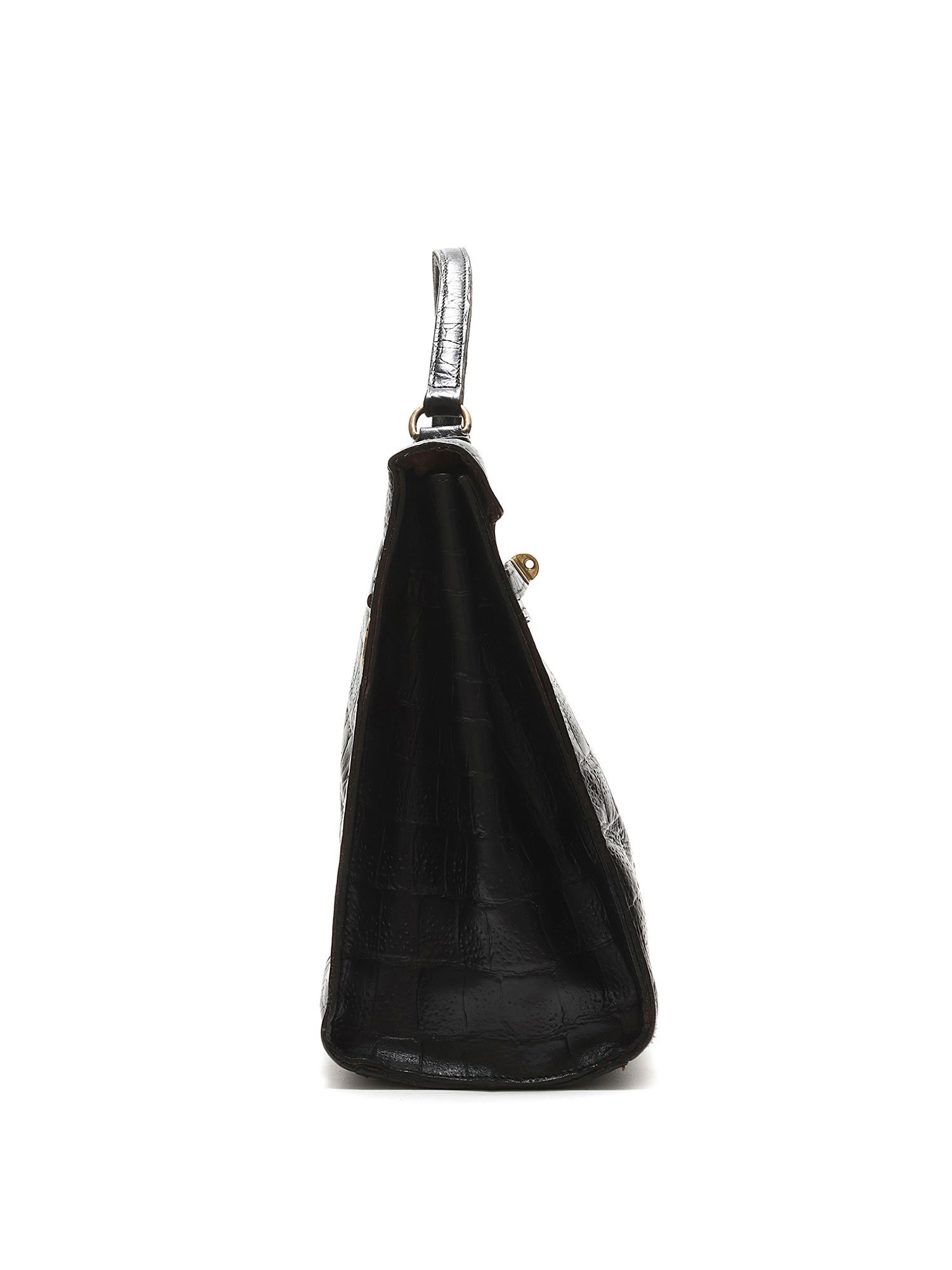 Croc-embossed leather handbag in black featuring a structured, timeless design. Elegant turn-lock closure with a single top handle and optional shoulder strap. Gold-tone hardware for a luxurious touch.