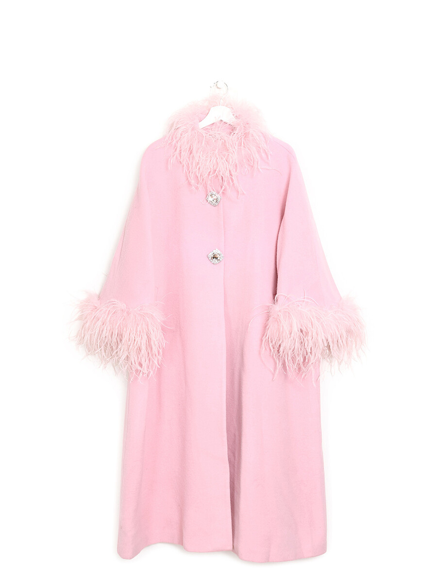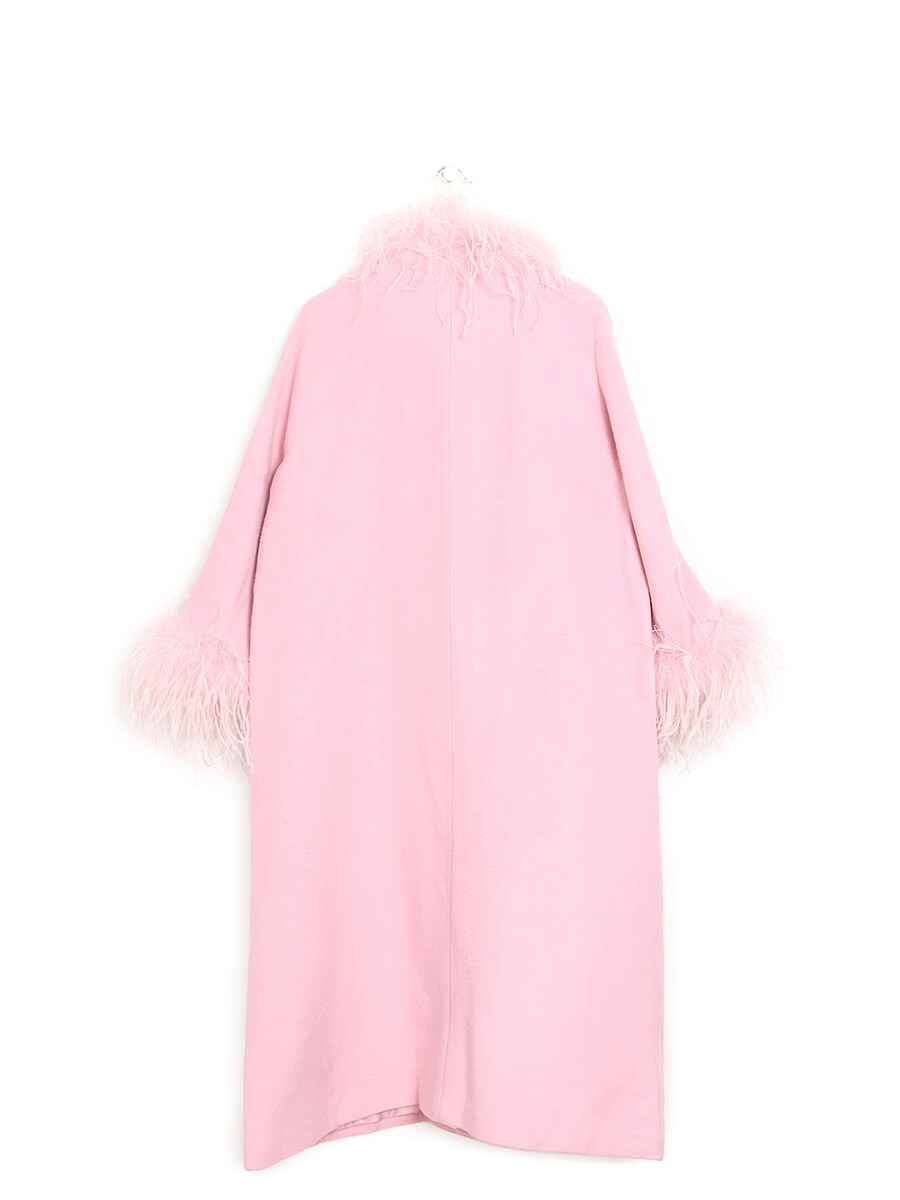 Long wool coat in pink featuring elegant feather trim.