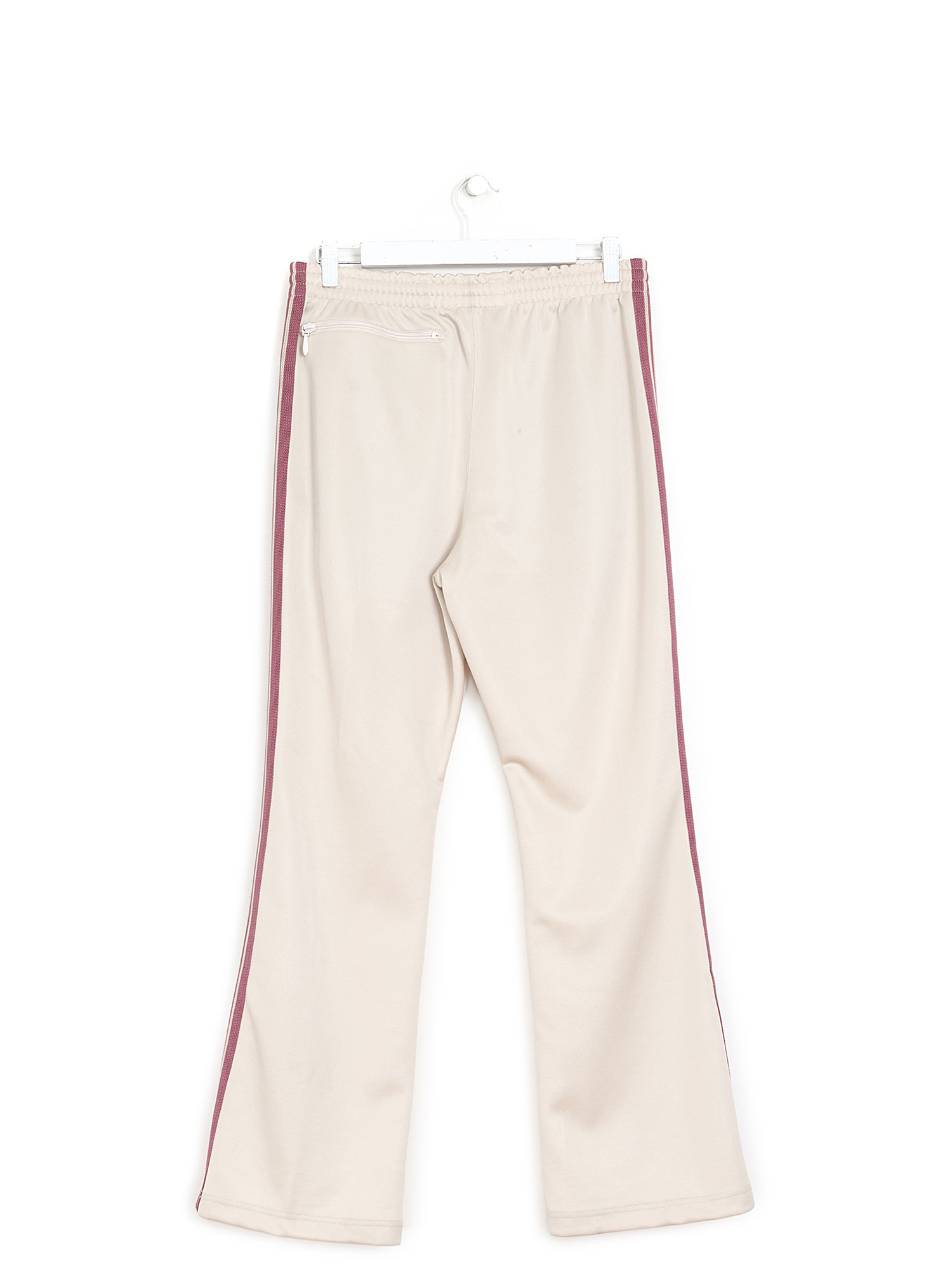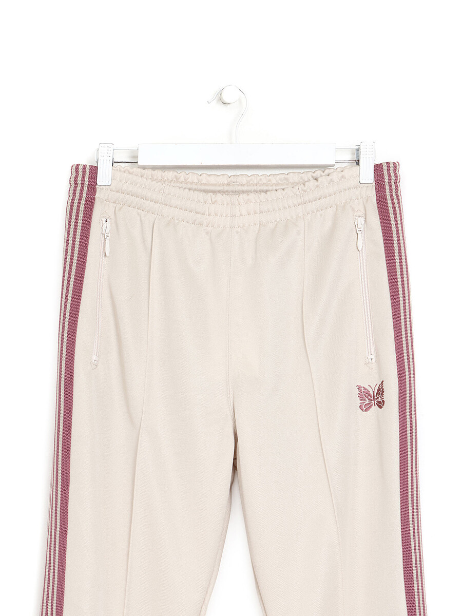 Beige track pants featuring embroidered logo in purple. Elastic waistband with adjustable drawstring. Side pockets. Lightweight design.
