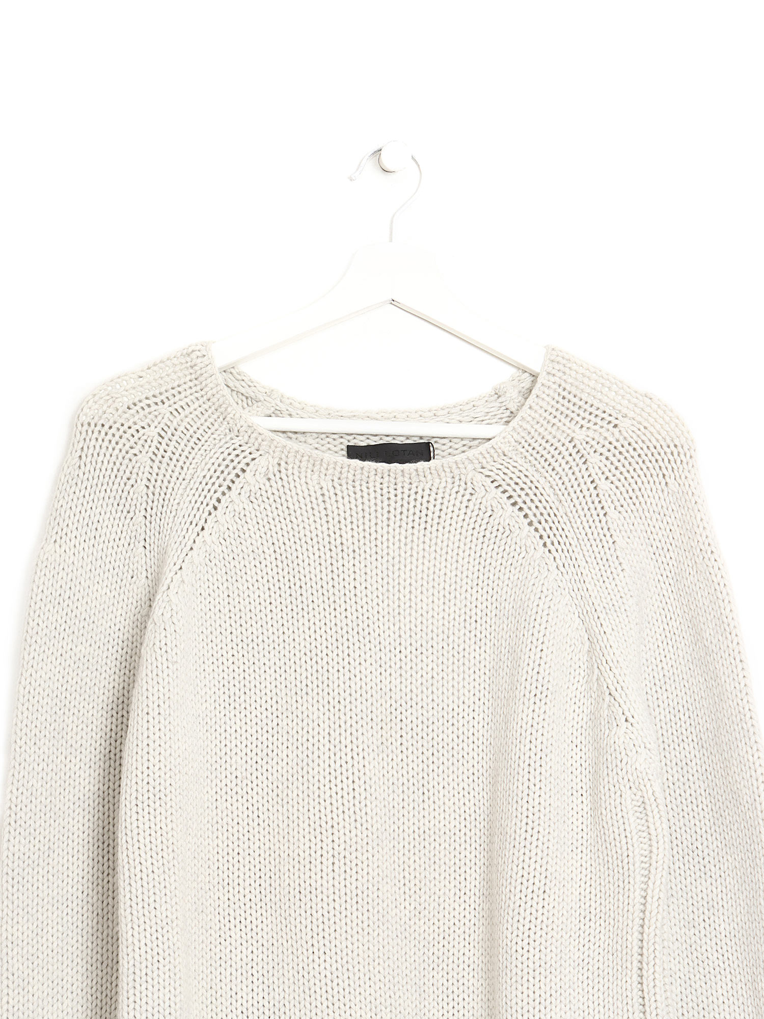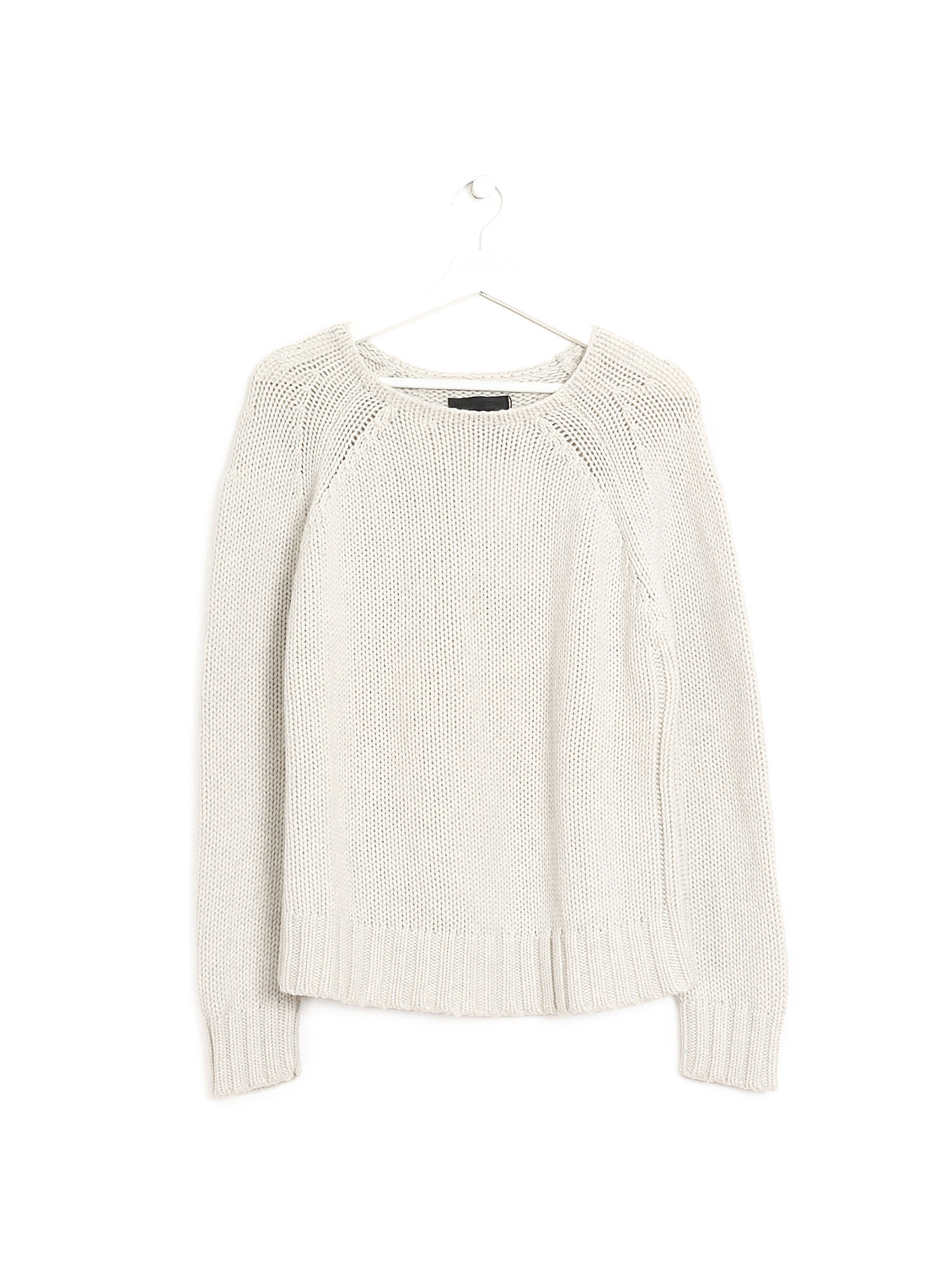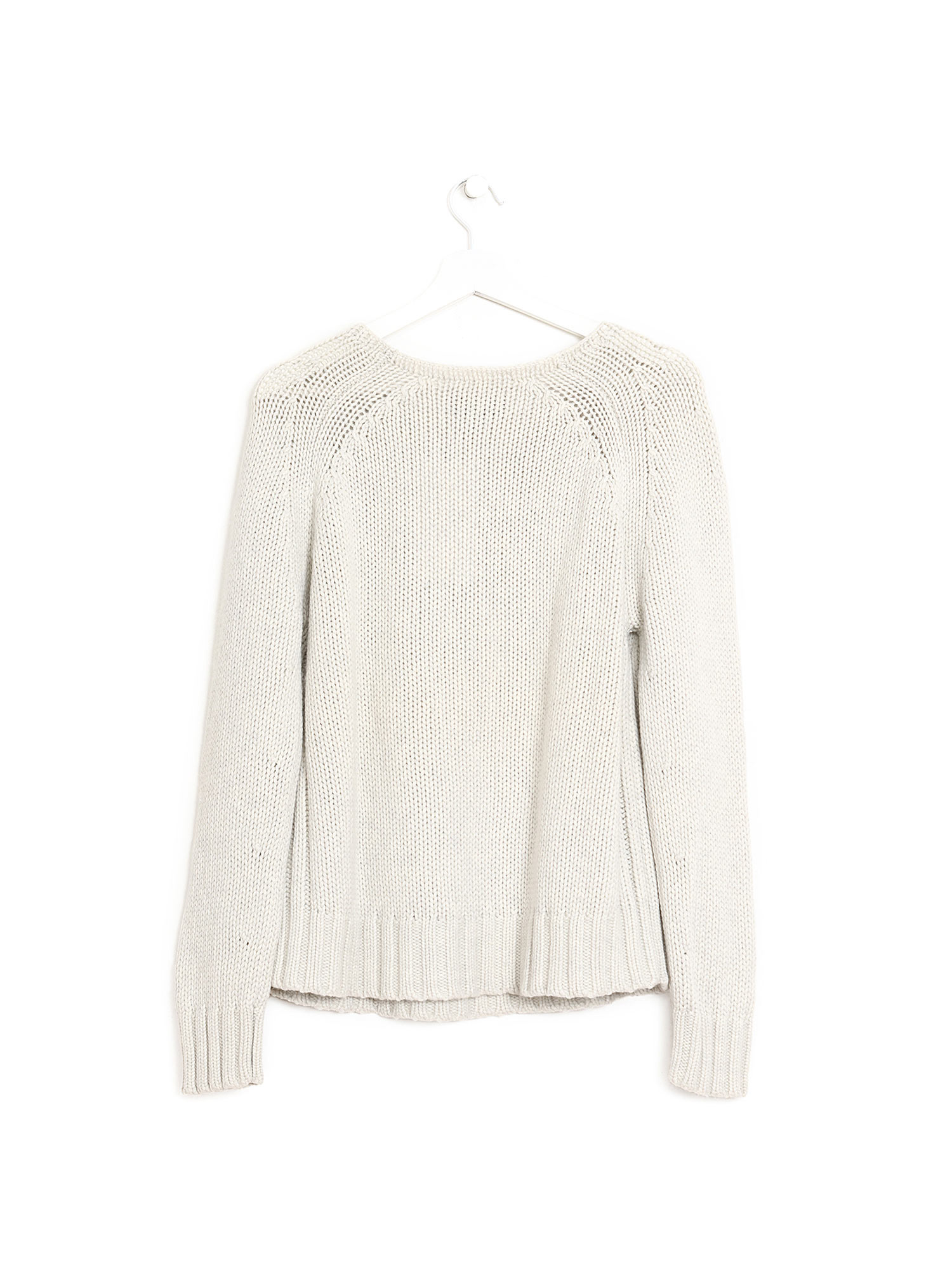 Knit long sleeve sweater in grey. Round neck. Soft texture with subtle ribbed detailing at cuffs and hem.