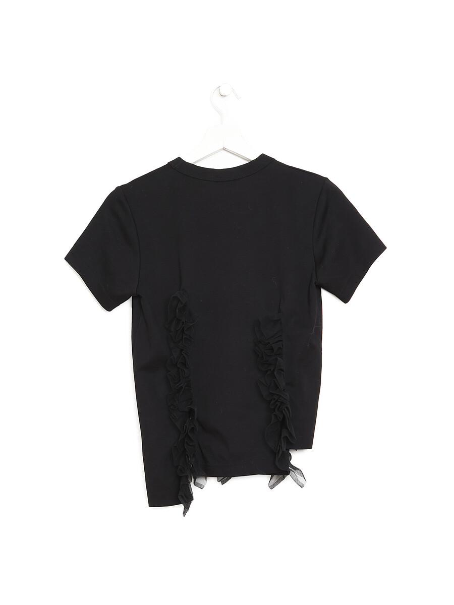 Short-sleeve t-shirt with ruffle detailing and button placket at the front.