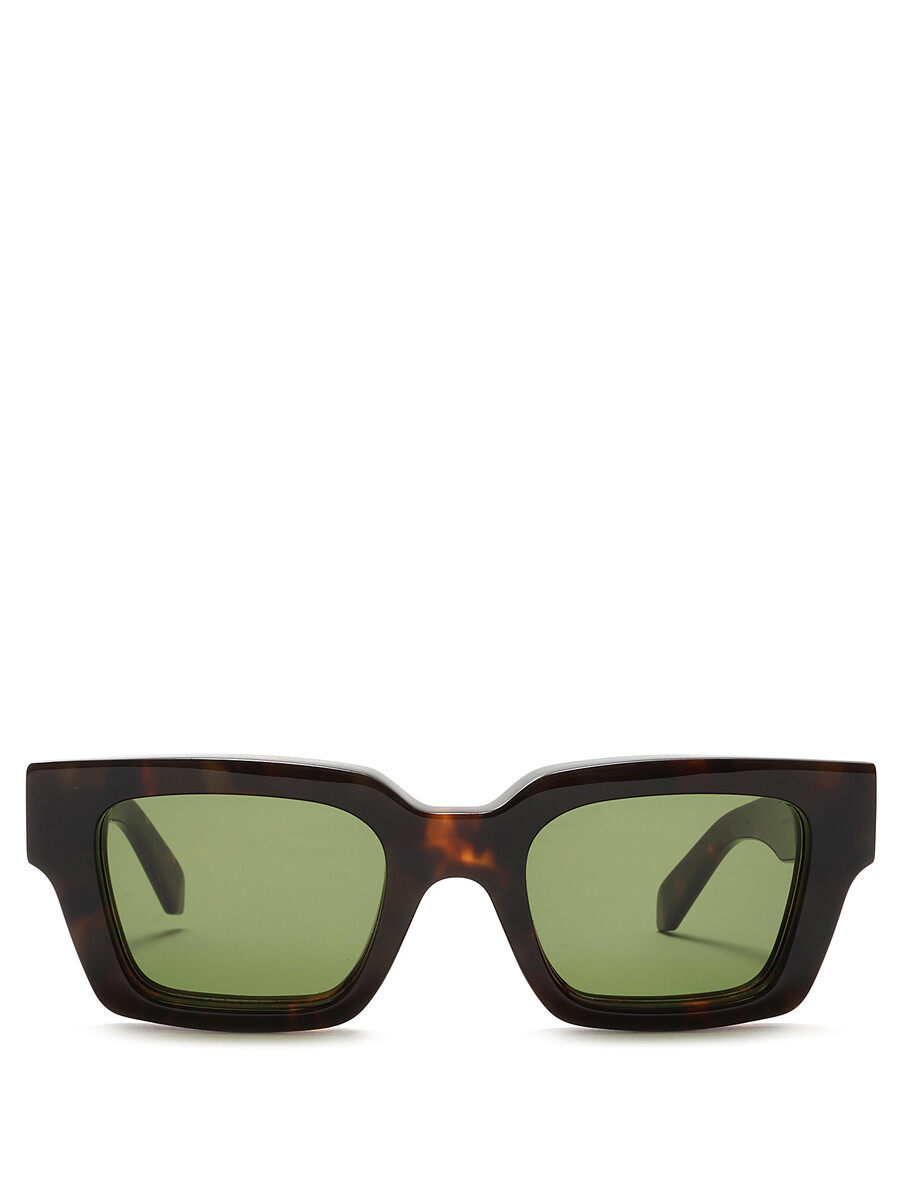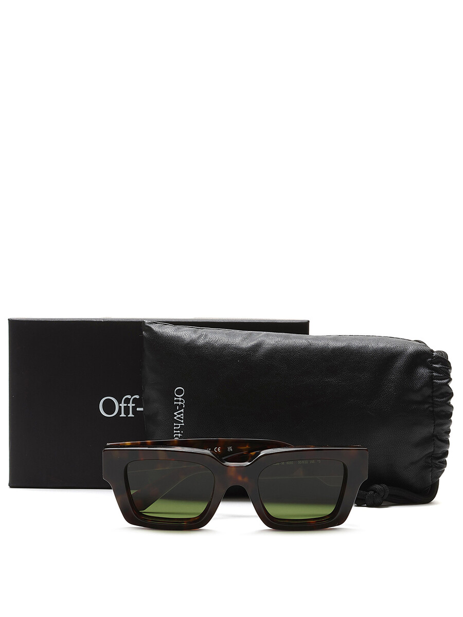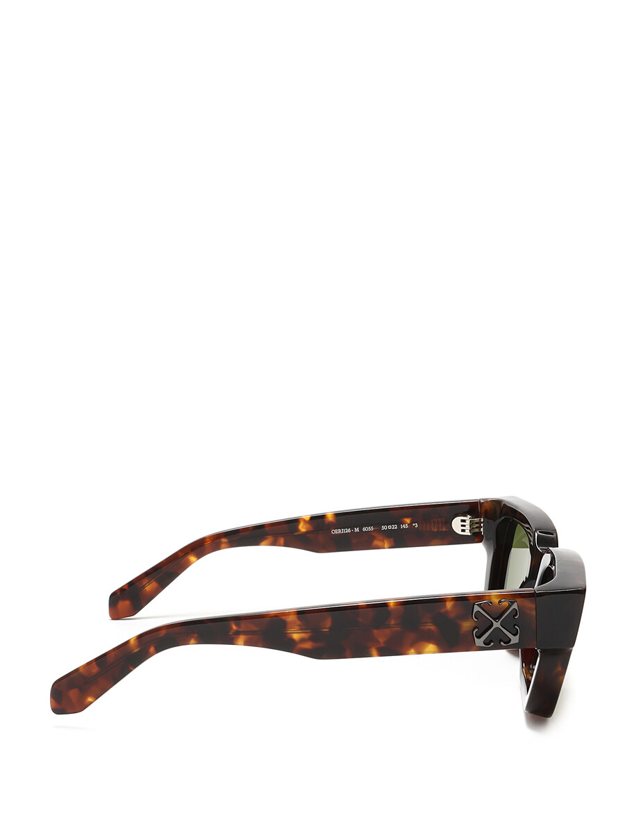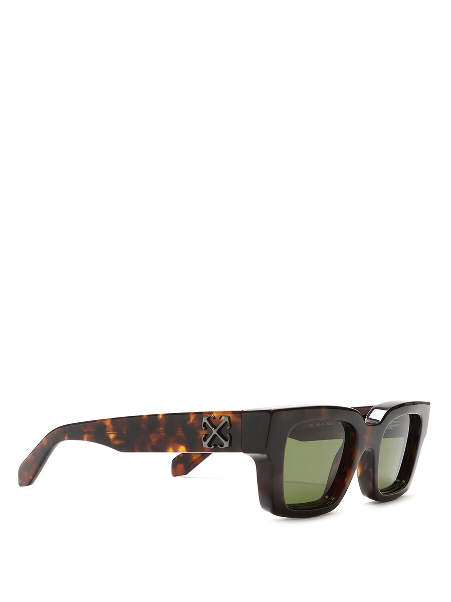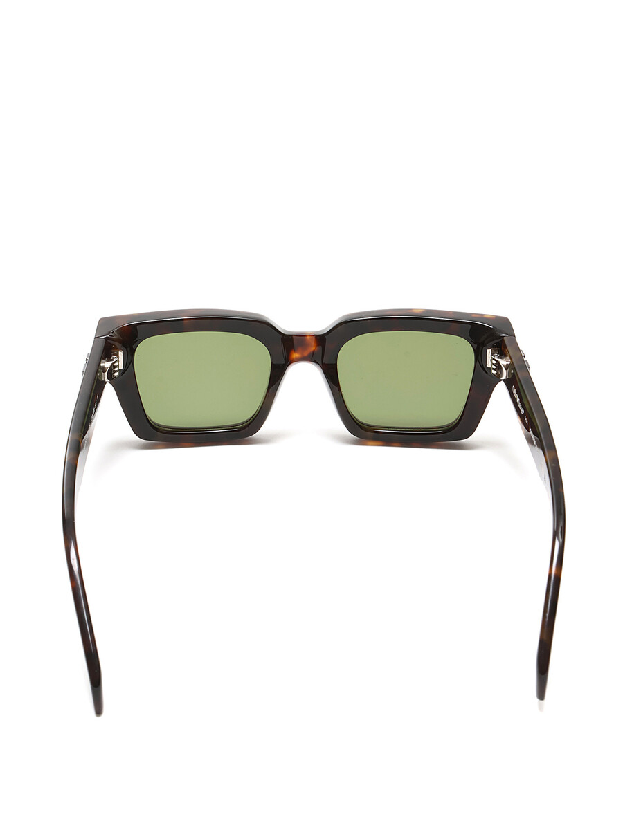 Square sunglasses featuring a signature tortoise shell pattern in rich brown. Silver-tone logo emblem on temples. Includes branded box and pouch.