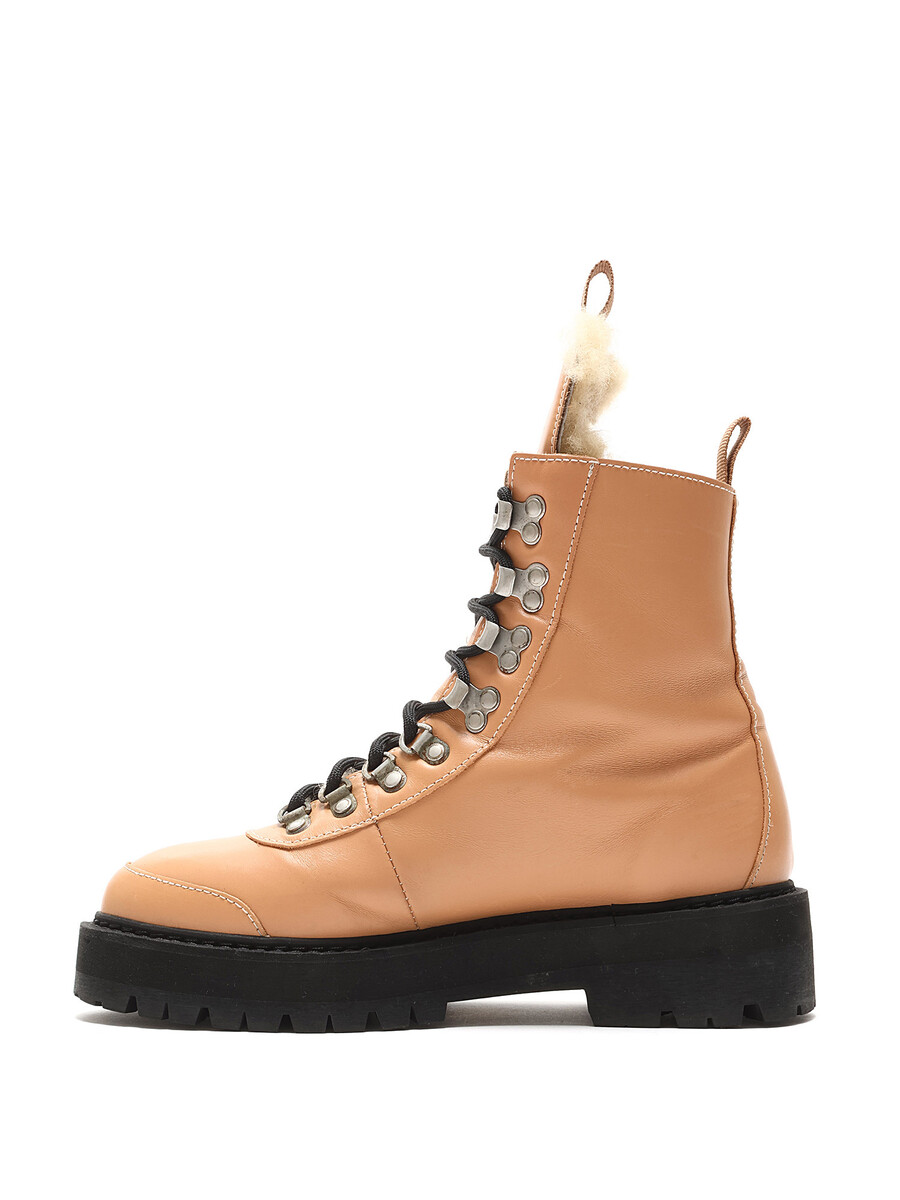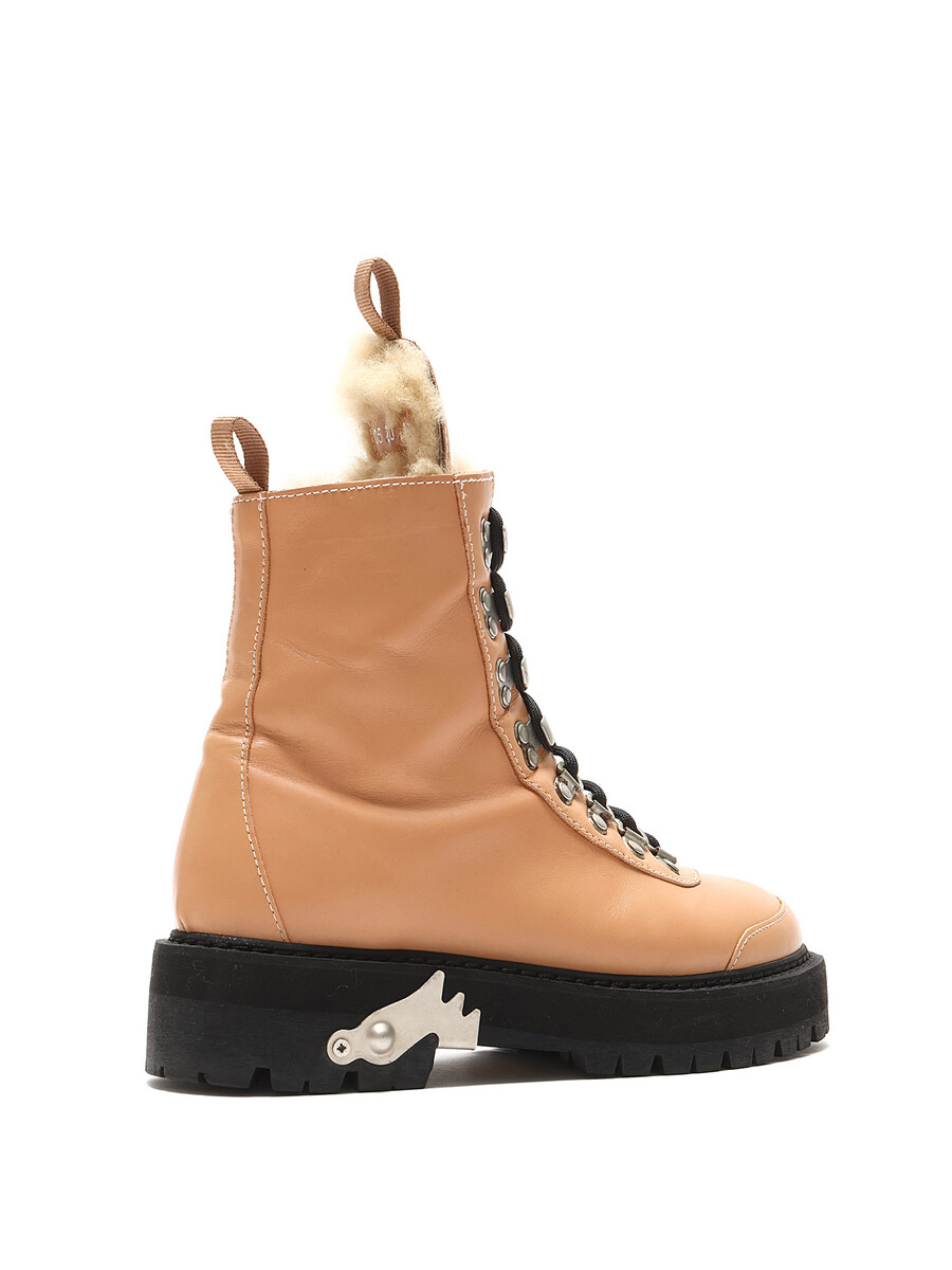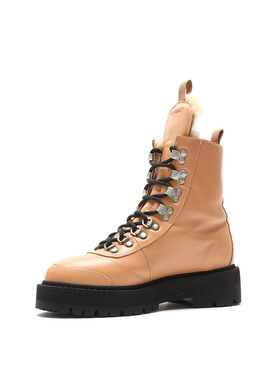 Brown leather ankle hiking boots with shearling lining. Lace-up closure with black metal hooks and eyelets. Round toe style. Lug rubber sole.