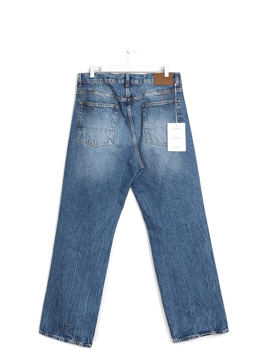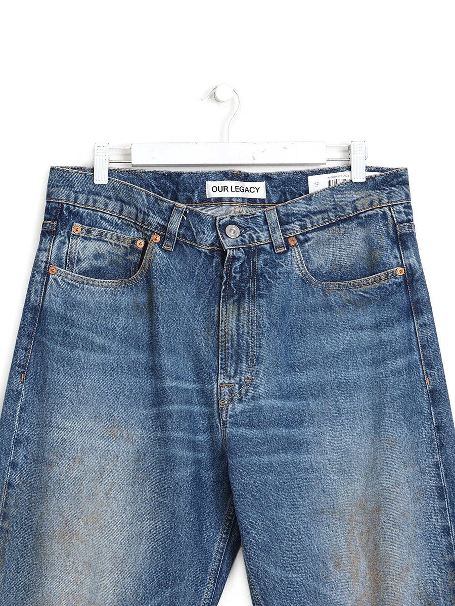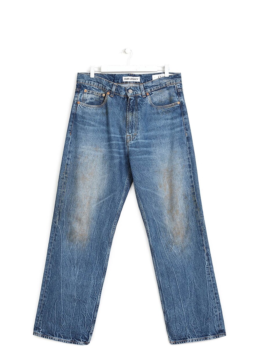 Straight-leg denim jeans in blue with distressed details and brown knee patches. Button and zip closure.