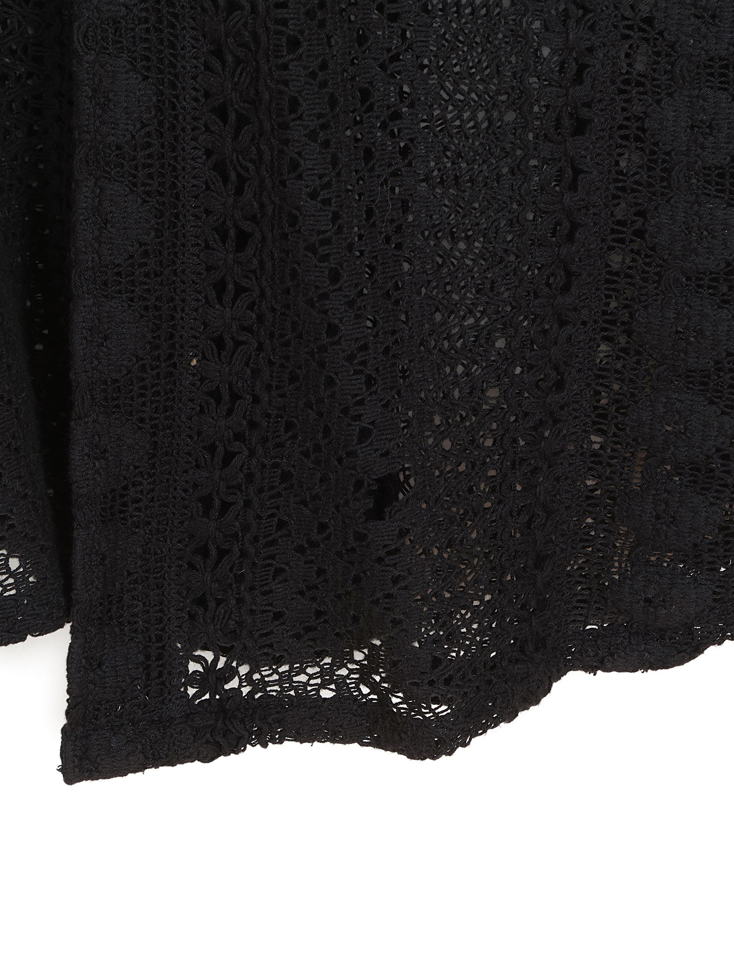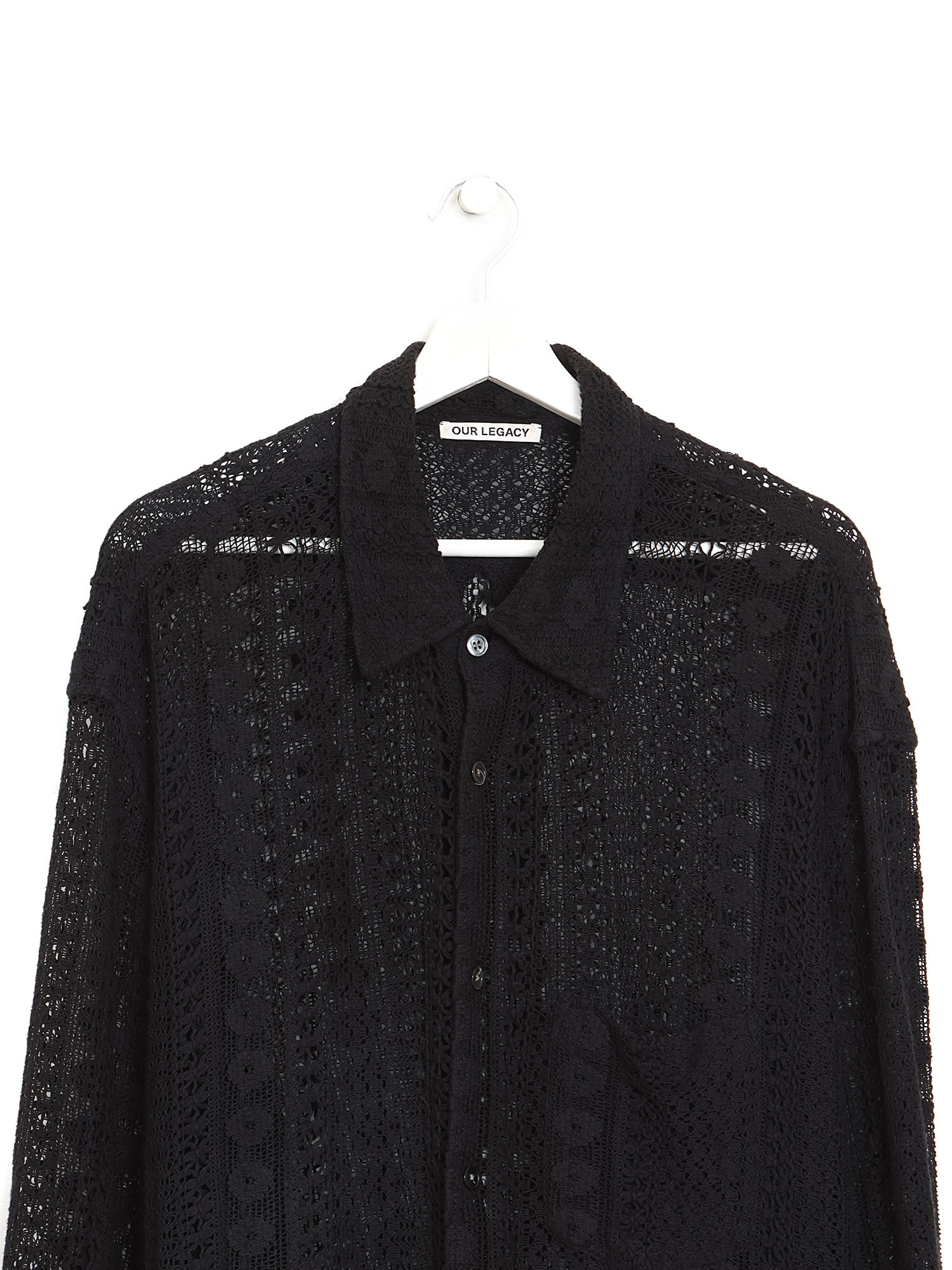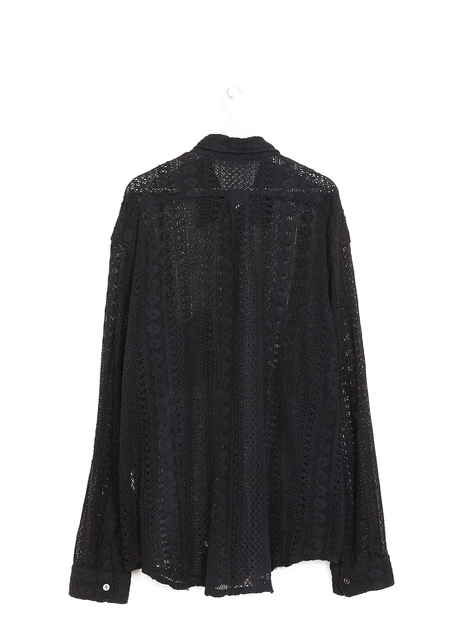 Open knit long sleeve shirt in black. Button closure. Classic collar.