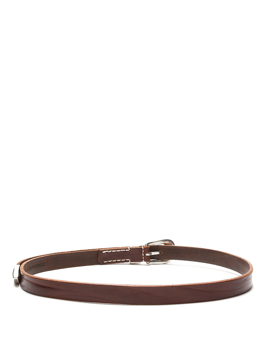 Brown thin leather belt featuring silver-tone buckle closure. Engraved logo on both the belt and the buckle.