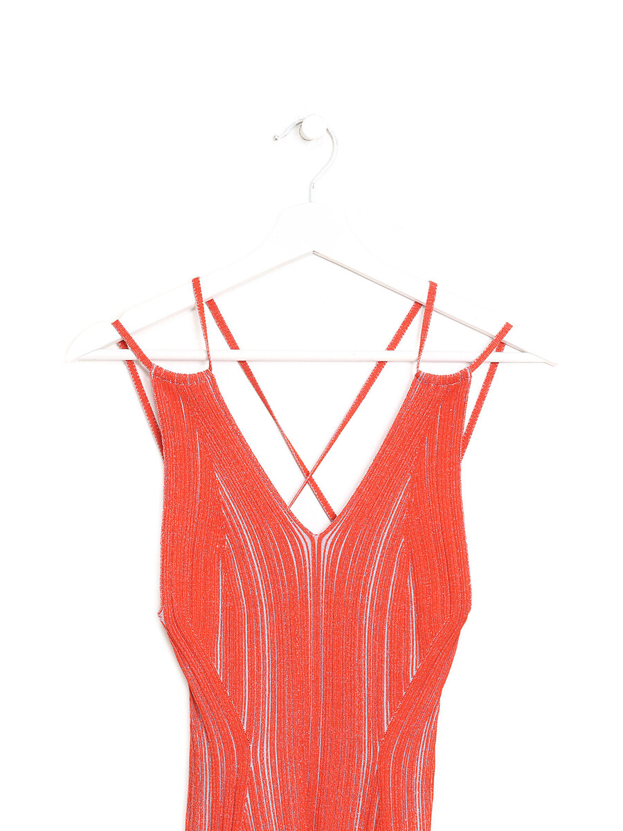Sleeveless top with a bold red and purple striped pattern. V-neckline. Tailored fit. Lightweight and breathable fabric.
