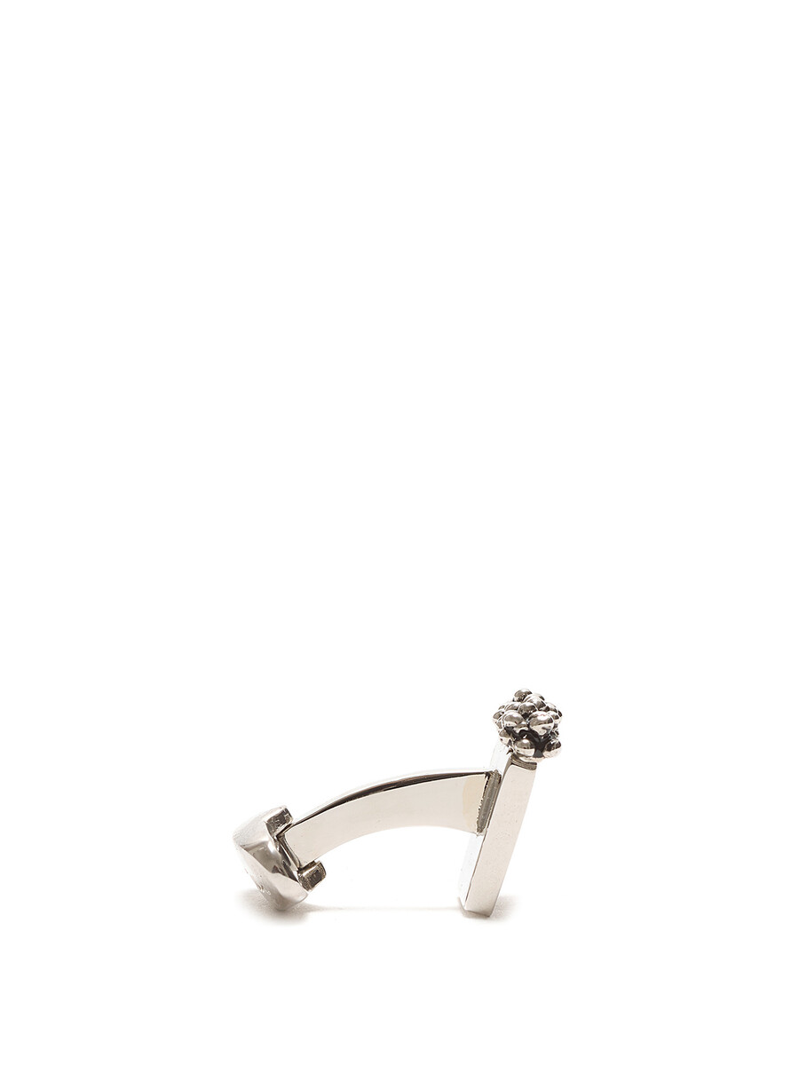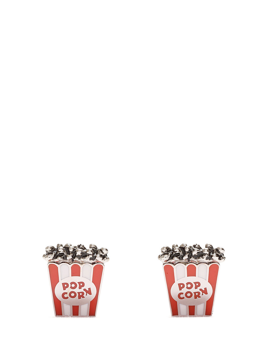 Metal cufflinks featuring a vibrant red and white popcorn bucket design. Silver-tone finish. Comes with a box.