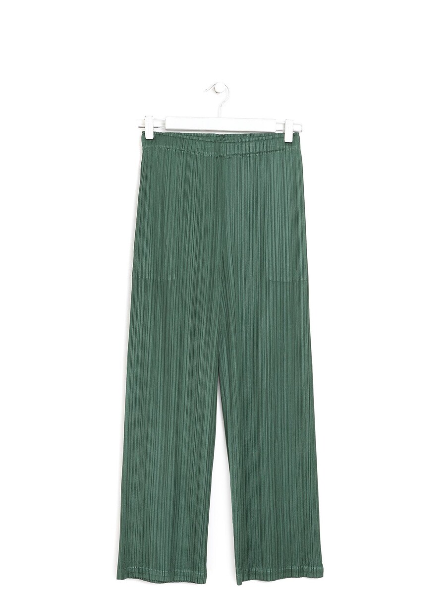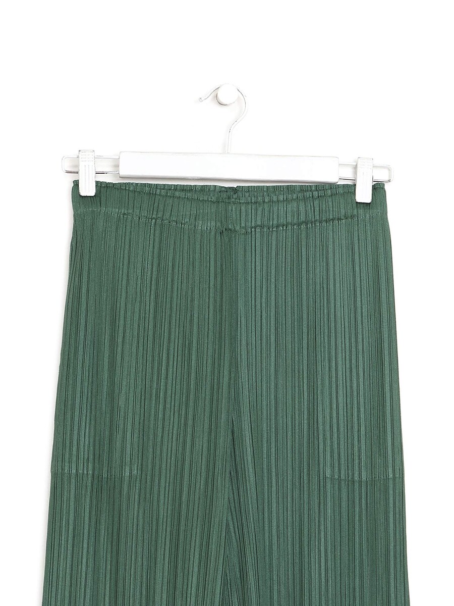 Pleated green trousers with an elastic waistband. Made from 100% polyester.