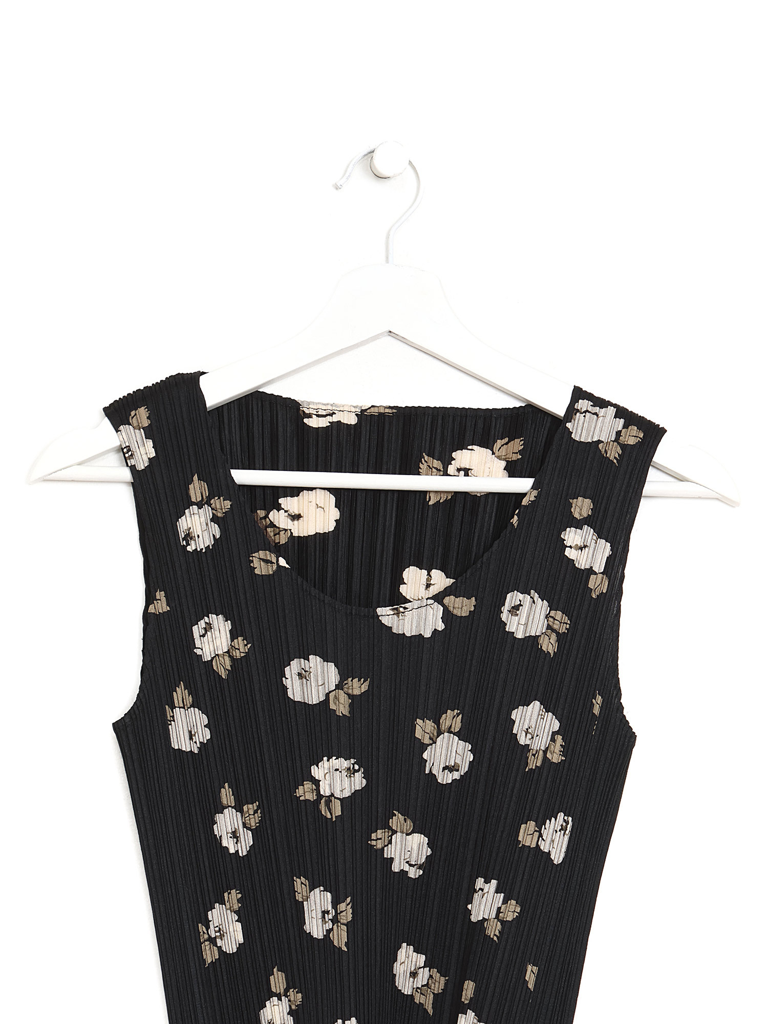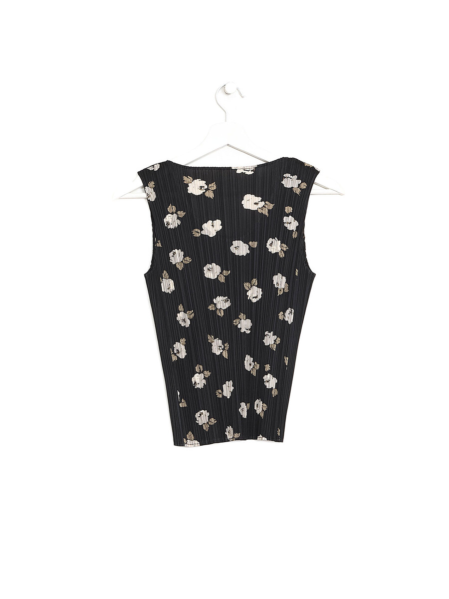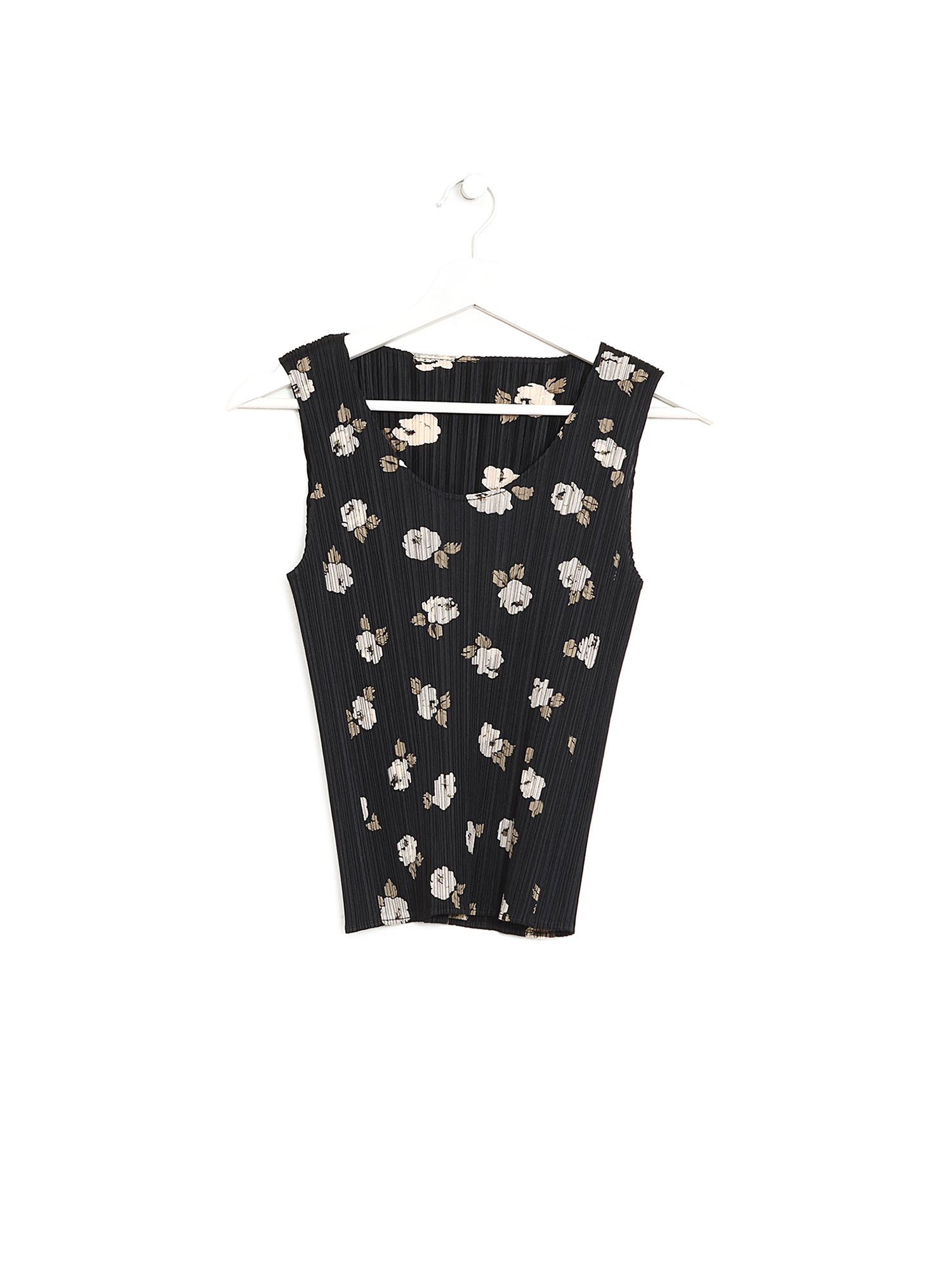 Sleeveless top with a floral pattern in black. Features a round neckline and pleated fabric for a textured effect.