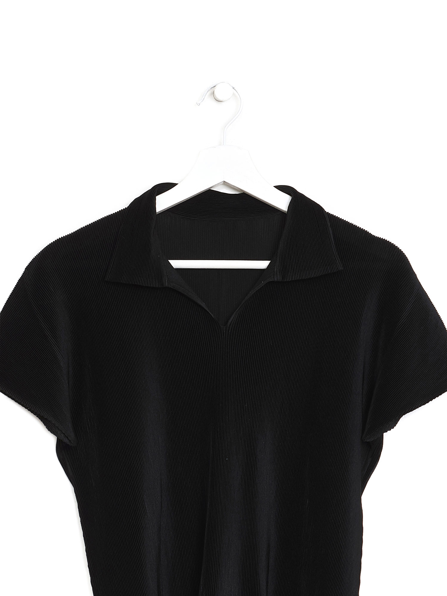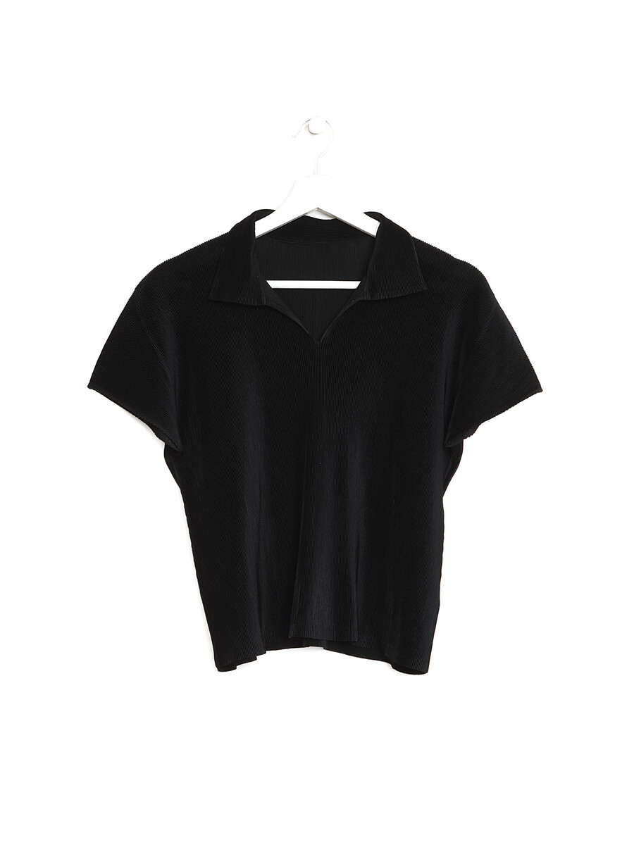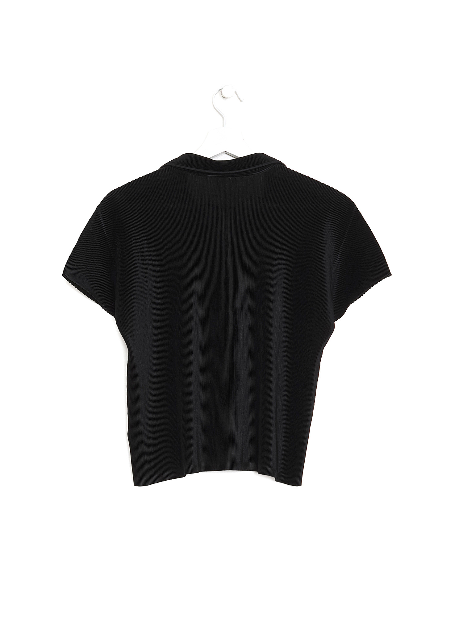 Short sleeve pleated polo shirt in black. Shirt collar with a button placket. All-over pleated design.