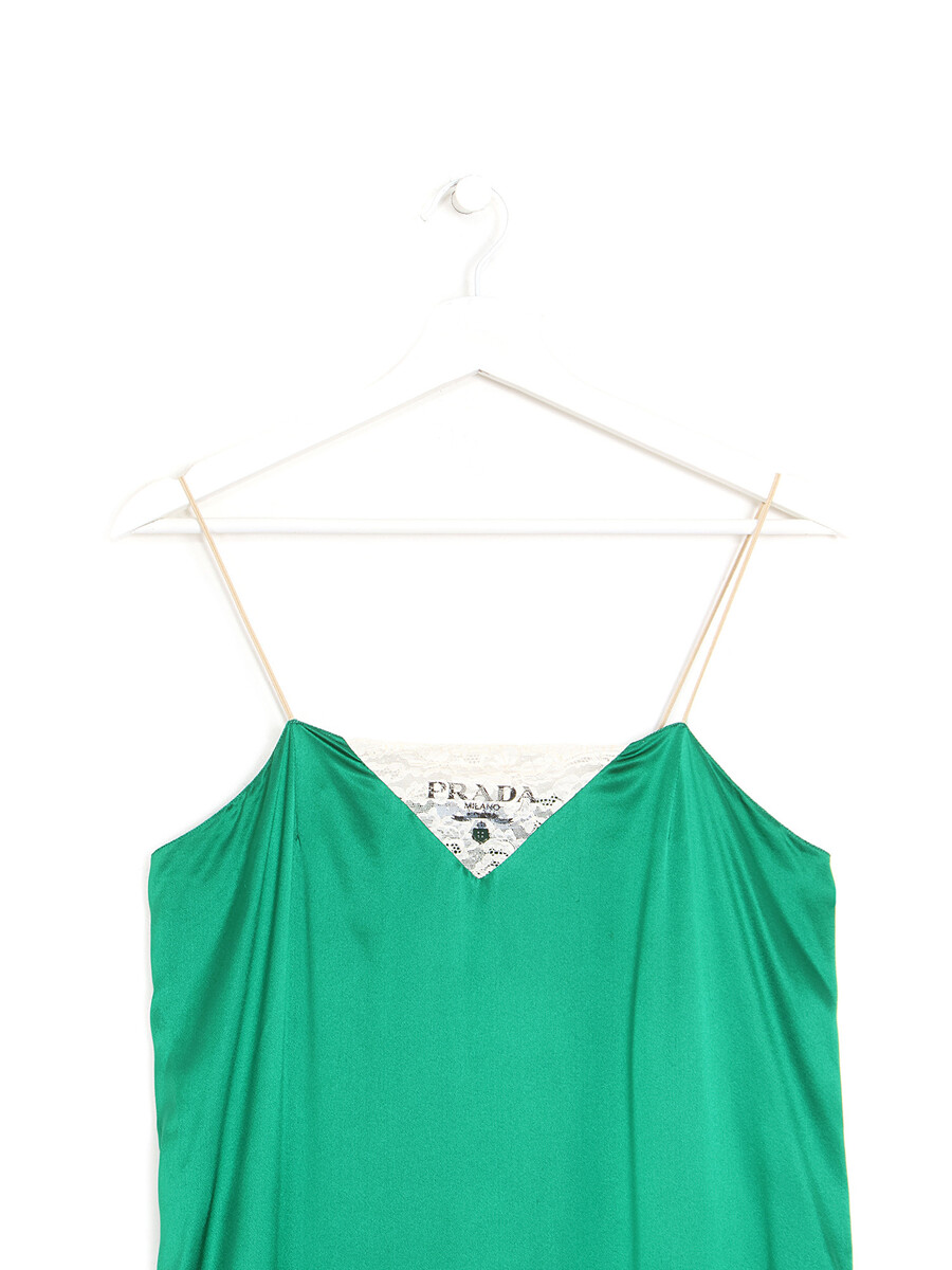 Sleeveless dress with delicate lace detailing in green. Iconic Prada logo motif at bust.