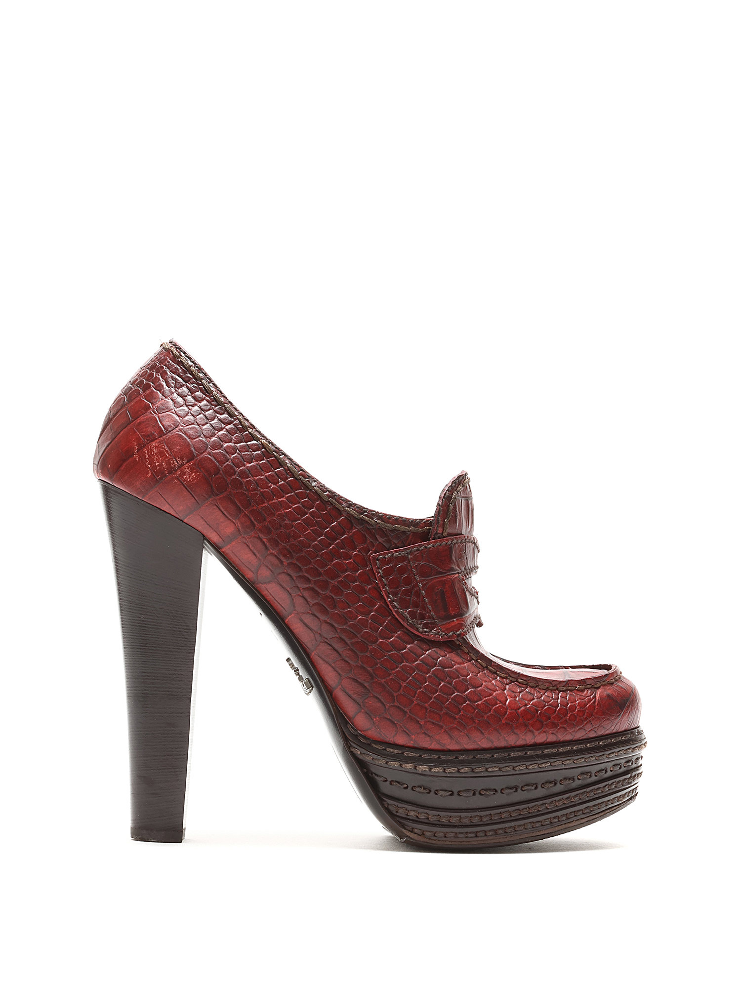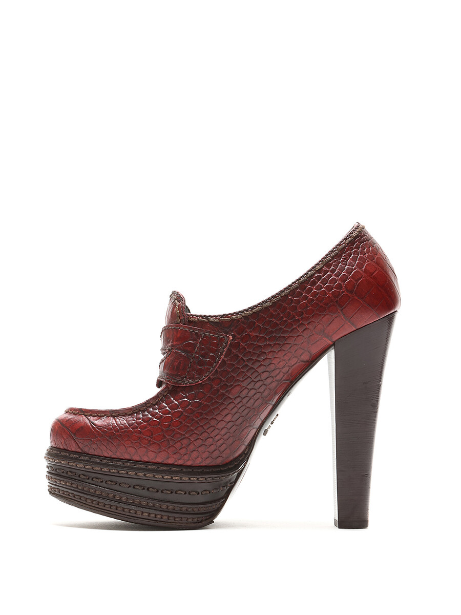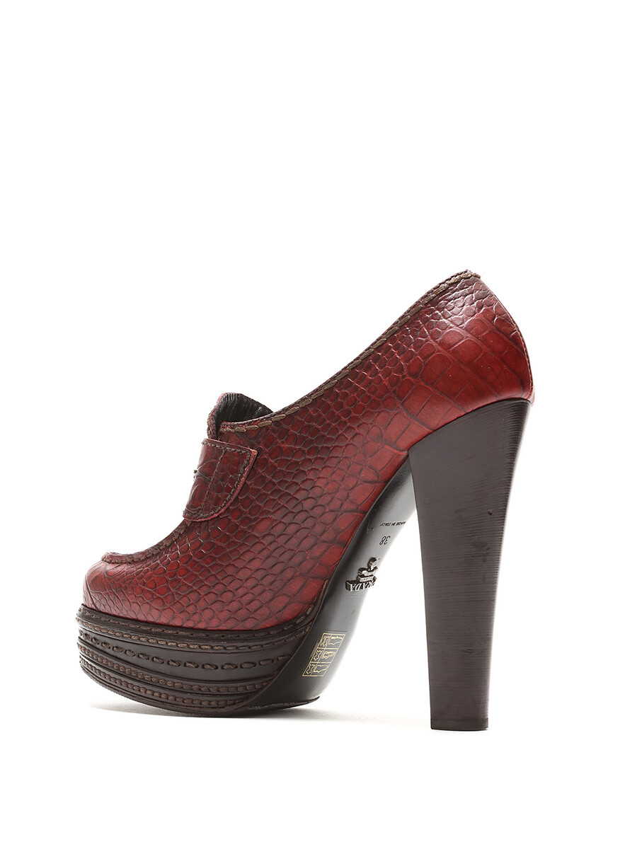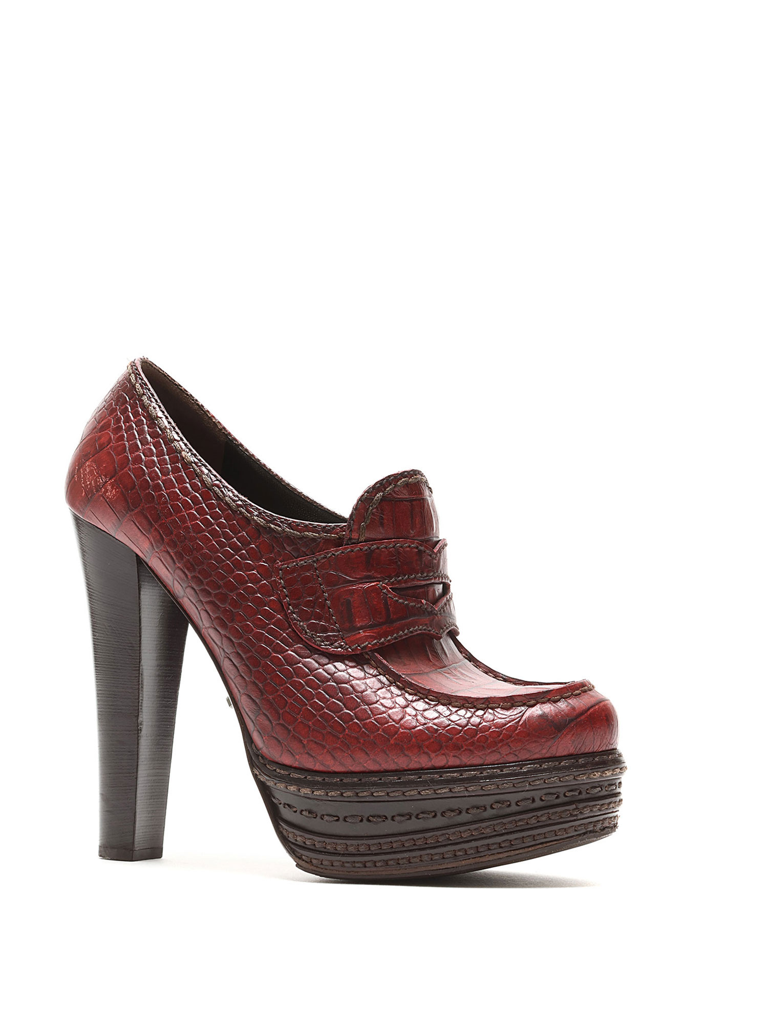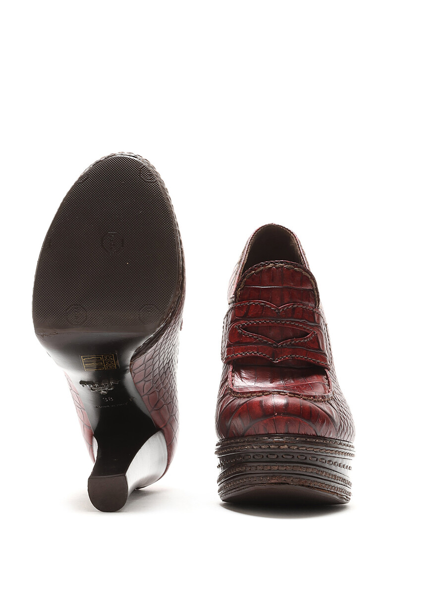 Croc-embossed leather heeled loafers in vibrant red. Round toe design with a luxurious leather sole.